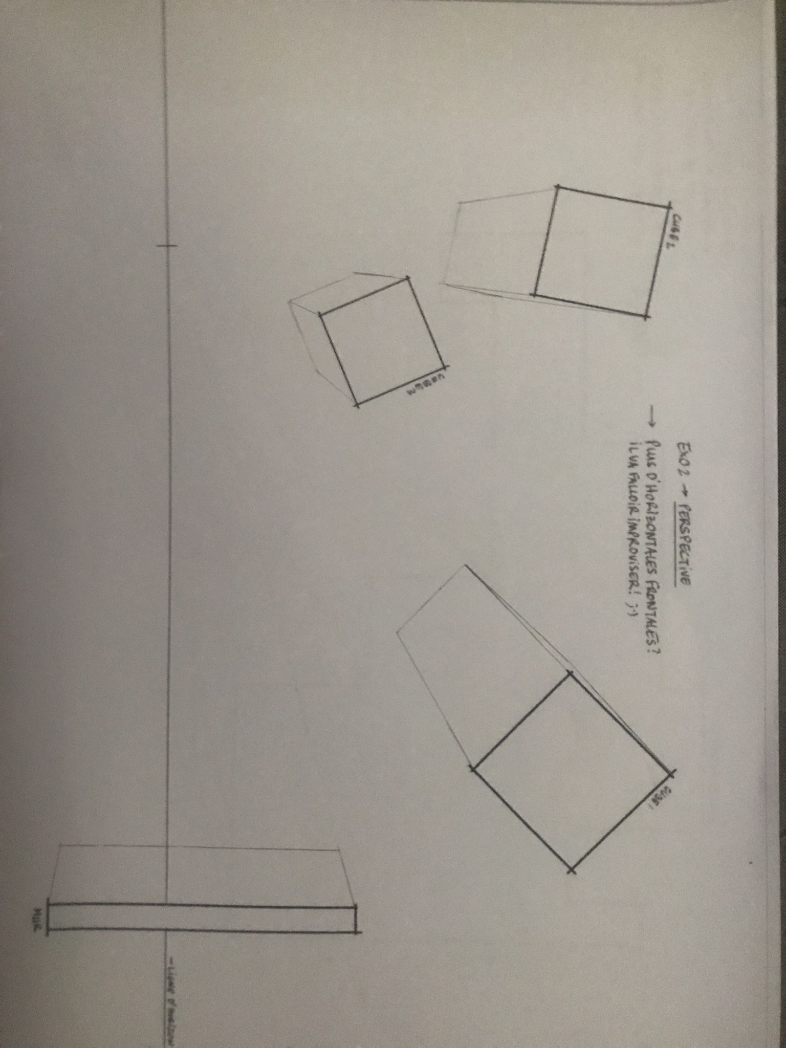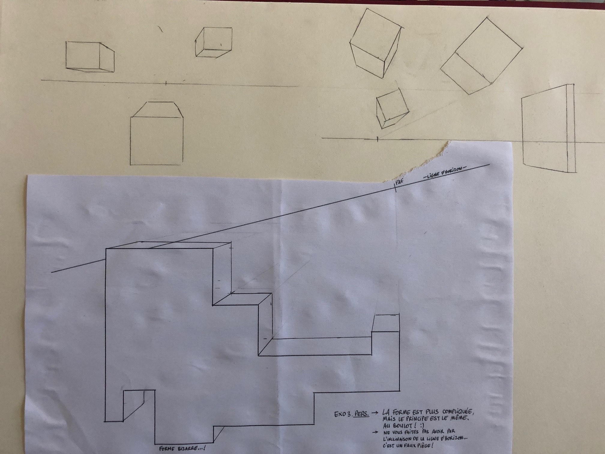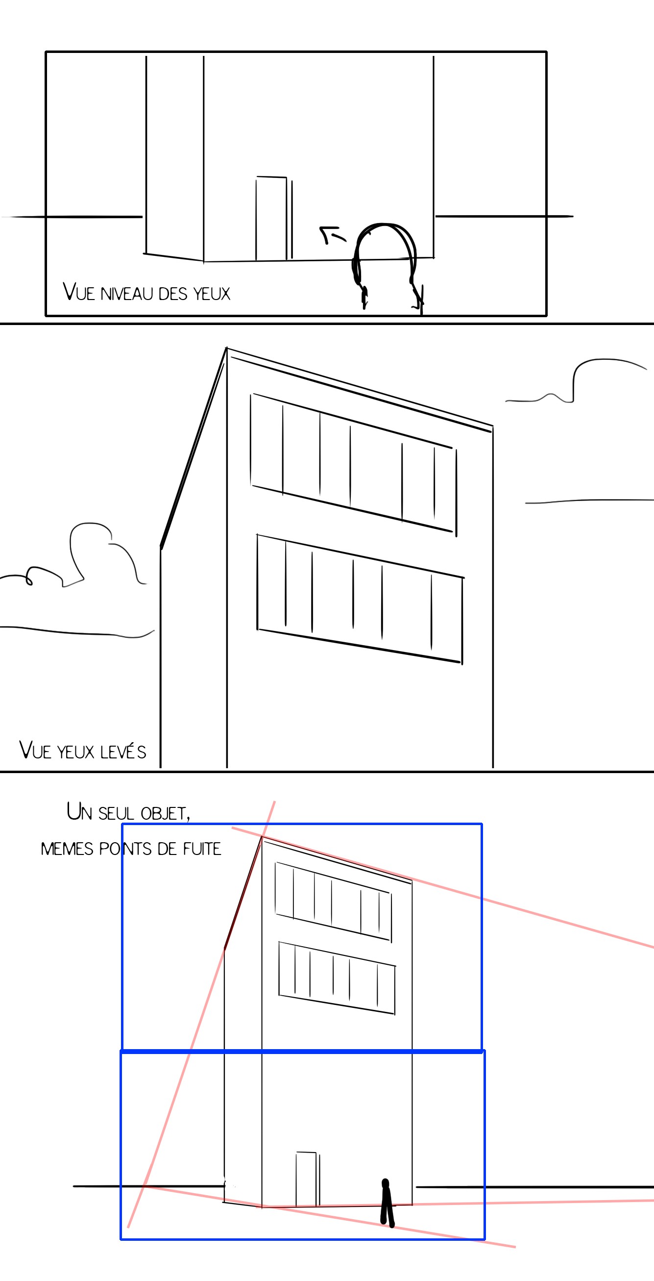 Par contre : Si tu regardes un objet situé à tes pieds, ses fuyantes iront toujours vers la ligne d'horizon en dehors de ton champ de vision. Si tu regardes un objet au-dessus de toi, ses fuyantes iront toujours vers la ligne d'horizon, située là encore en dehors de ton regard. Mais dans ces deux cas de figure, tu auras un troisième point de fuite. Celui-là ne dépendra effectivement pas de la ligne d'horizon et impactera les verticales de ton objet (qui ne seront donc plus verticales ^^). Mais les deux premiers points de fuite de tes objets sont toujours toujours sur la ligne d'horizon :3