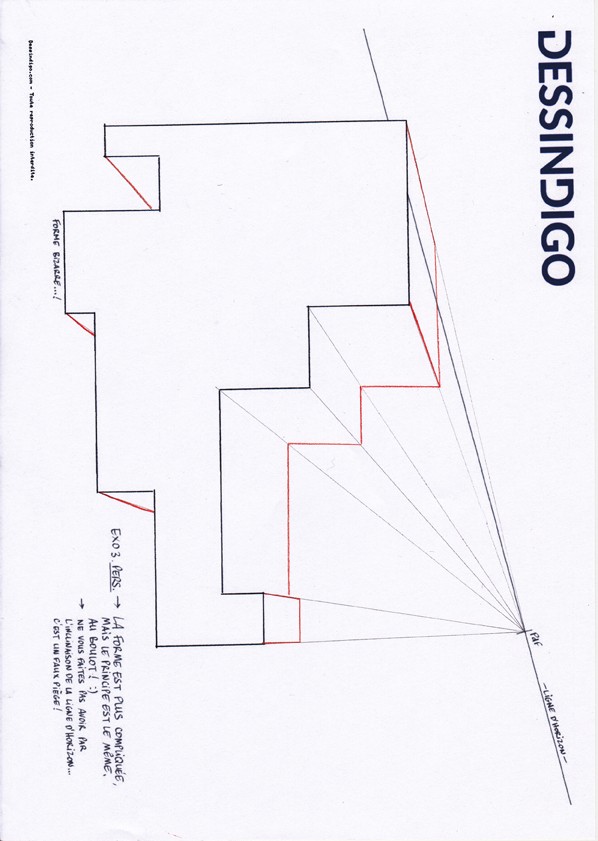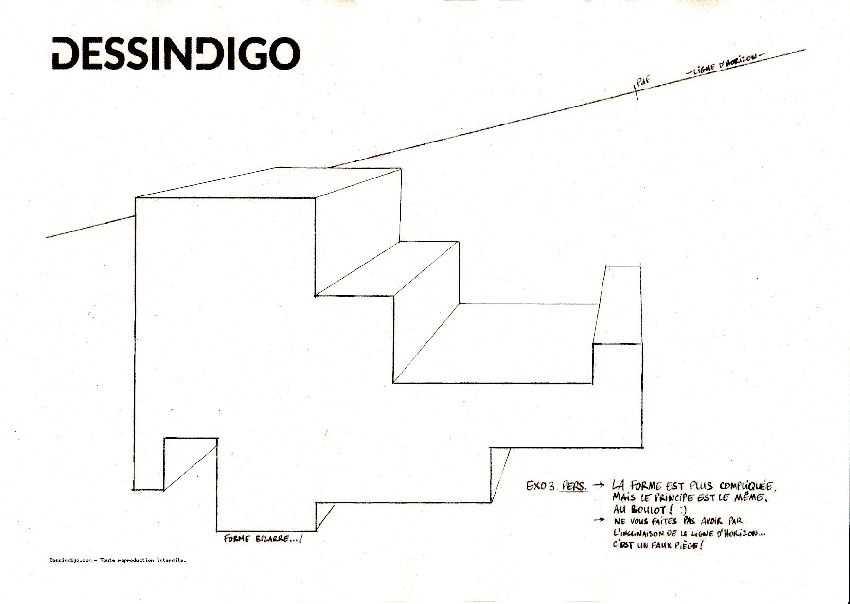 Sur le 3ème exo j'ai fait un 1er essai en pensant qu'il fallait modifier la ligne d'horizon ( je l'ai mise droite) et un 2 ème essai sans modifier la ligne d'horizon . Du coup j'ai compris que la ligne d'horizon, quelque soit son inclinaison correspond au niveau des yeux !!! Cours très explicite . Ils ont vraiment du s'éclater en 1415 quand ils ont découvert la perspective. Pour ma part je la découvre en 2018 et waouh !!!