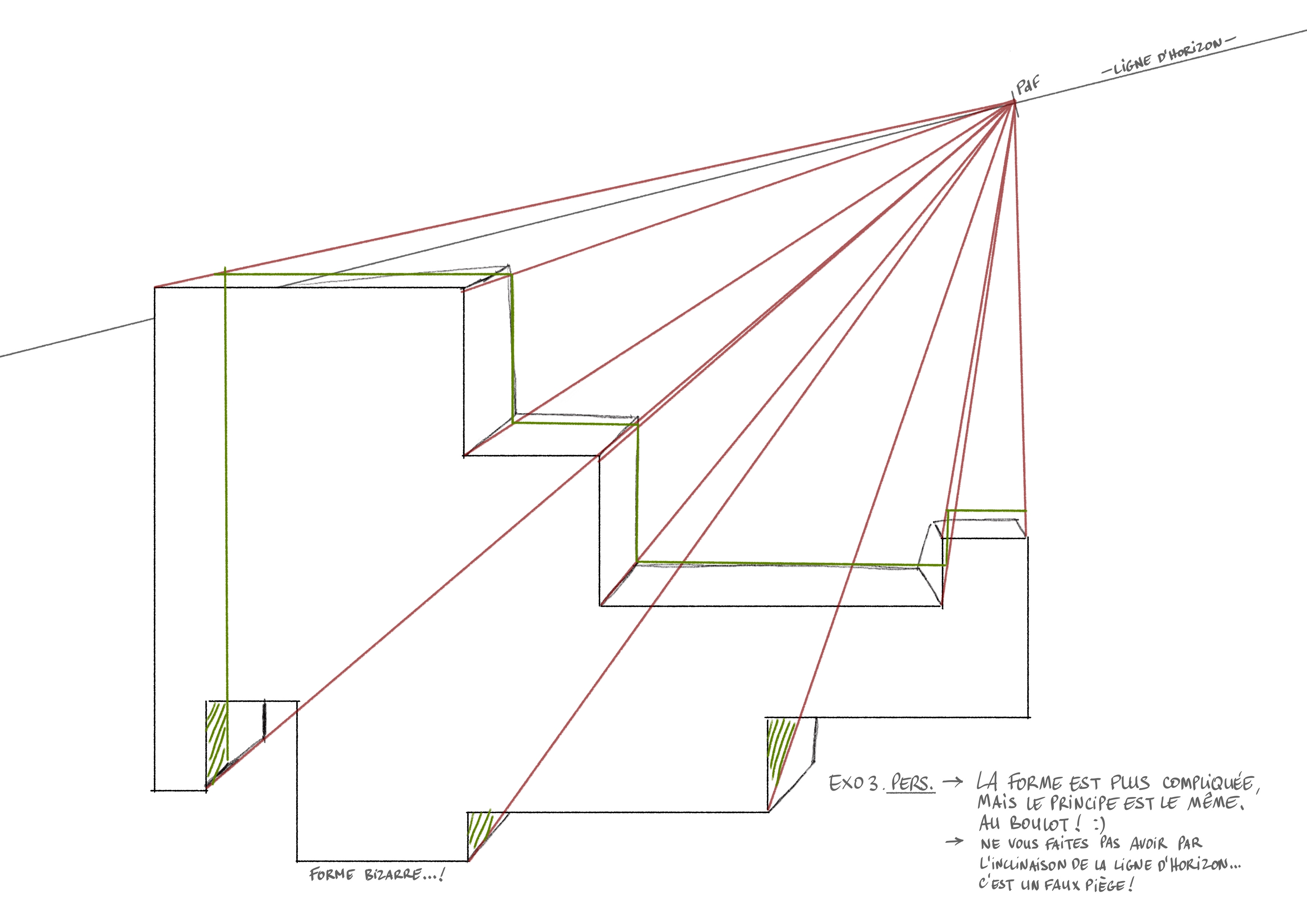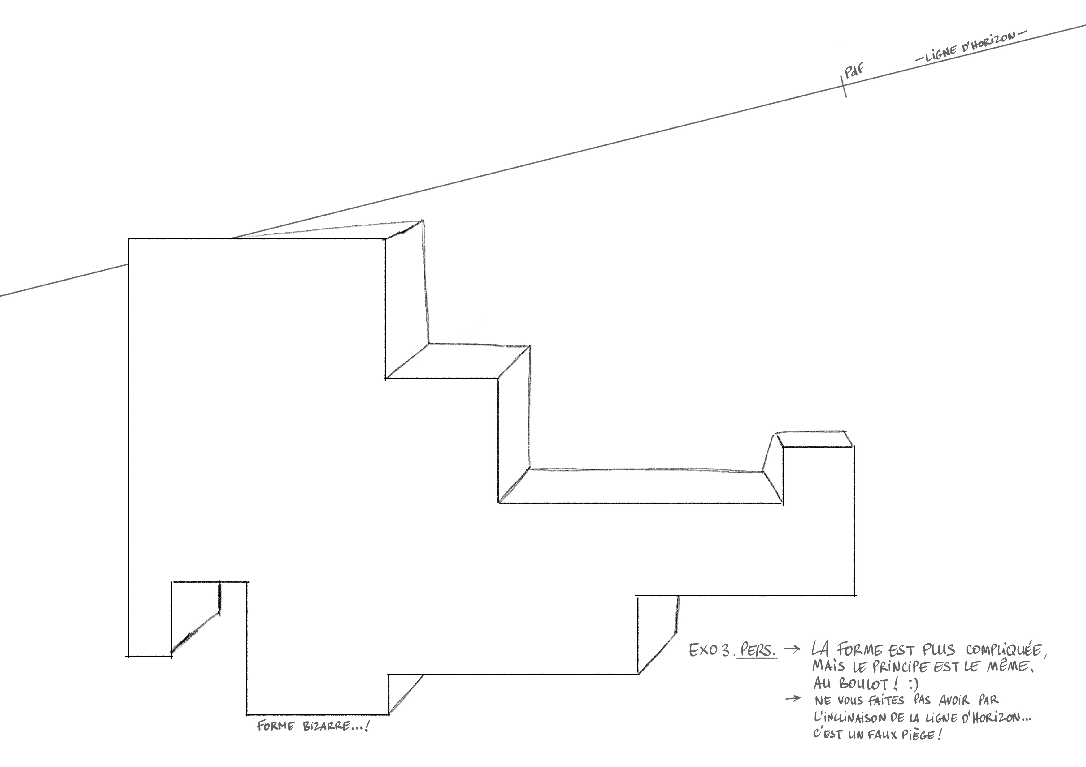 Bonjour CarolineSerre et désolé de cette longue attente! Attention, tes lignes de fuites ne suivent pas le point de fuite indiqué. Tu dois tiré tes lignes de fuites à partir des angles de ta forme pour rejoindre le même point de fuite, et ensuite placer les parallèles de ta forme. :)