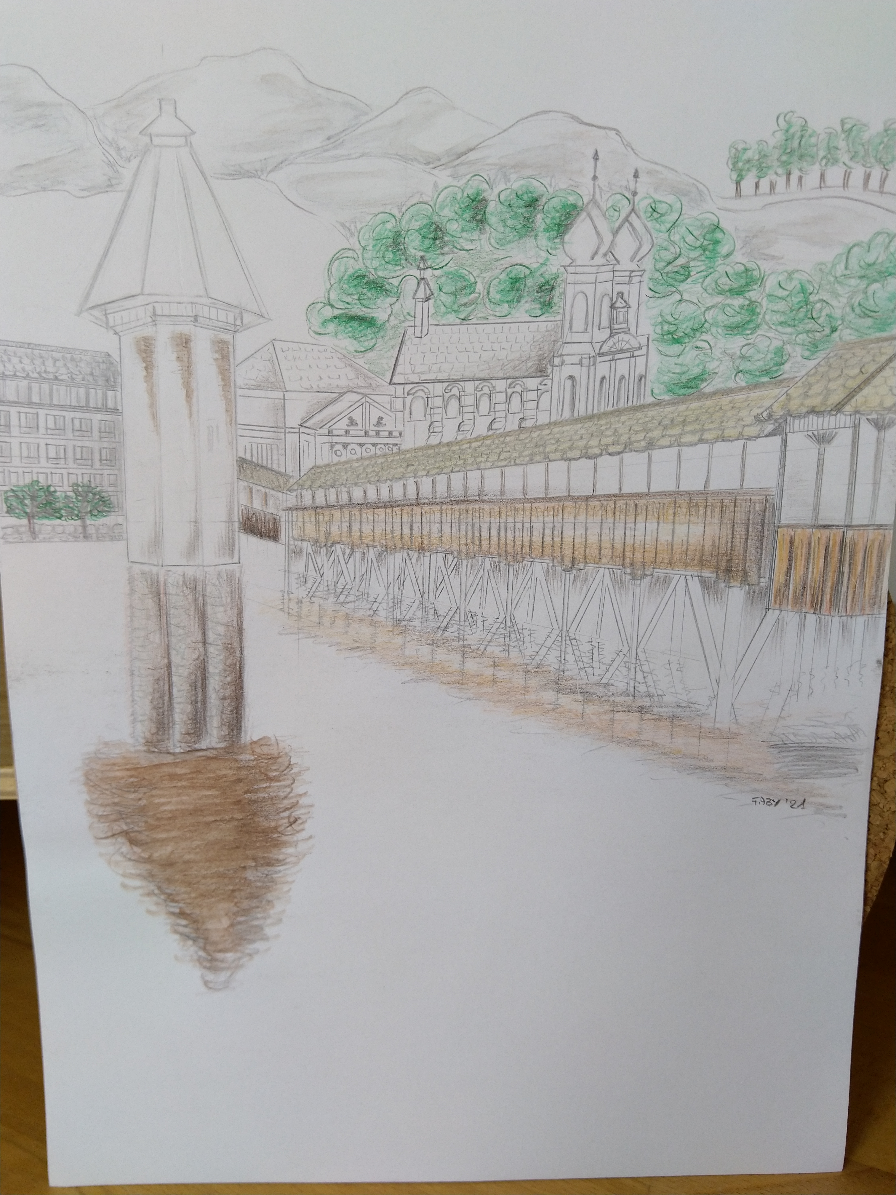 je voulais partager mon essai après avoir fait les exercices, on se tente un peu de perspective sur modèle photo, le joli pont de Lucerne :o)
