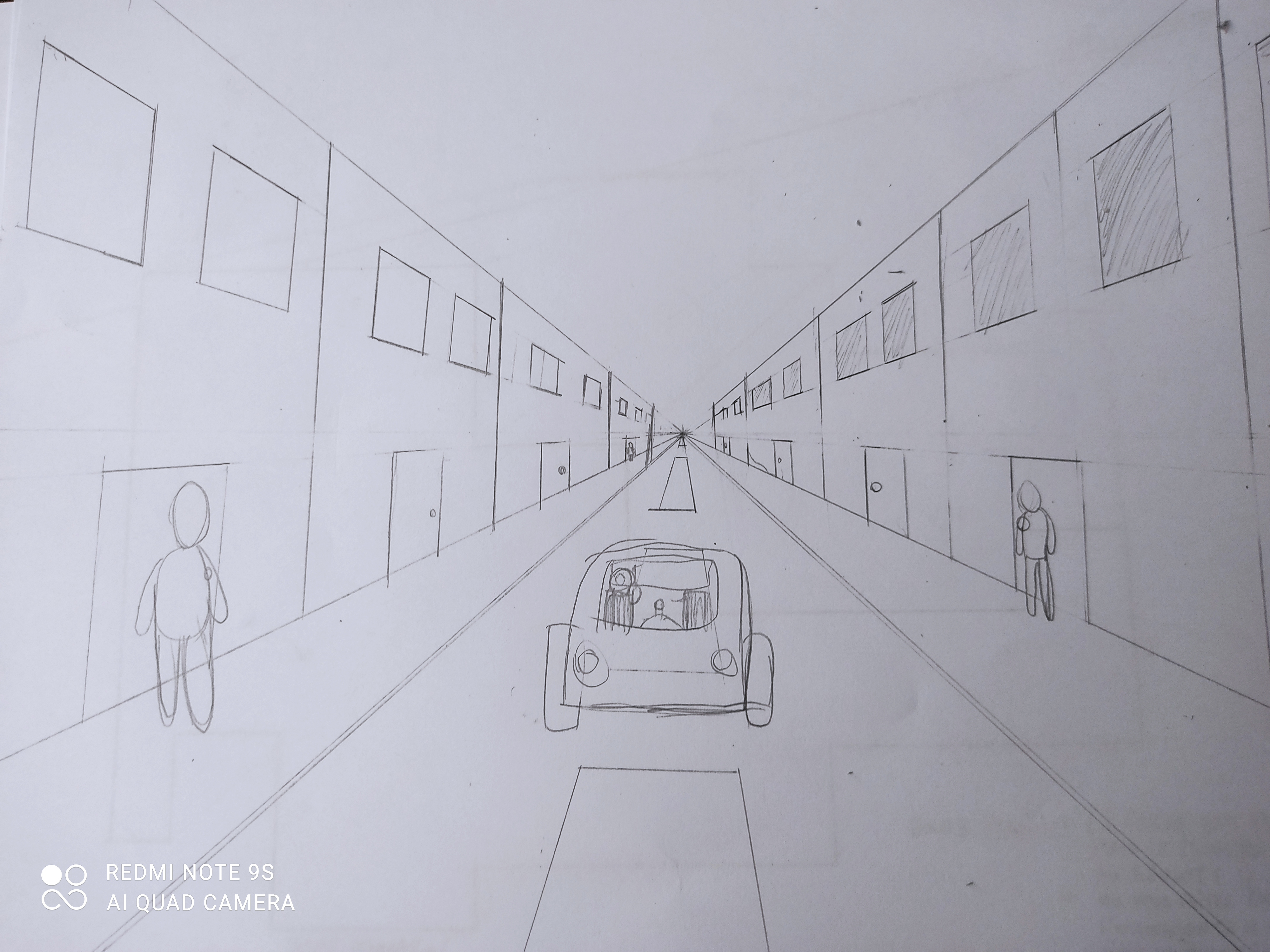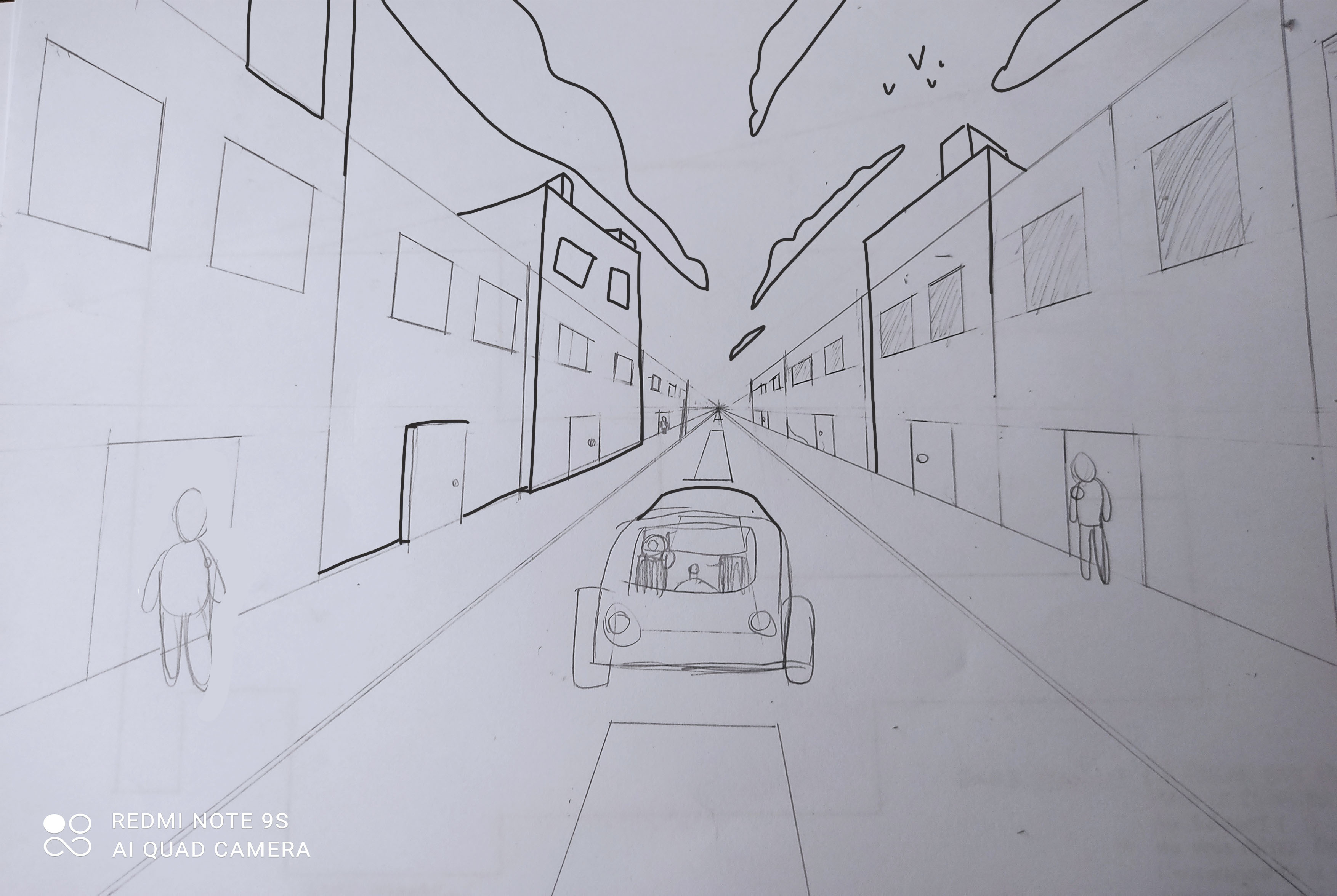 Bonjour Shinoobi ! C'est vraiment super d'avoir poussé l'exercice ! C'est bien, mais attention à tes proportions, la voiture est plus petite que les personnages par exemple, et il n'est pas vu en perspective (on devrait voir une partie du toit.) Tu aurais pu aussi faire des tailles différentes pour les immeubles, et ajouter du volume, comme ceci.