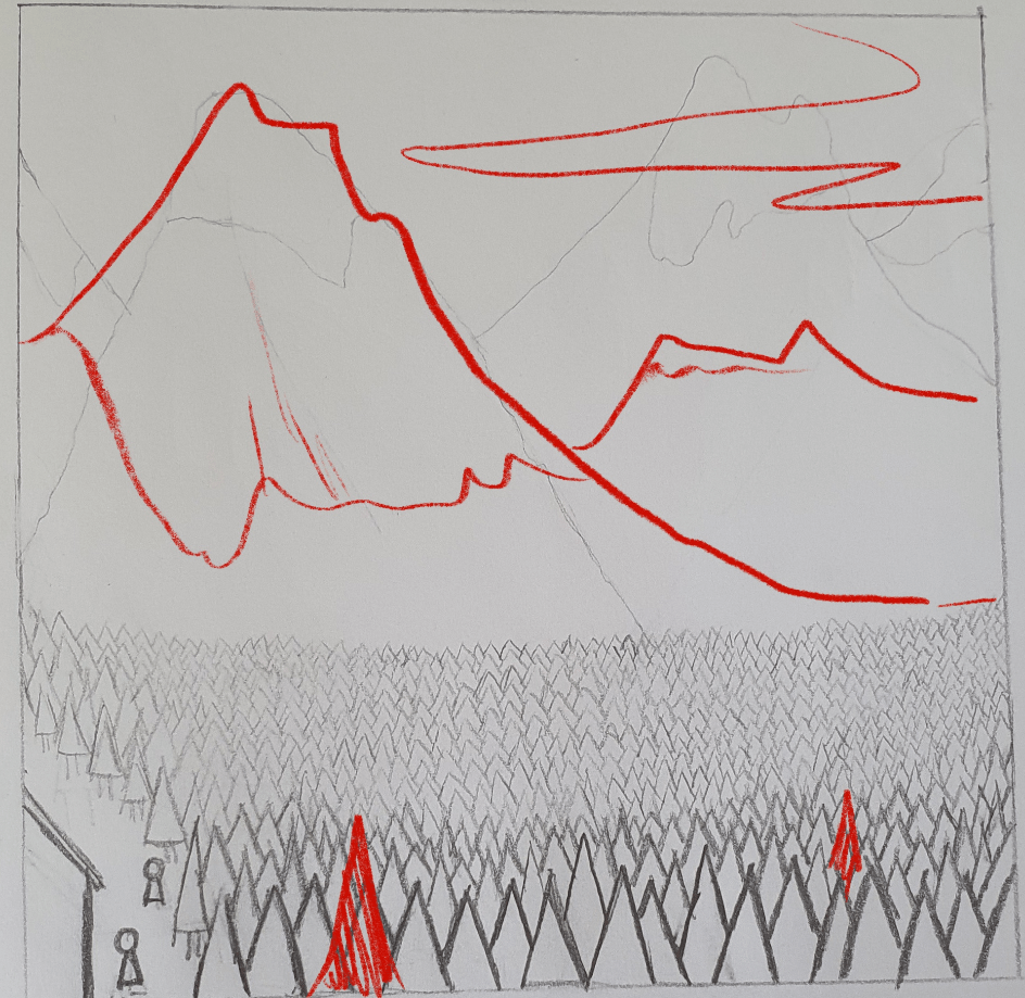 Pour le trait, je pensais à un chemin ou une rivière... un truc pour guider le regard vers le fond du dessin. Ce n'est qu'une suggestion comme ça !