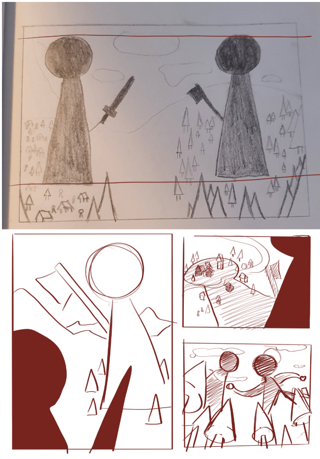 Alors, bel effort et c'est bien d'avoir essayé encore un coup, mais on est toujours sur un rendu très plat/statique, ton dessin est divisé en deux, au milieu, et très peu de choses différencient la droite de la gauche de ton dessin en terme de composition. Je t'ai fait des essais rapides sur des idées similaires mais avec d'autres angles de vues plus narratifs, histoire que tu comprennes un peu mieux de quoi je parle !