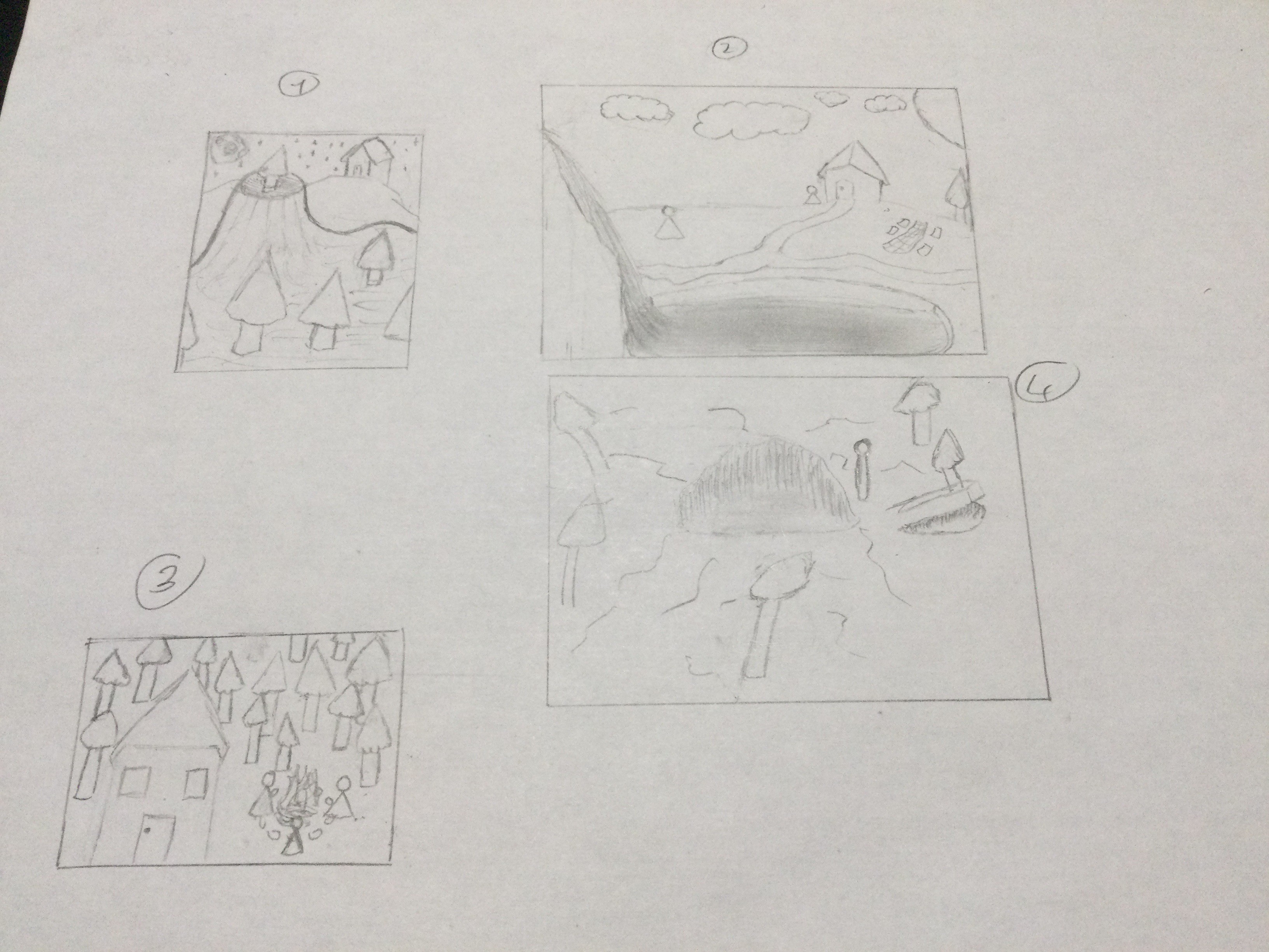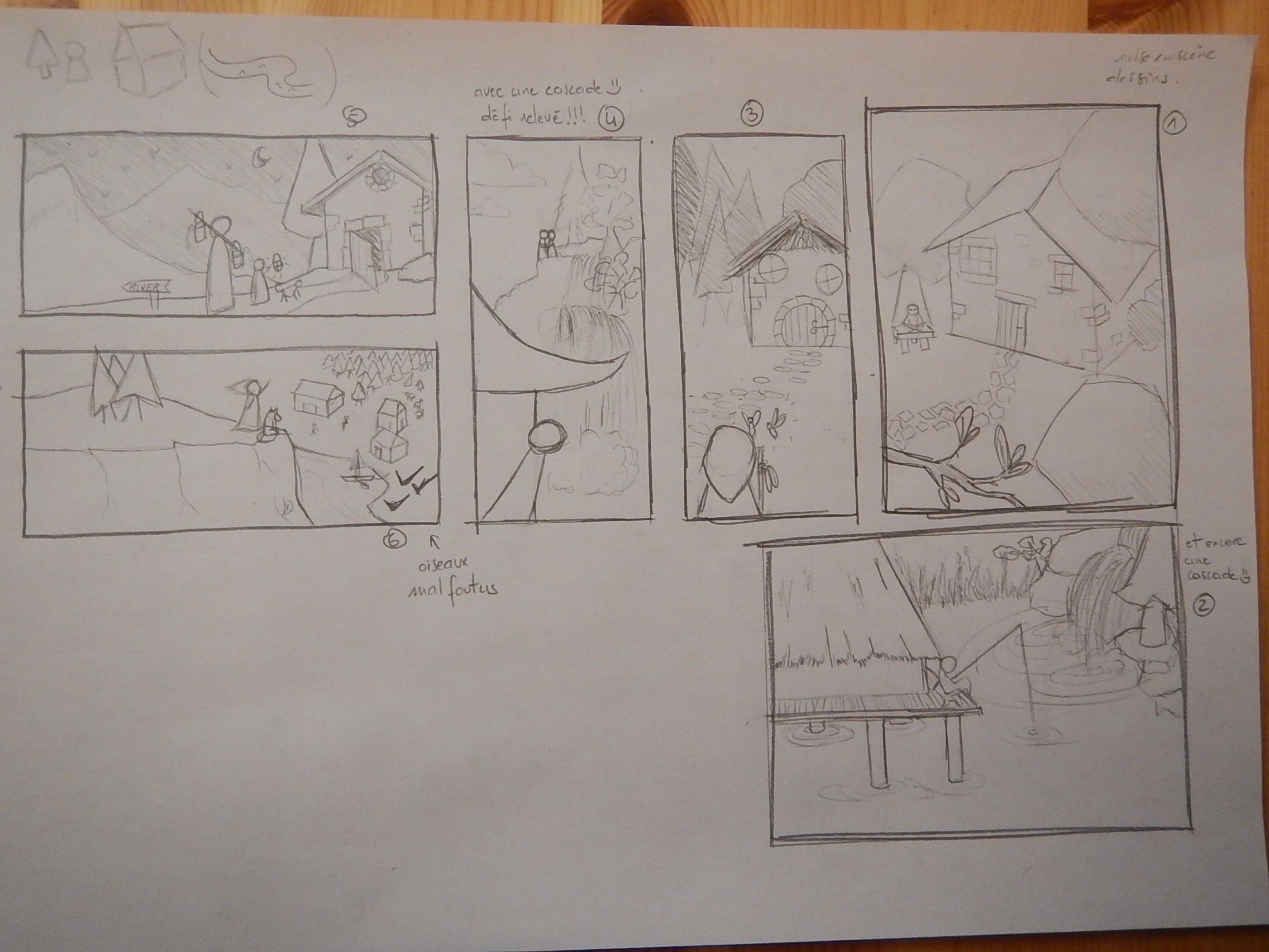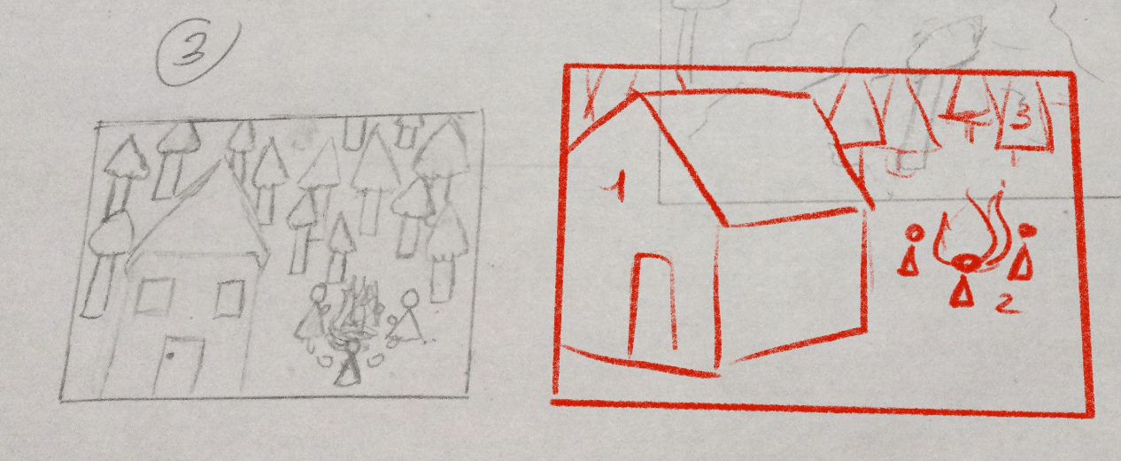 Quant à la quatrième...Mh... Elle ne raconte pas grand chose . (C'est un arbre couché à côté de la maison ?) Mettre des personnages allongés sur le toit et des ombres qui suggèrent une fin de journée c'est tout de suite plus narratif ! C'est une idée comme ça, mais tu sens la différence ?