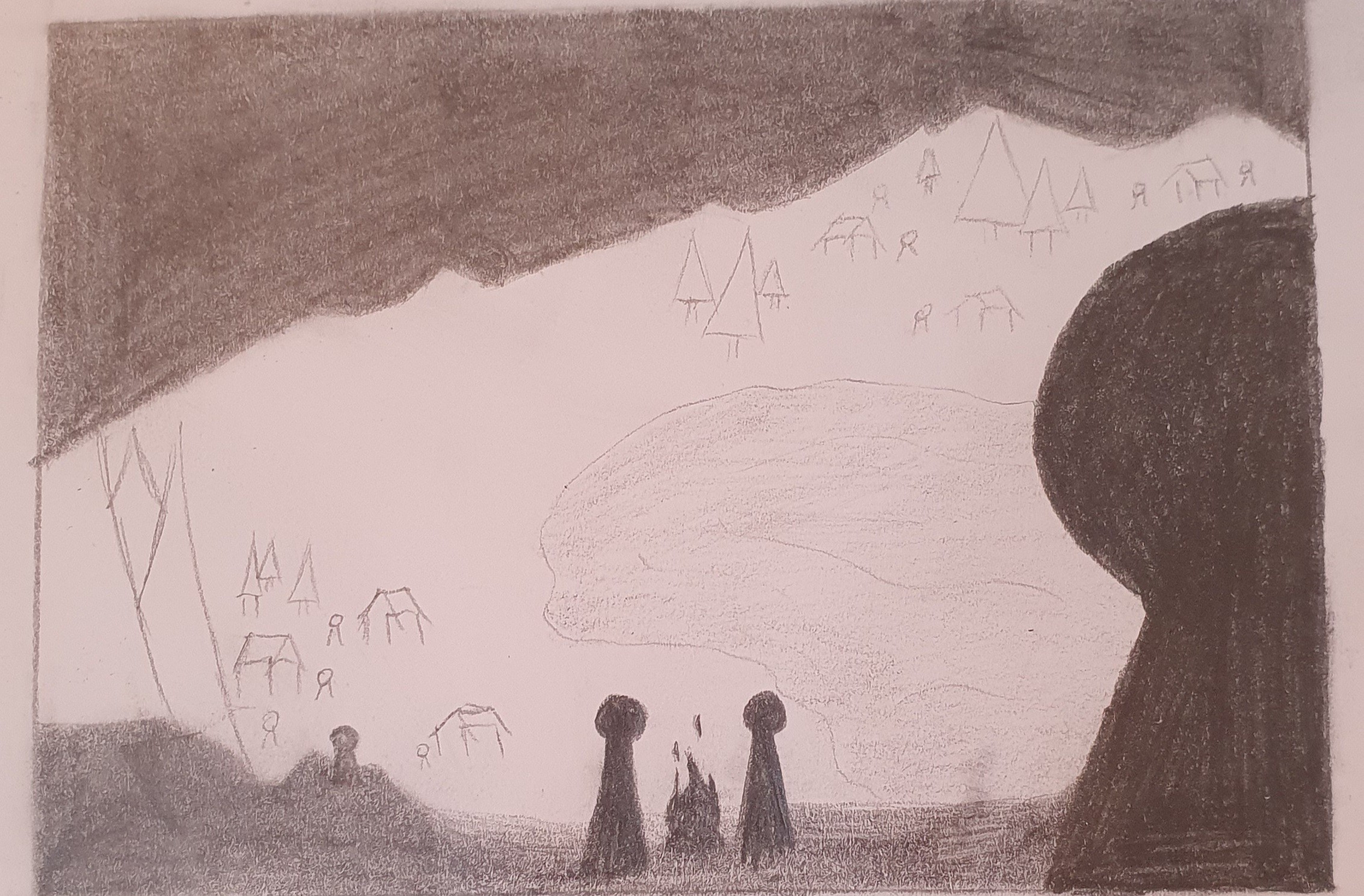 Bon on a un peu de mal à comprendre l'espace de ton dessin (c'est le toit d'une grotte ou le ciel en haut ?)