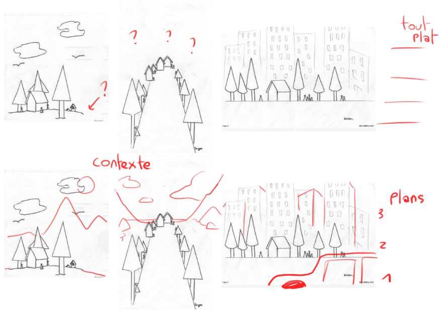 Par contre, je suis surtout gênée par le manque de profondeur de tes compositions, il y a très peu de volumes, on distingue mal les plans. C'est très flagrant sur la 3 où la maison est vue de face, et les arbres aussi, mais ils se déroulent en hauteur comme si c'était une vue aérienne... sur la 1 et la 4 c'est pareil, on a beaucoup de mal à différencier les plans.