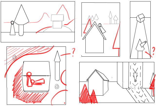 D'un point de vue composition pure ça fonctionne assez bien, à part peut-être la 4 qui est plus éparpillée. Il y a des petites maladresses, comme le fait de placer des éléments qui frôlent le bord de tes cadres un peu partout (maison dan la 1, arbres dans les autres), c'est à éviter !