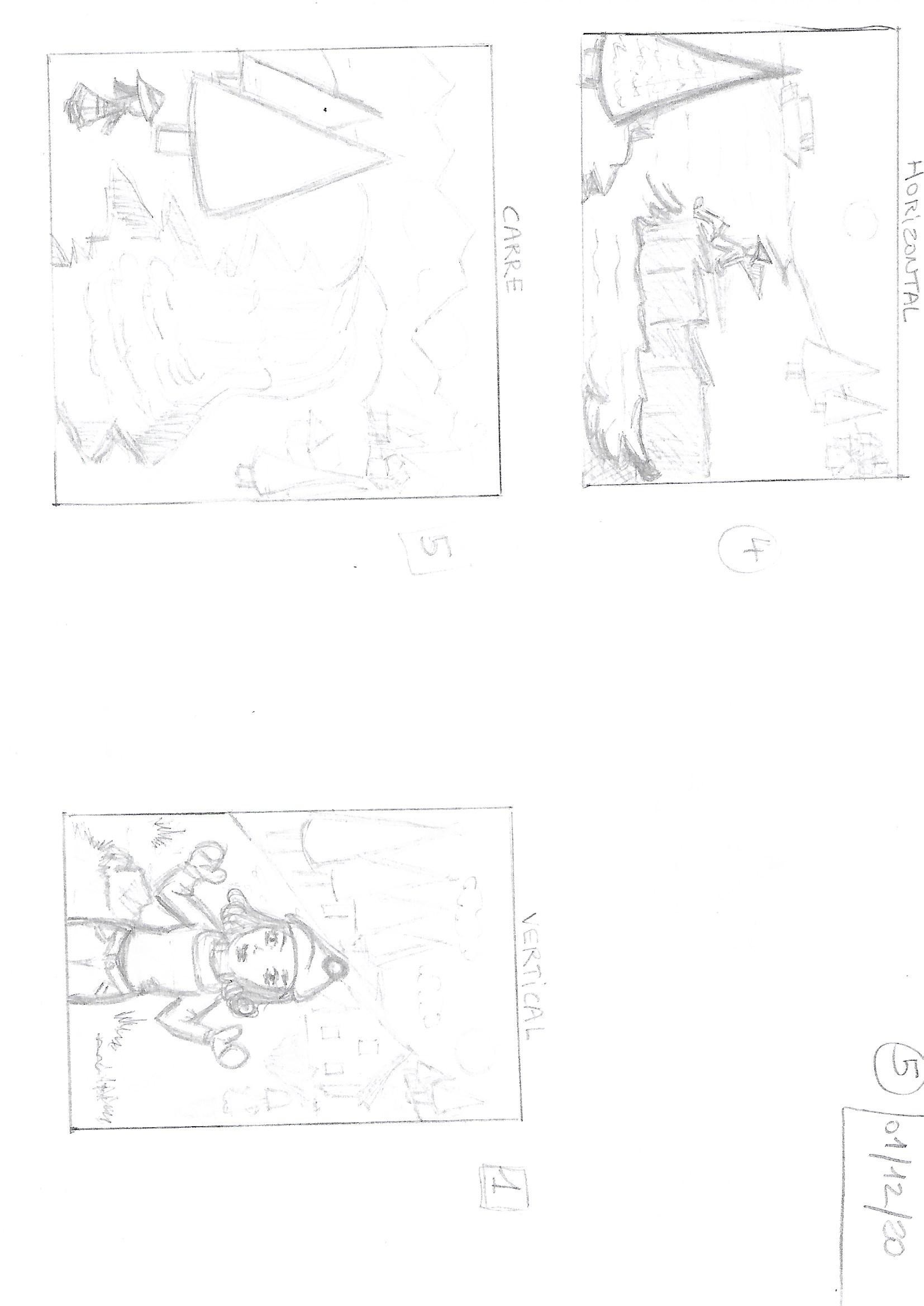 La 5 : Là encore les traits sont très clairs donc je ne vois pas bien, mais elle me semble moins intéressante que les autres, on ne sait pas trop où regarder... Il faudrait un ou deux points d'accroche dans l'image ! Là ton personnage st un peu coincé dans le coin inférieur gauche, il ne peut pas remplir ce rôle :(