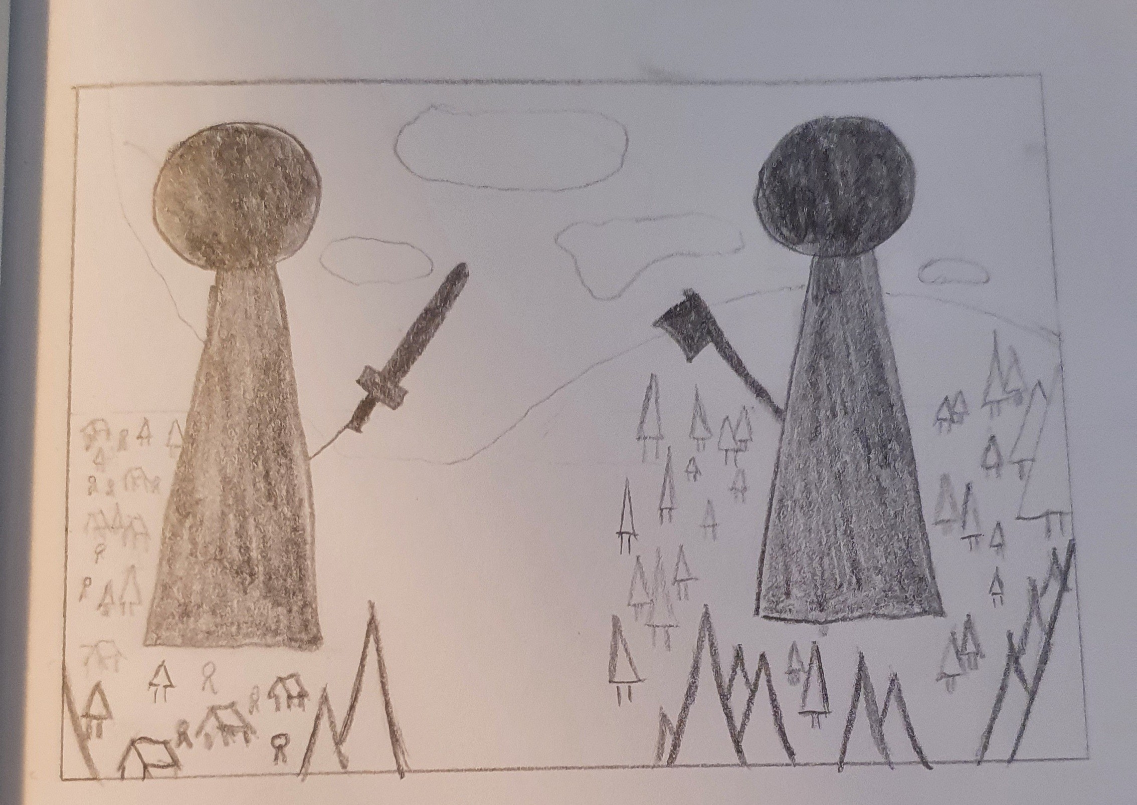 Donc voilà j'ai imaginé une scène avec 2 géants que j'ai mis en contraste, un qui protège un village et l'autre qui veut attaqué le village en venant d'une forêt voilà voilà j'espère que c'est mieux x)