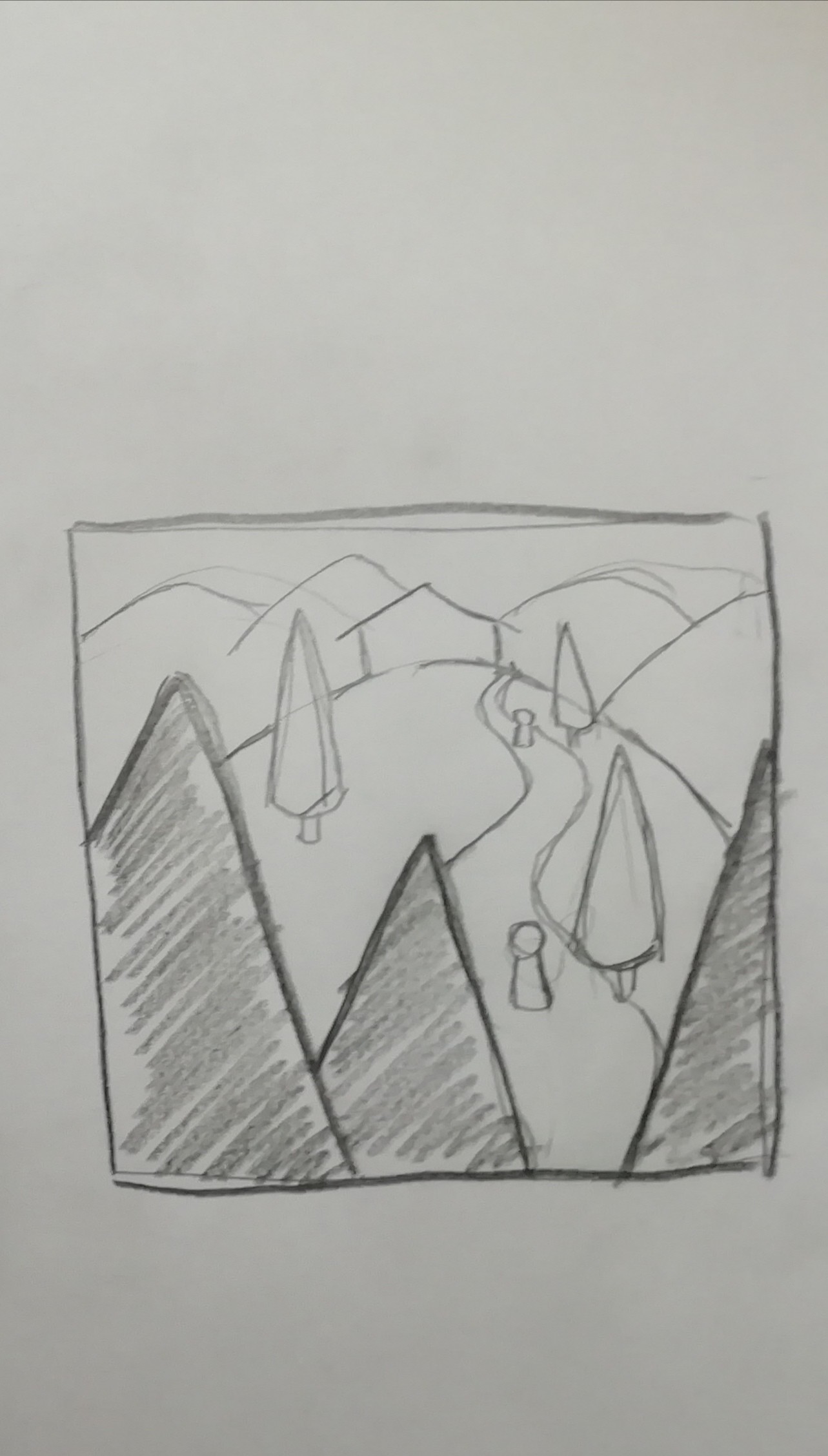 Cette compo est sympa, après je ne suis pas sûre de ce qu'apporte cette rangée justement (bon j'imagine qu'en vrai des des piliers ou quelque chose comme ça). J'aime beaucoup le placement du ravin (à mon avis c'est le nombre d'or et ça fait du bien à l'oeil). Ceci dit ce ciel tout coincé en haut donne un côté un peu oppressant, je ne sais pas si c'est voulu.