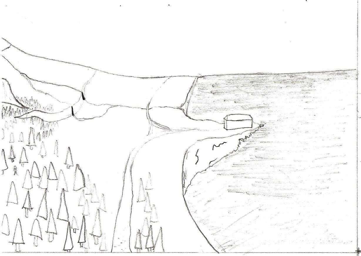 5) Il y a une route qui part du 1er plan, qui rejoint la maison et qui part sur la ligne d'horizon. Les 2 petits traits noirs verticaux sont des cascades, les traits qui en découlent sont donc des cours d'eau. Sur la pointe surplombant la mer, il y a une maison a une 50aine de mètres d'altitude. Oui, ce n'est pas très bien représenté ^^'
