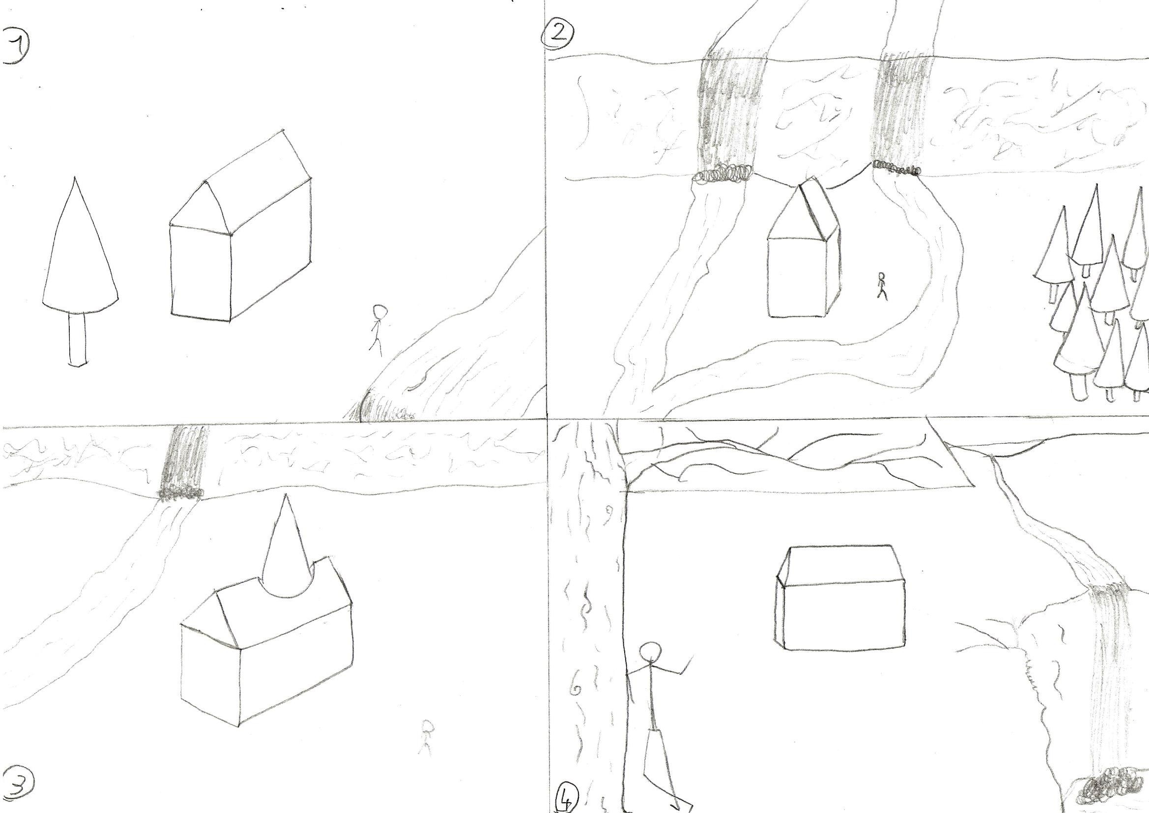 images, a savoir le bonhomme, la maison, le sapin, la rivière et la cascade.