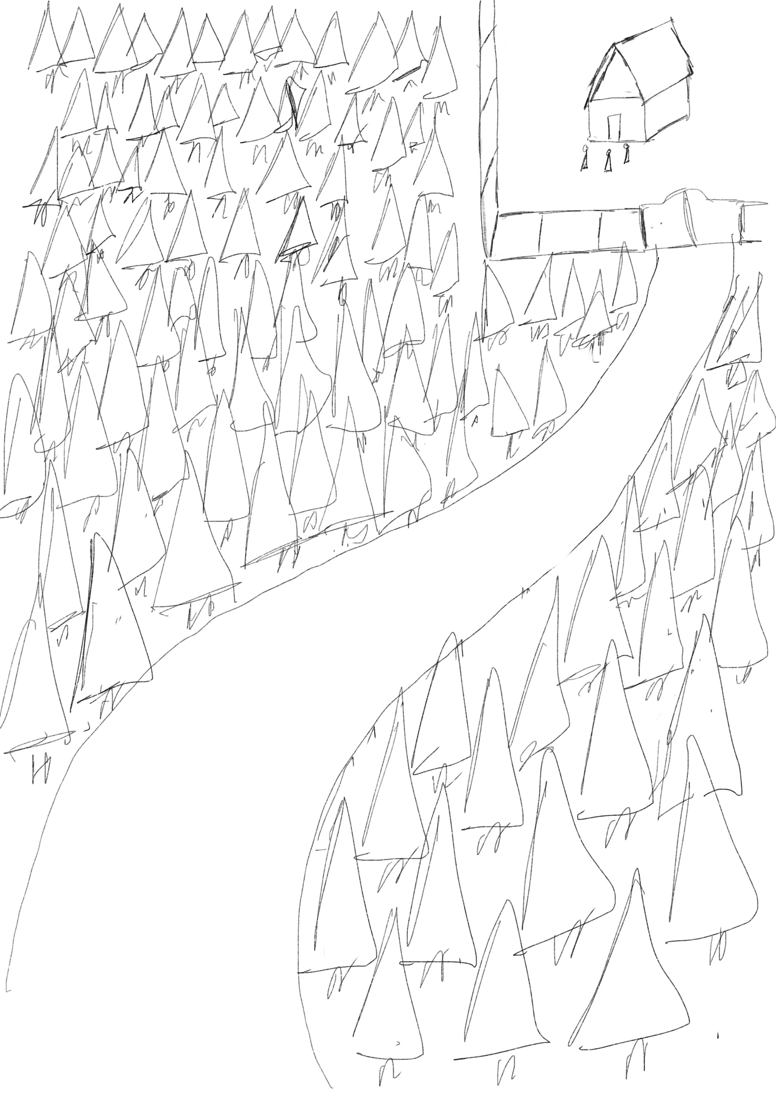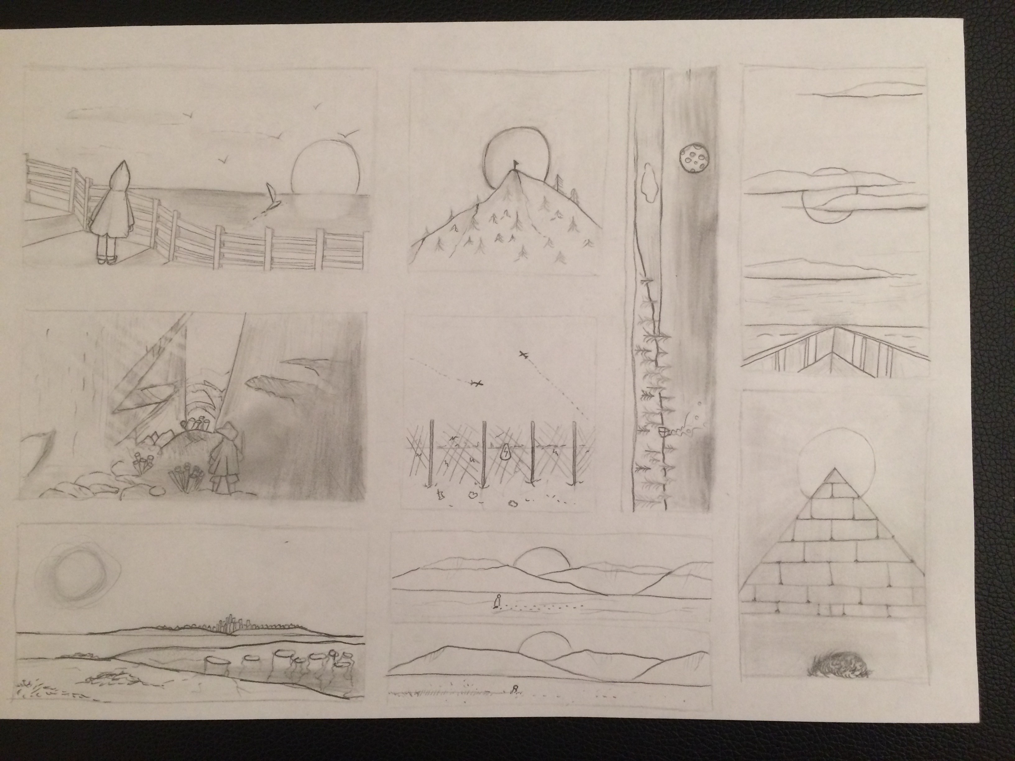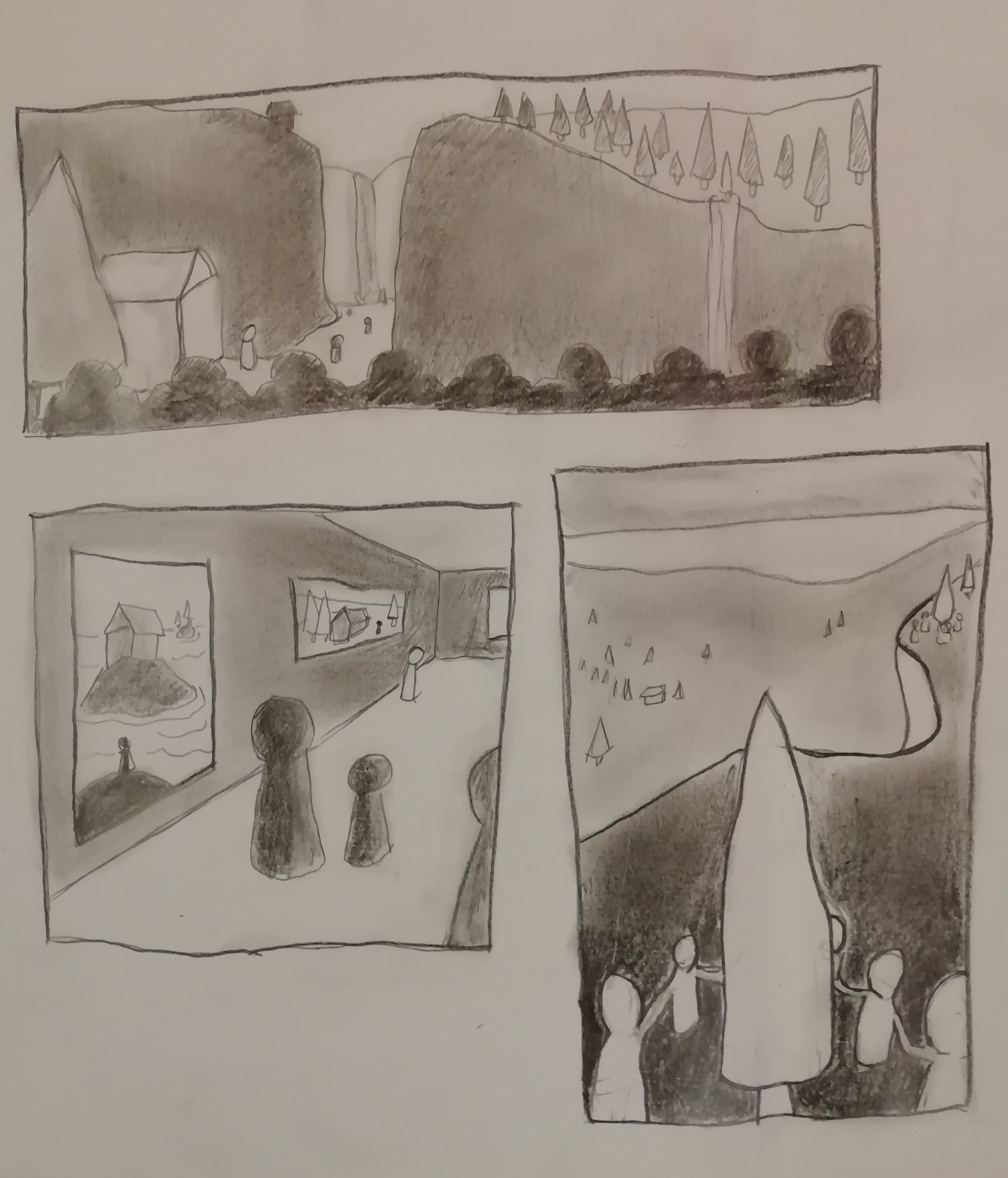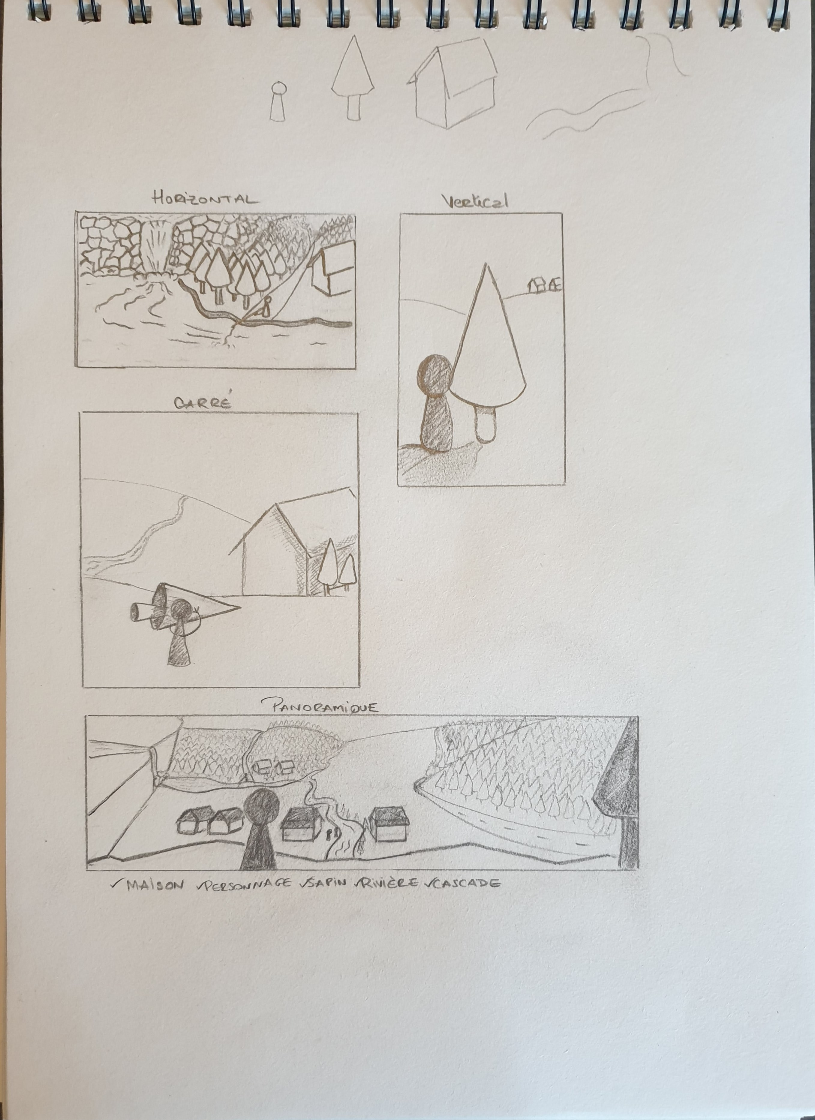 J'ai réalisé en 2e, le panoramique et j'ai voulu mettre en 1er plan un personnage qui voit du haut d'une falaise. Au vu du format il a fallu remplir l'espace, je suis aller au plus simple et j'ai combler l'espace par des sapins!