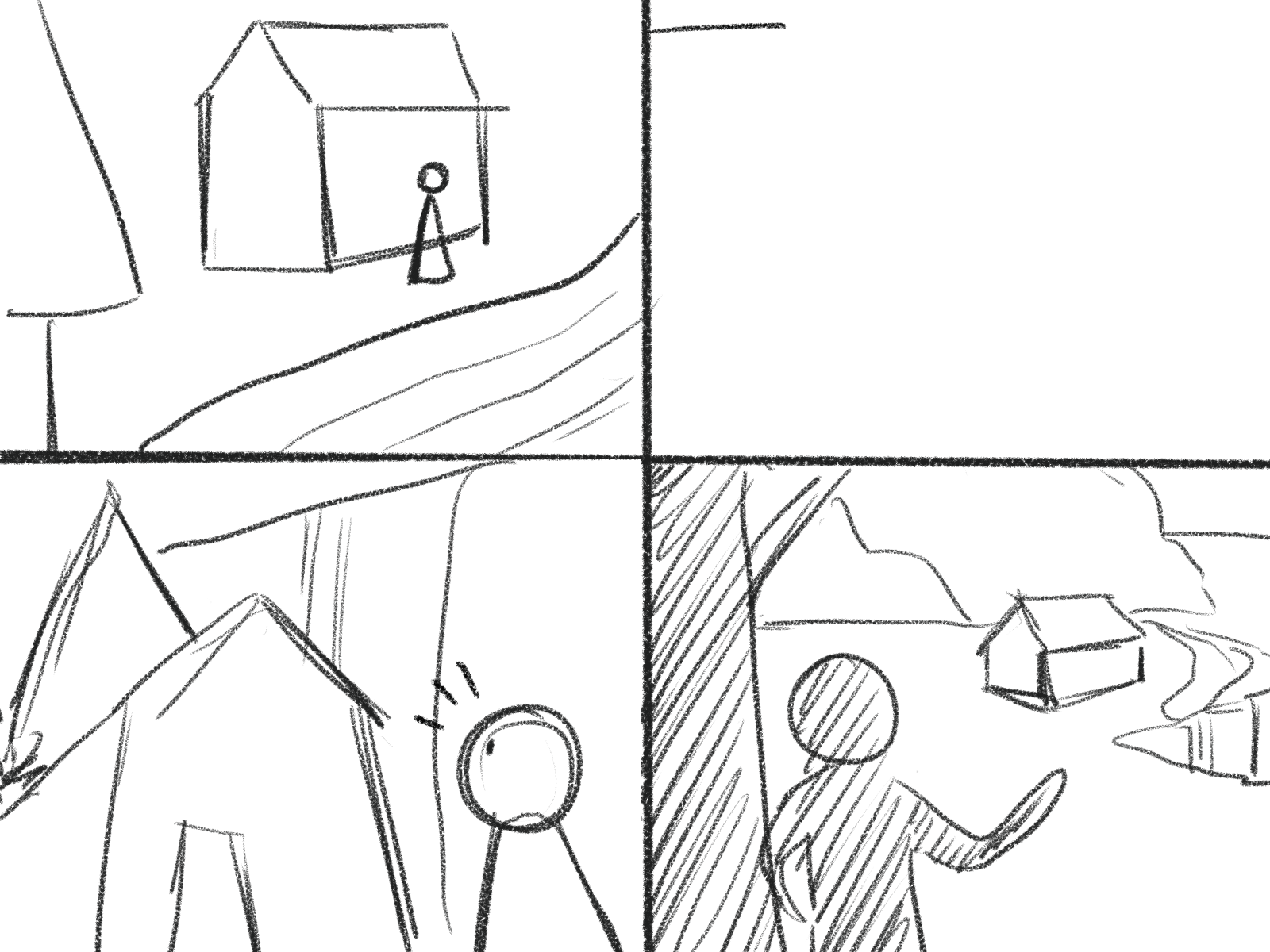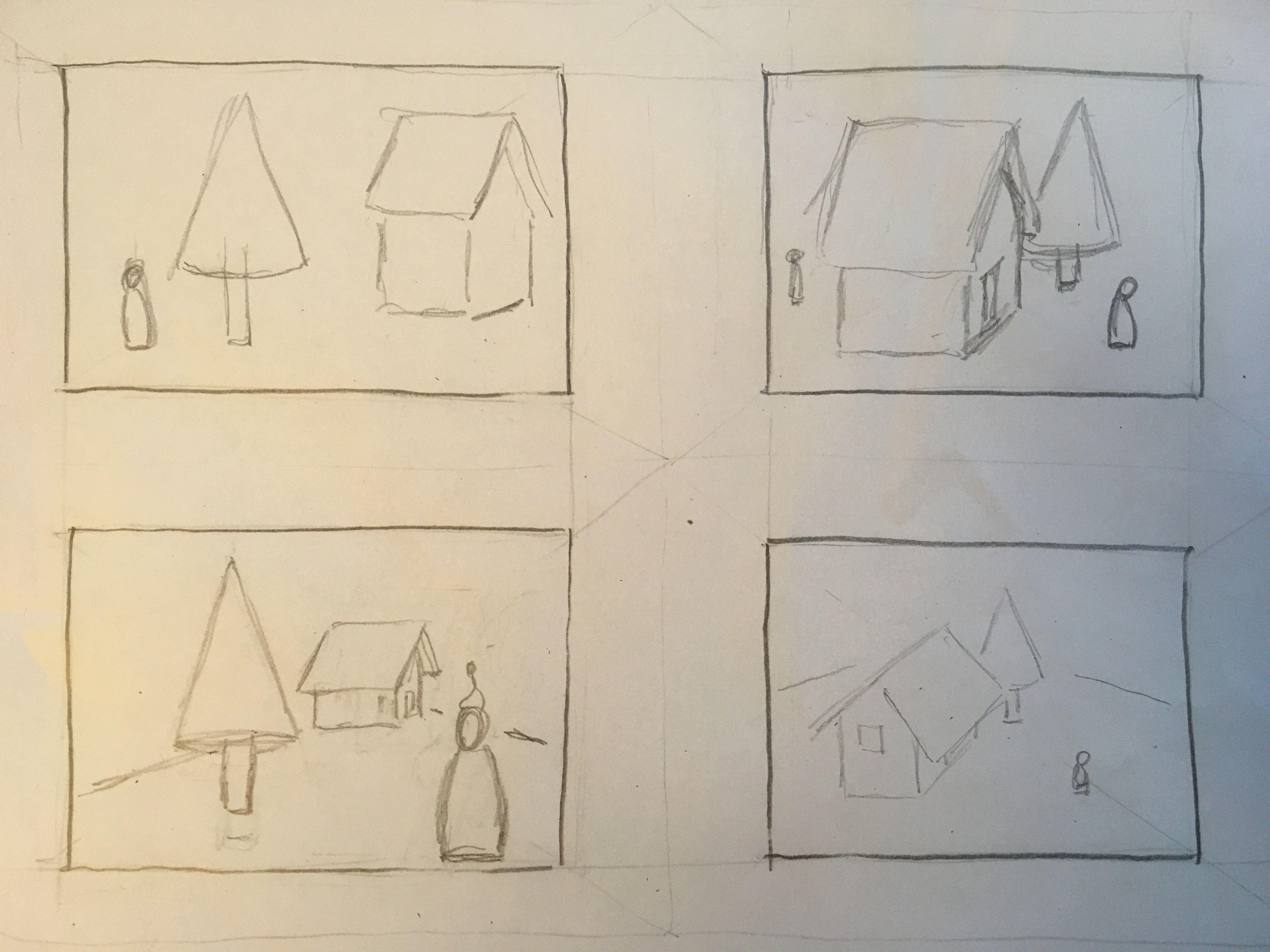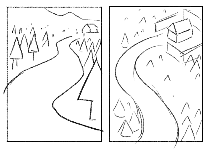 Le 3eme est vachement mieux d'un point de vue compo même s'il y a un souci de perspective. Le chemin conduit le regard vers la maison de manière assez évident mais ça fonctionne. Mais tu mélanges une vue de dessus avec une vue en perspective et ça fait buguer les yeux 😆 Je te joins 2 manières de représenter ta scène plus justes ^^ A gauche un point de vue plus narratif (en perspective) et à droite un point de vue plus global/aérien.