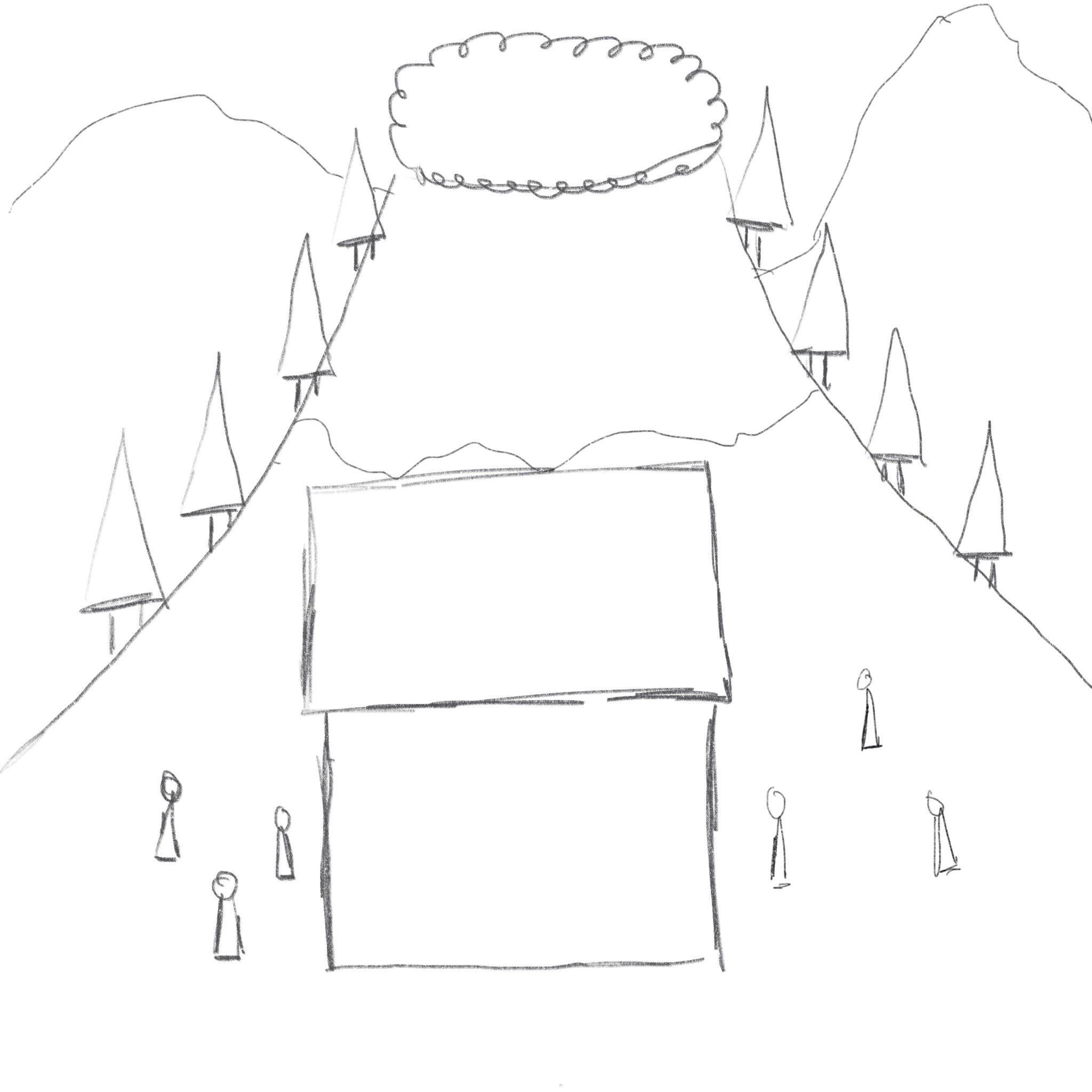 Sur ton premier dessin, c'est un peu étrange la manière dont les éléments sont positionnés... Ces arbres pile à plan de montagne/volcan , de manière bien symétrique, on a du mal à imaginer ça en volume. De plus, la composition symétrique n'a pas l'air justifiée par un sens quelconque (les symétries c'est très "fort" visuellement donc en général on les utilise pour évoquer quelque chose : un point central important, une dualité, un contraste... bref)