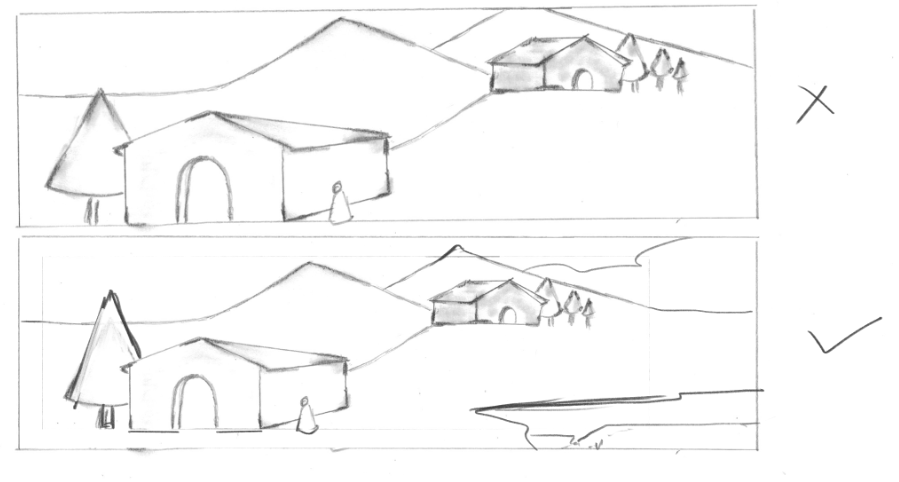 Les autres c'est moins ça, tes éléments ne sont peut-être pas assez hierarchisés (t'es tu demandé où tu voulais qu'on regarde sur ta composition ?) Celle a droite aurait pu être bien mais la colline du fond qui est parallèle à la ligne du toit et qui est très proche, ça casse toute la profondeur de l'image. Je te joins un petit redraw qui j'espère te mettra en évidence comment améliorer la compo en changeant des toutes petites choses ^^
