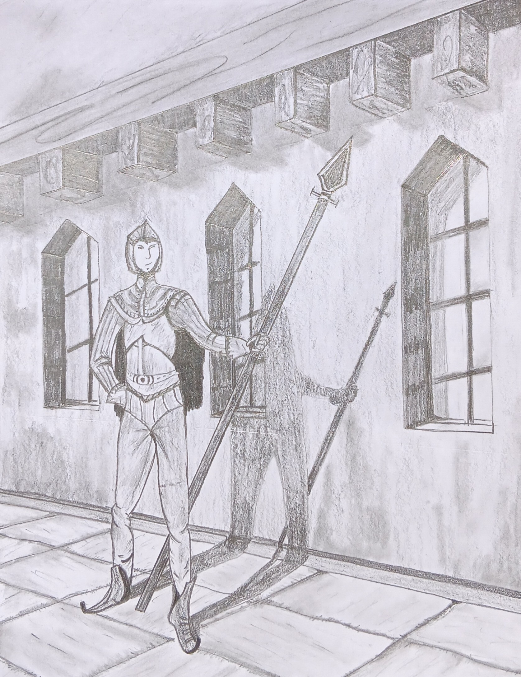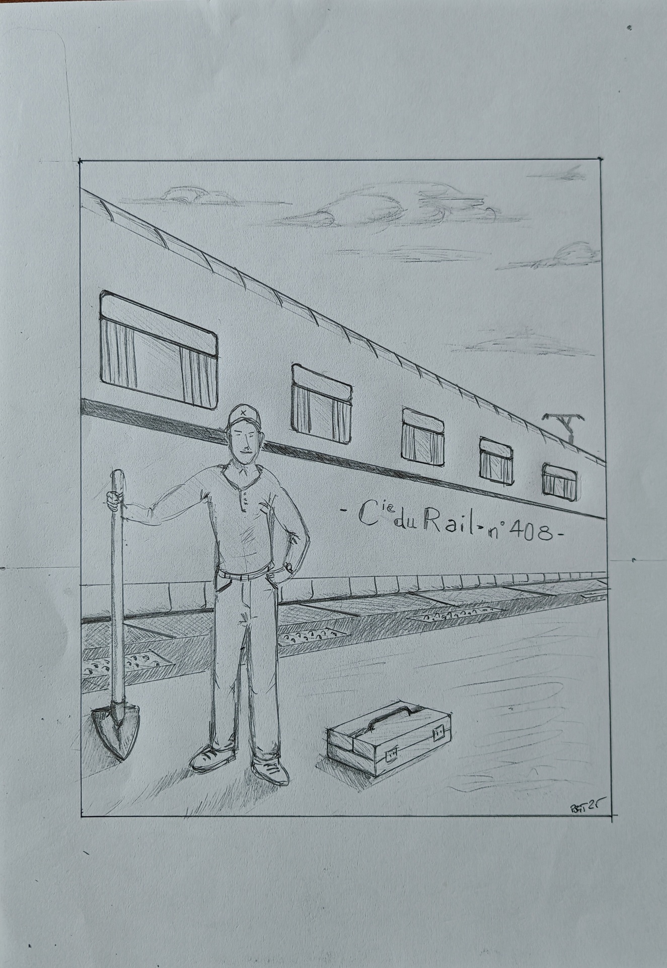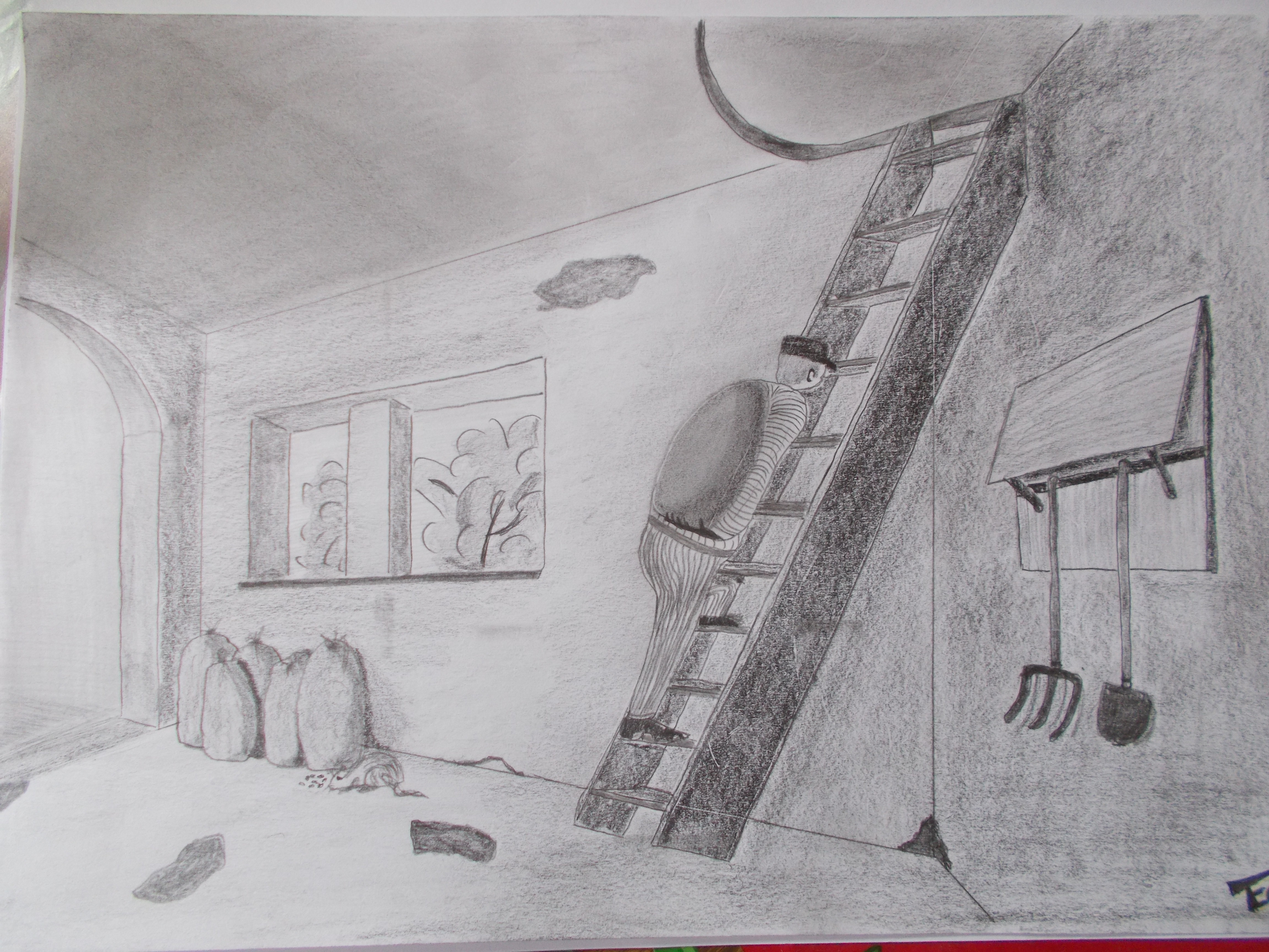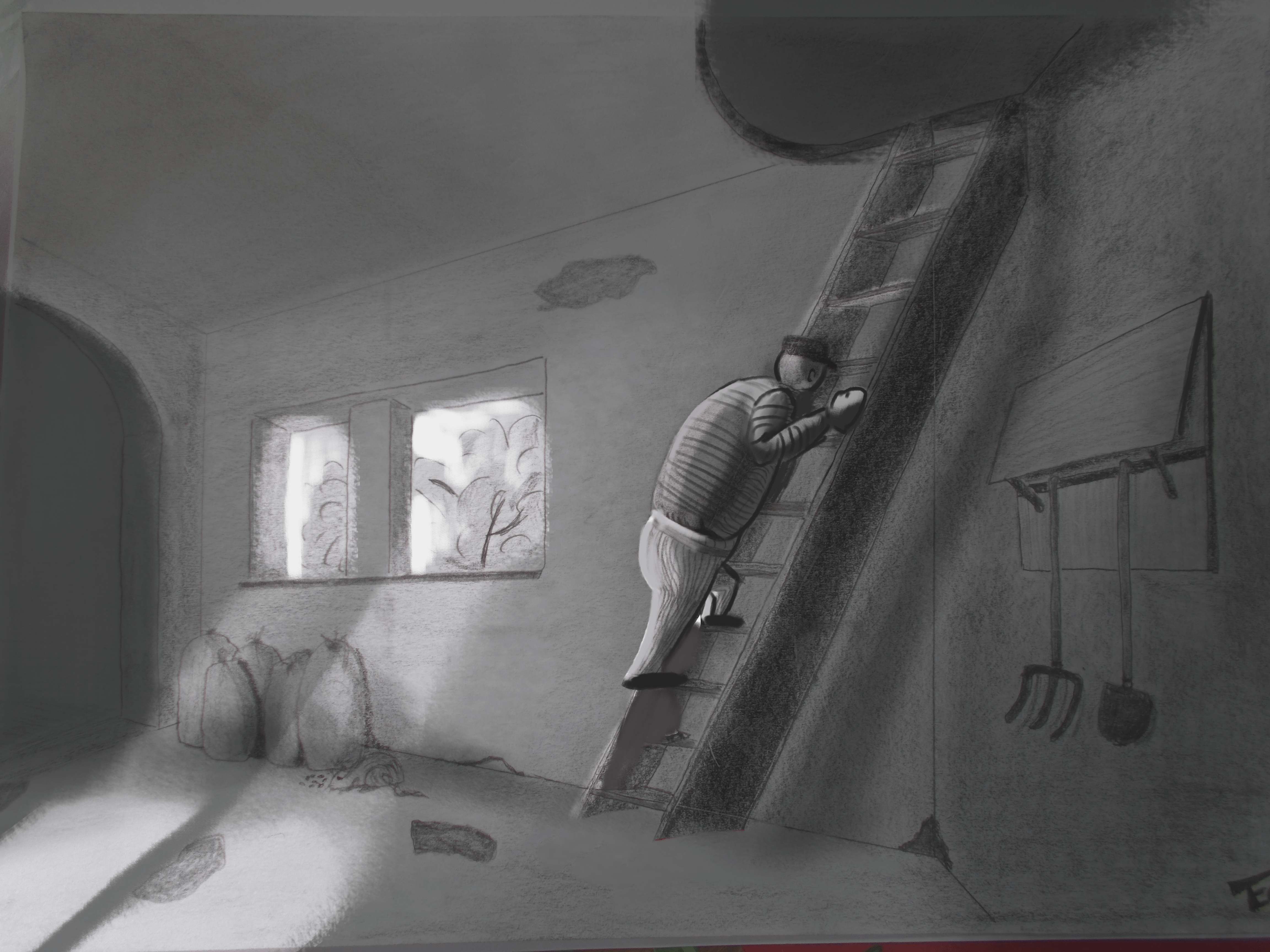Ne t'inuqiete pas pour la qualité, on arrive très bien à comprendre ton illustration :) C'est top, on voit que tu as réutilisé pleins de choses vues pendant les cours :) Tu peux être contente car le résultat est là !! Pour améliorer tes on illustration, je te conseil de travailler d.avanatge tes nuances de gris et les contrastes, cela va faire ressortir les volumes et l'ambiance et raconter encore plus de chose. Ensuite, au niveau de la narration en elle même, tu aurais pu jouer avec d'autre ombres portée d'element en hors champs qui viennent se répercuter dans le champs, ainsi on a l'impression que ton dessin est une simple capture d'un moment mais qu'il y a de la vie en dehors du cadre. De la même manière tu aurais pu apporter quelques détail au niveau du ciel pour qu'on devine un peu plus l.ambiance (intérieur, extérieur...)
