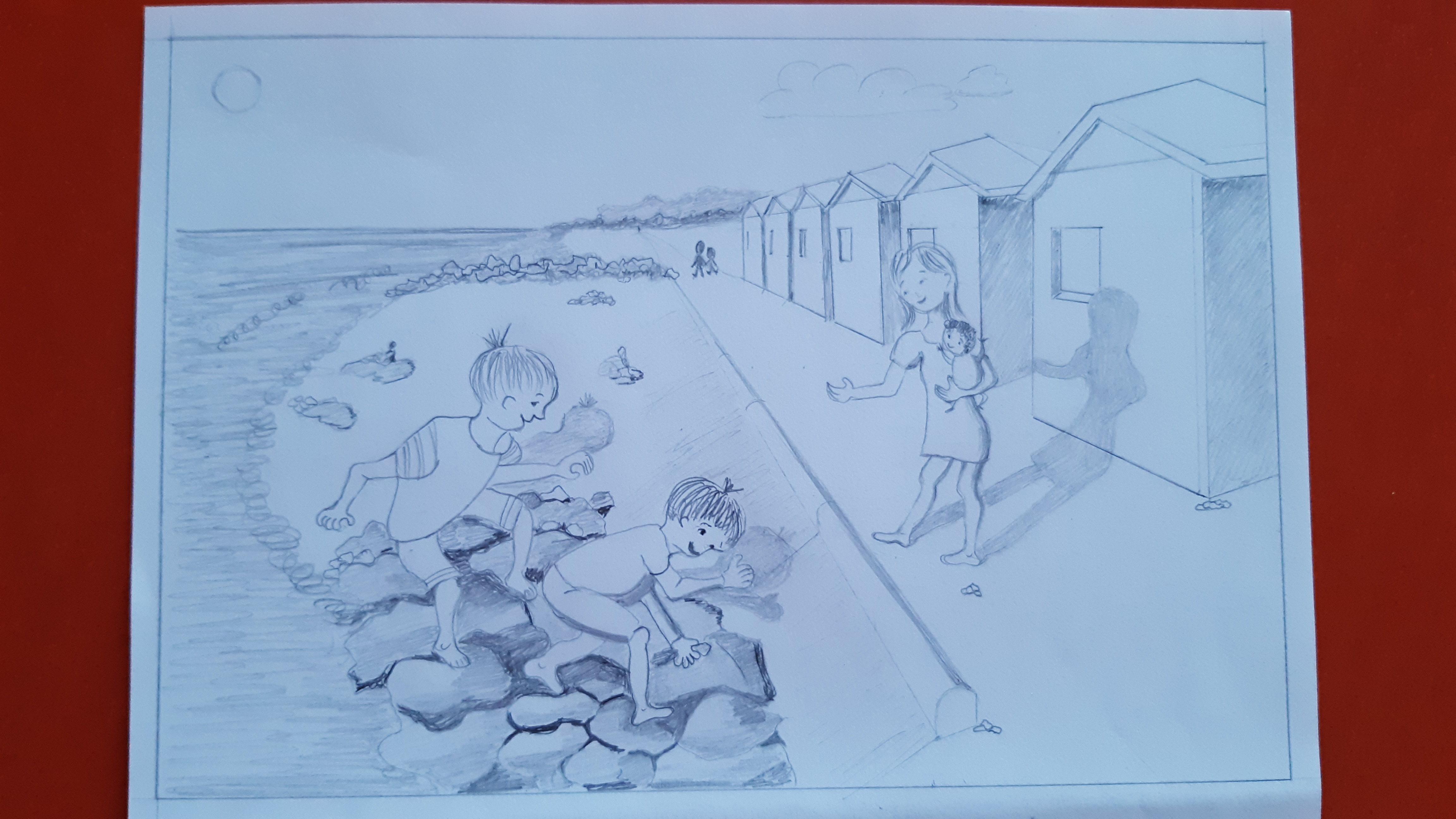 Je te partage quelques ajustements anatomiques pour les enfants, comme tu l'avais demandé. Concernant l'image en général, l'utilisation de la perspective et des valeurs de gris est appropriée. Les rochers de la baie sont très jolis, et l'ombre portée des personnages donne une touche tridimensionnelle très agréable.