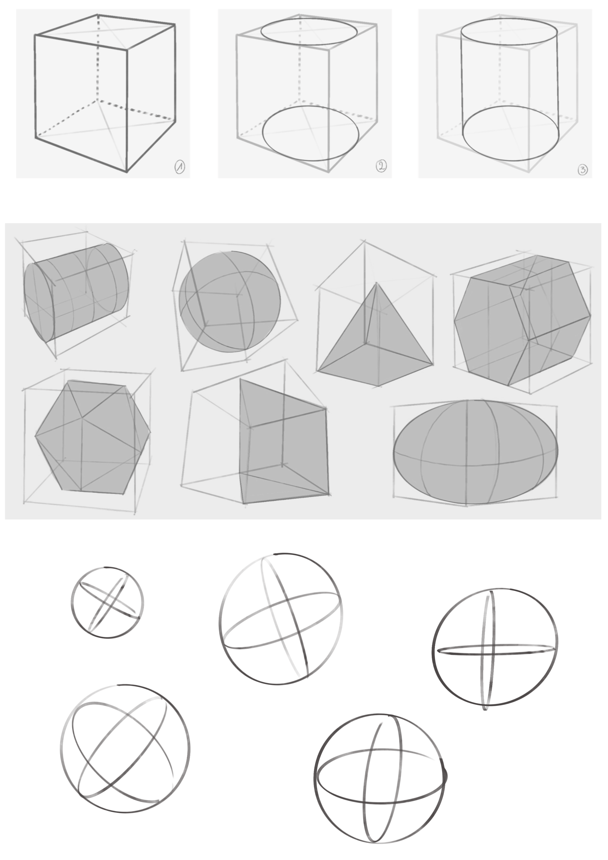 De este principio, puedes construir lo que quieras. Y para un círculo, es aún más simple. Cuando se pone en volumen, se convierte en una esfera. Lo único que diferencia un círculo de una esfera es la sombra que le atribuiremos. Cuando trabajamos solo en la línea, generalmente agregamos puntos de referencia de volumen (elipses internos) para mostrar que es una esfera. Para rastrear estas elipses, también puede ayudarse con un cubo en perspectiva como punto de referencia.
