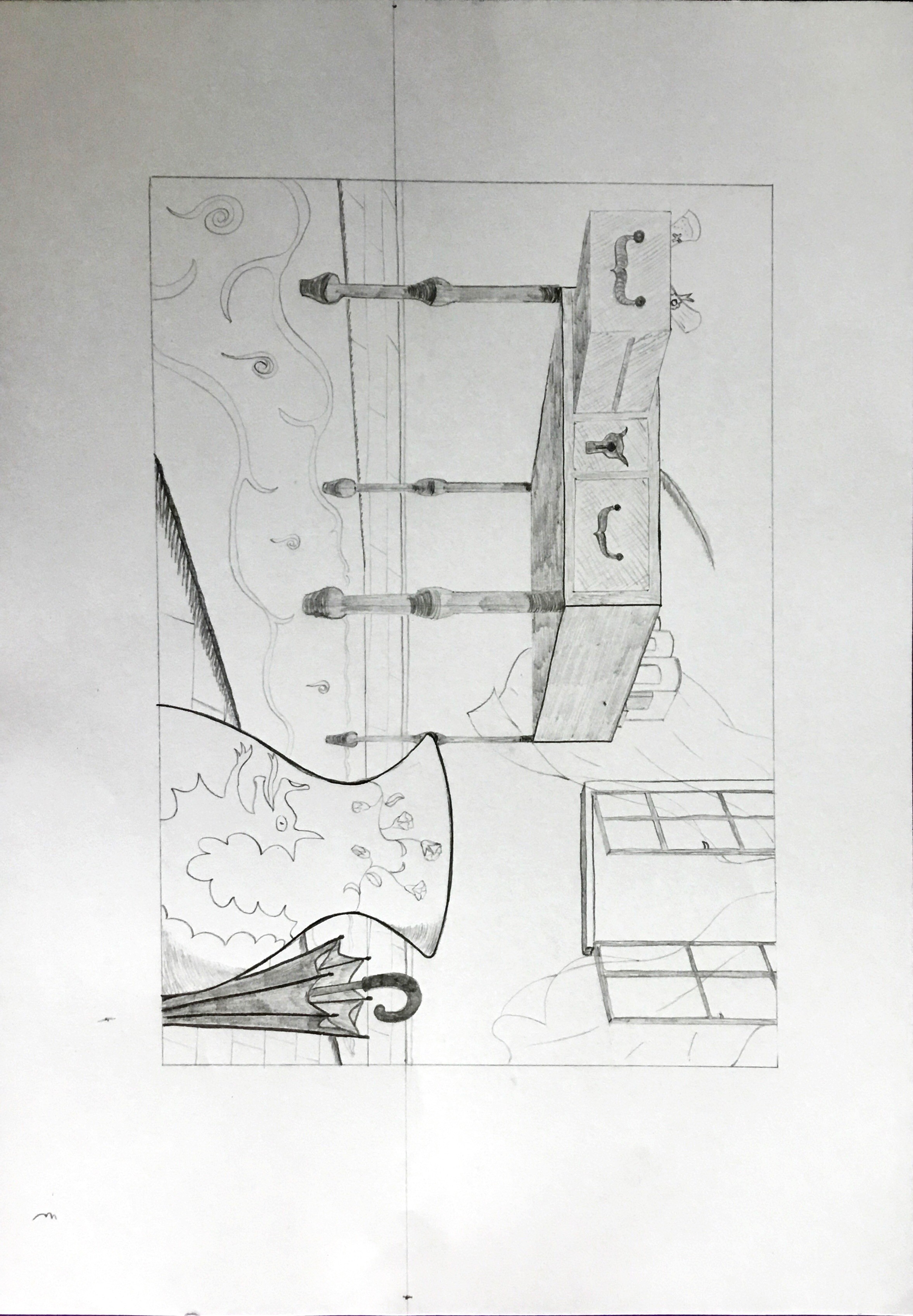 4) Pour répondre à ta deuxième question, quand le point de fuite sort de la feuille je mets une deuxième feuille sous la première, décalée, qui me servira uniquement de prolongation de ma ligne d'horizon. Je fais ma mise en place tranquillement, et lorsque je n'en ai plus besoin je l'enlève !