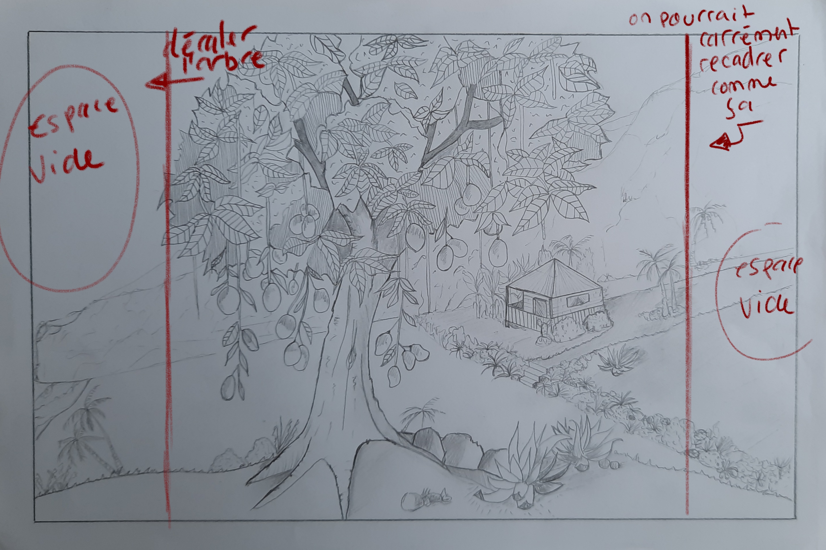 Buenas noches Jessica, ¡es genial, hermosa renderización! Tenga cuidado, que hace espacios vacíos en los lados, sería necesario cambiar el árbol a la izquierda y la casa a la derecha, o recortar el dibujo directamente como lo hice en la solución. Me gusta la representación con las diferentes texturas en el árbol, pero debe tener cuidado de no querer poner demasiado una textura diferente (aquí hay 4), de lo contrario se vuelve ilegible. Detener en una o dos texturas ya parece bastante, entonces debe manejar contrastes con las áreas de sombras y luz.