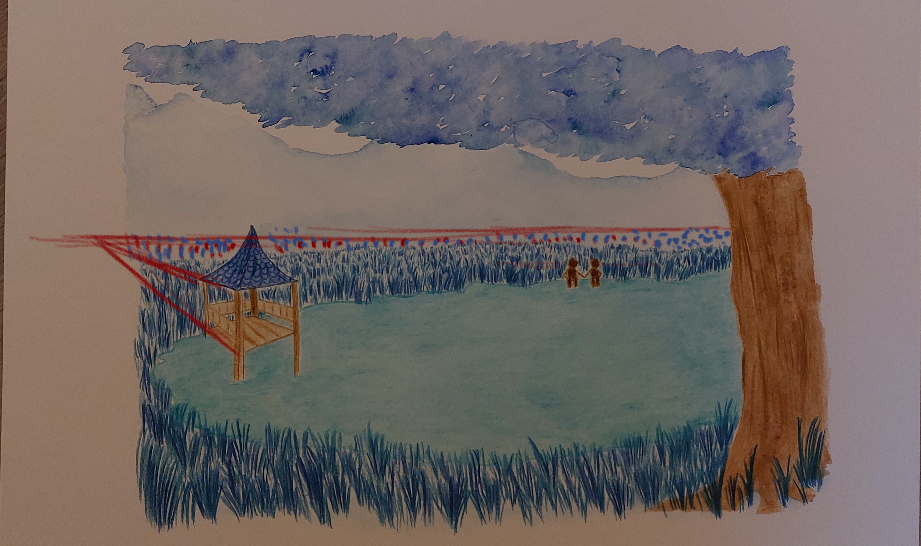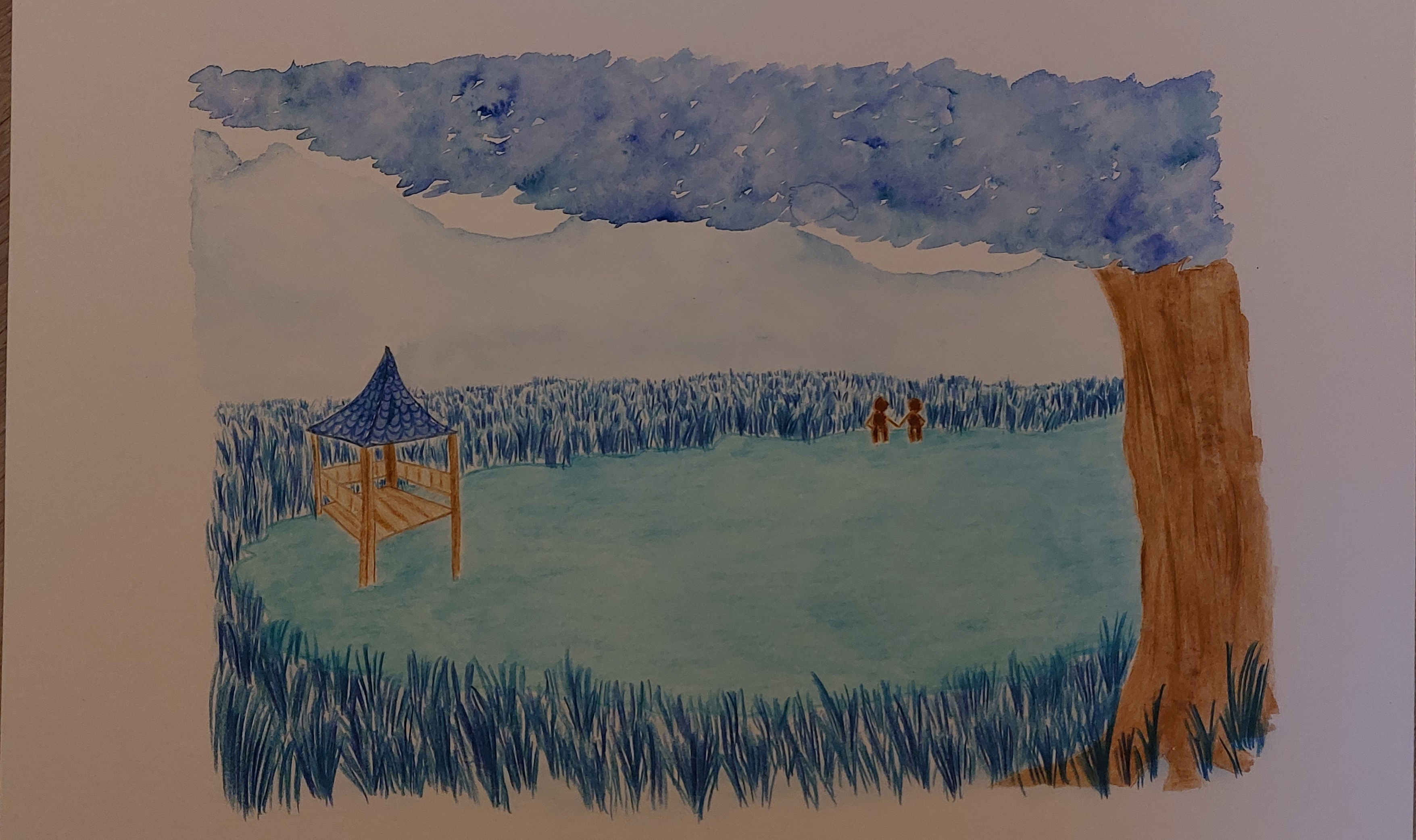 Hola Anaisf, realmente bien tu acuarela (¿es esa acuarela?), ¡Buena composición! Puede estar un poco vacío en el centro, al perder los diferentes elementos, puede remediarlo fácilmente (no mucho, para mantener el espíritu del dibujo con su gran extensión de vegetación (¿o Bluehure? 😁)