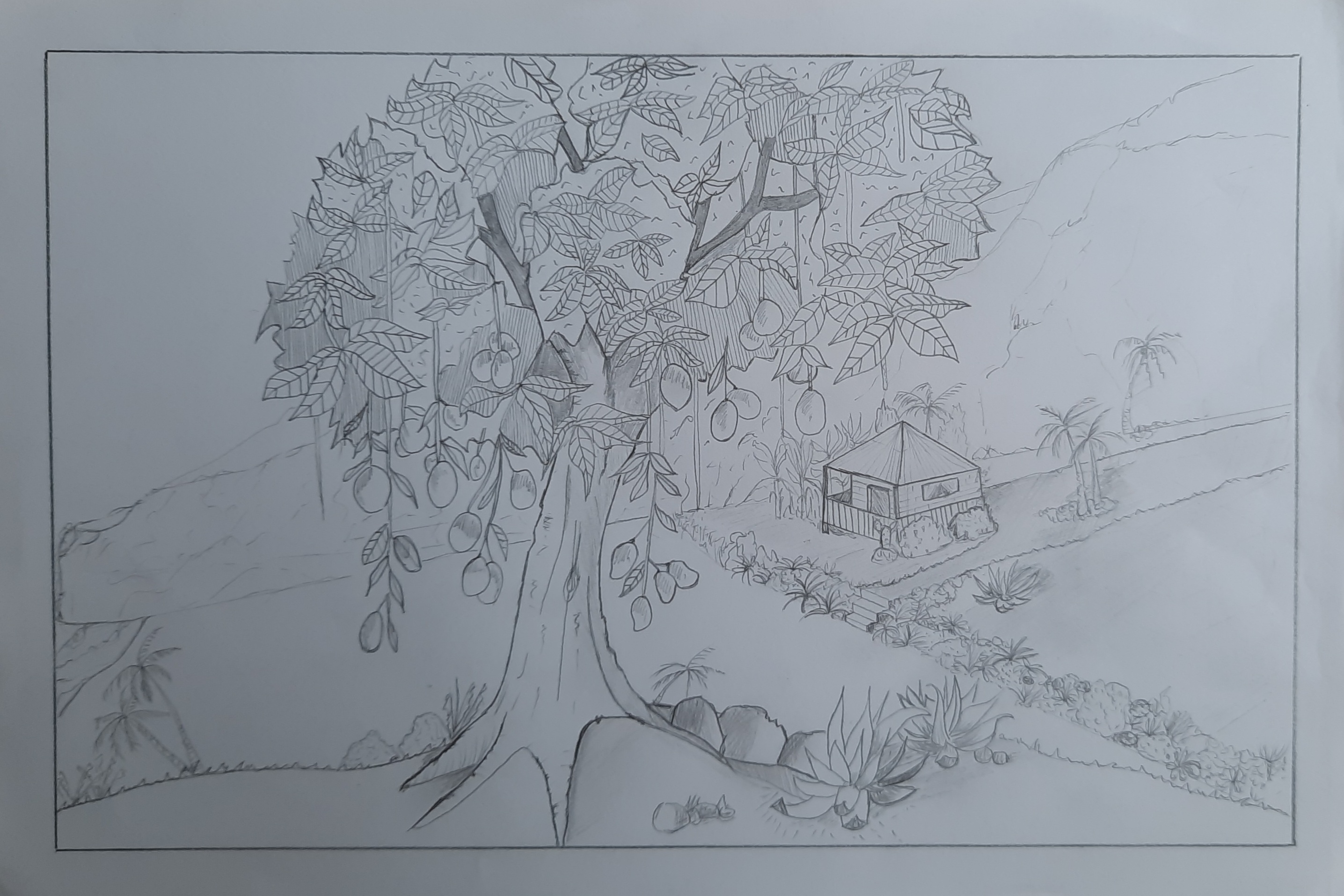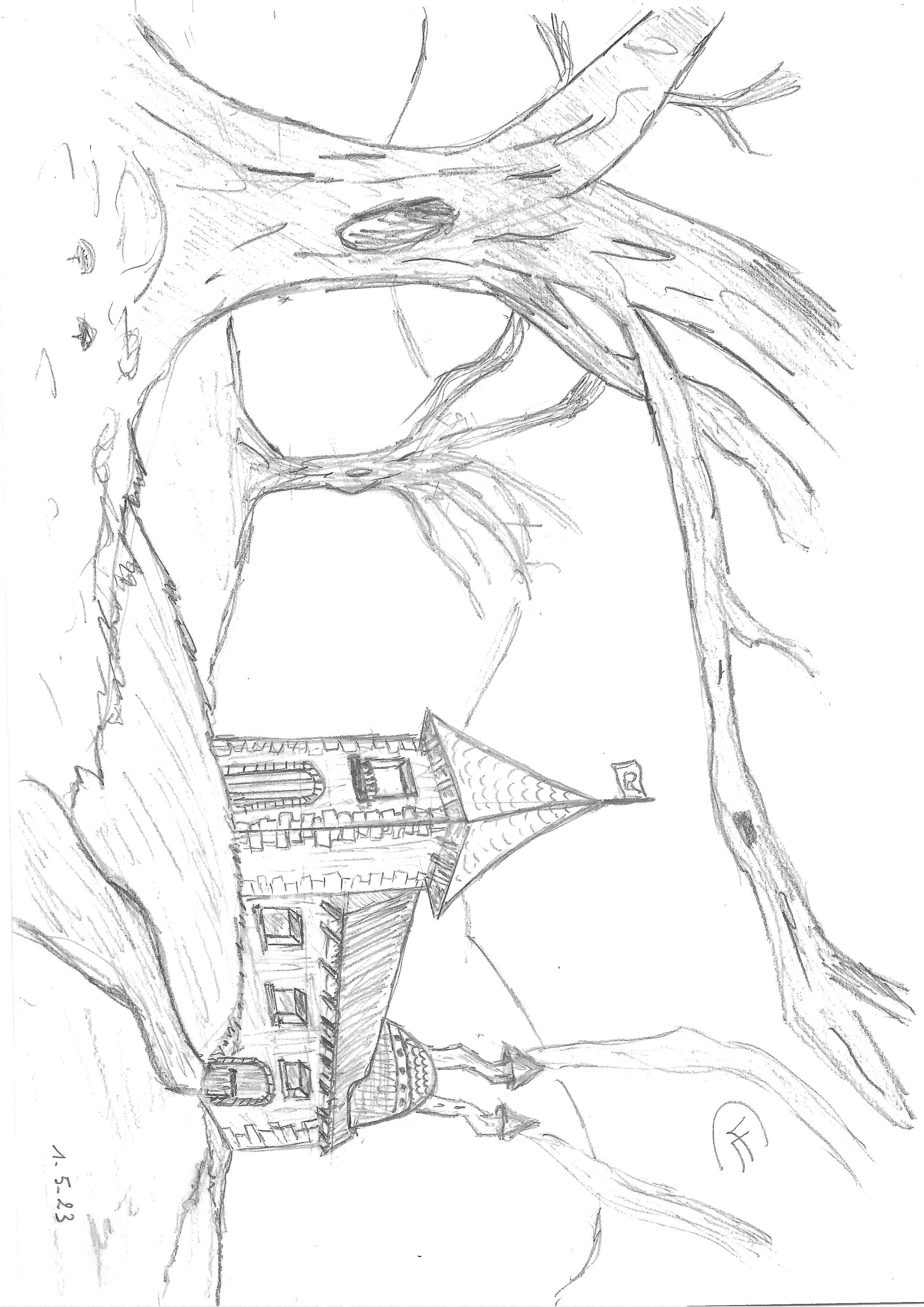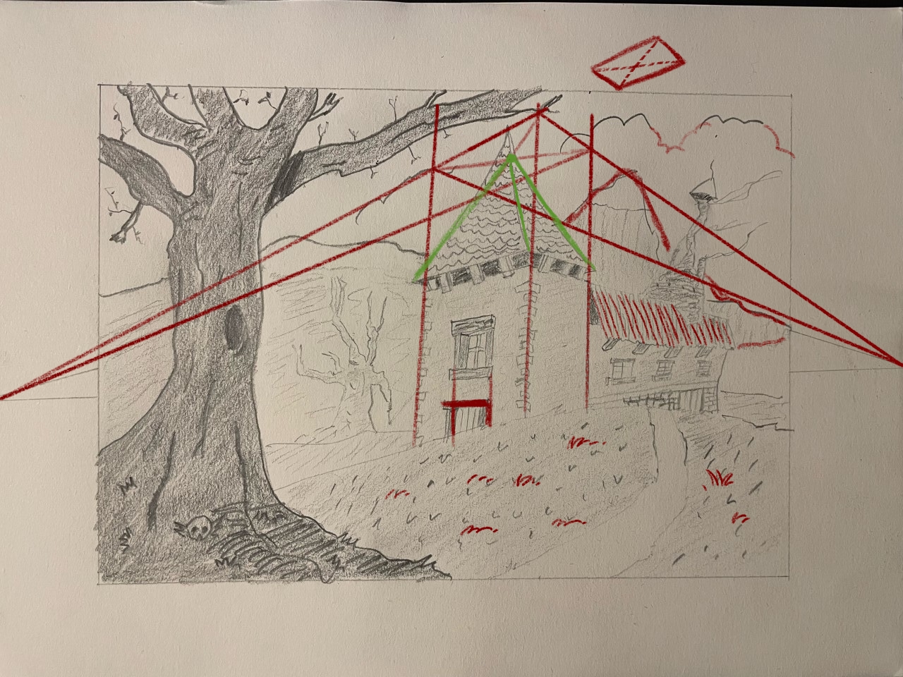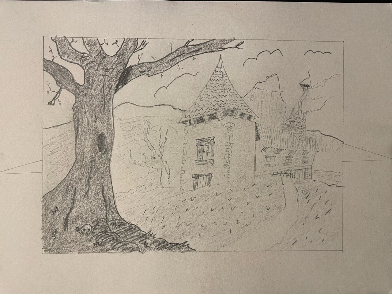 Super dessin, il ne faut pas hésiter à poursuivre le trait jusqu'au bout, sinon ça donne un côté inachevé (les branches de l'arbre). Ou bien il faut placer un cadre qui coupe l'image. Pour le reste, il y a un peutit espace vide dans la composition derrière le bâtiment, mais ce n'est pas bien embêtant. Attention à la perspective sur les fenêtres, de cet angle on verrait plutôt le bord inférieur et non supérieur. Dernier détail, la ligne de la colline du premier plan peut être poursuivi, donnant plus de profondeur au dessin et au placement du chemin qui mène à la maison.