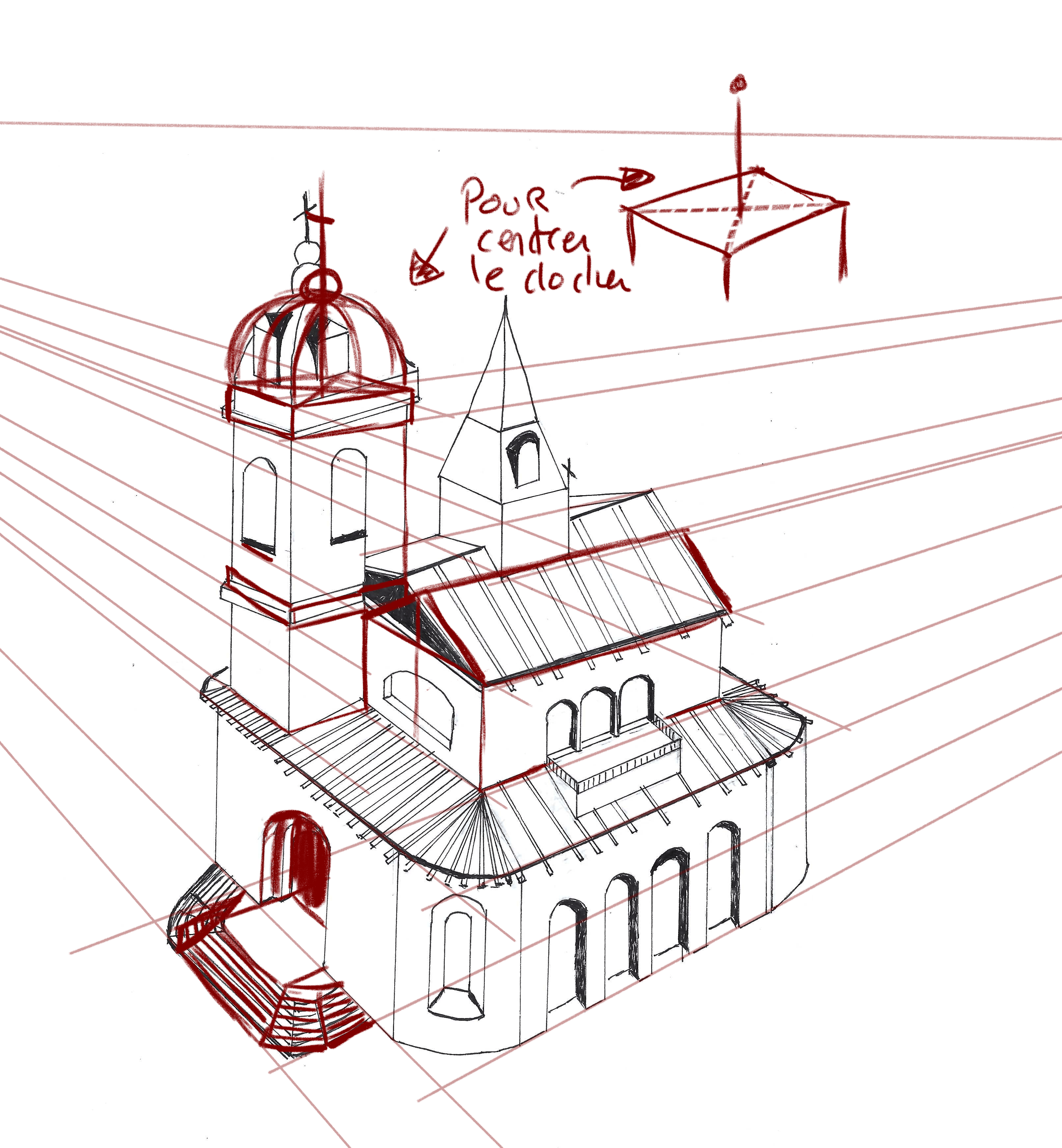 Hola Eric, ¡Me alegro de que te guste el entrenamiento! Su dibujo es muy bueno, no importa si no tomó ningún riesgo de inmediato, es bueno comenzar con algo simple. Usted ha logrado bien con la perspectiva en el edificio. Pequeños detalles para el techo, para centrar el pico bien, puede extender el cubo y encontrar el centro tirando de las diagonales del cuadrado superior.