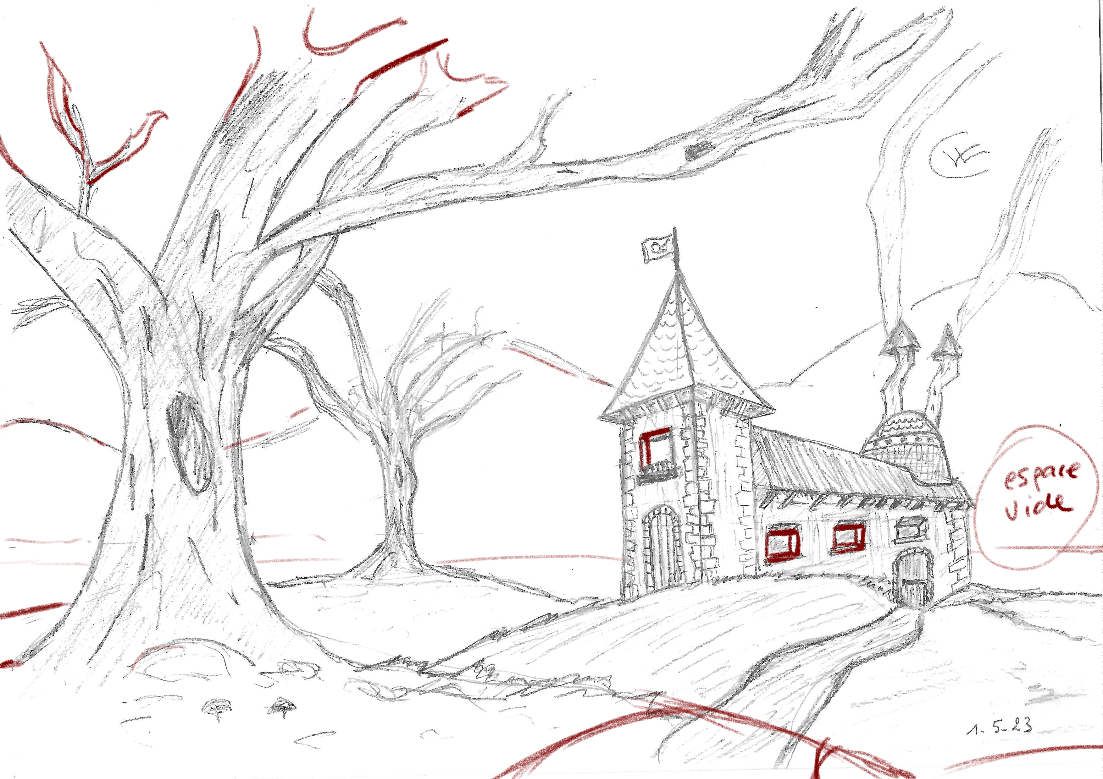 Super Dibujo, no dude en continuar la línea hasta el final, de lo contrario da un lado inacabado (las ramas del árbol). O tiene que colocar un marco que corta la imagen. Por lo demás, hay un poco de espacio vacío en la composición detrás del edificio, pero no es muy molesto. Tenga cuidado con la perspectiva de las ventanas, en este ángulo, preferiríamos ver el borde inferior y no más alto. Último detalle, se puede continuar la línea de la colina del primer plano, dando más profundidad al dibujo y la colocación del camino que conduce a la casa.