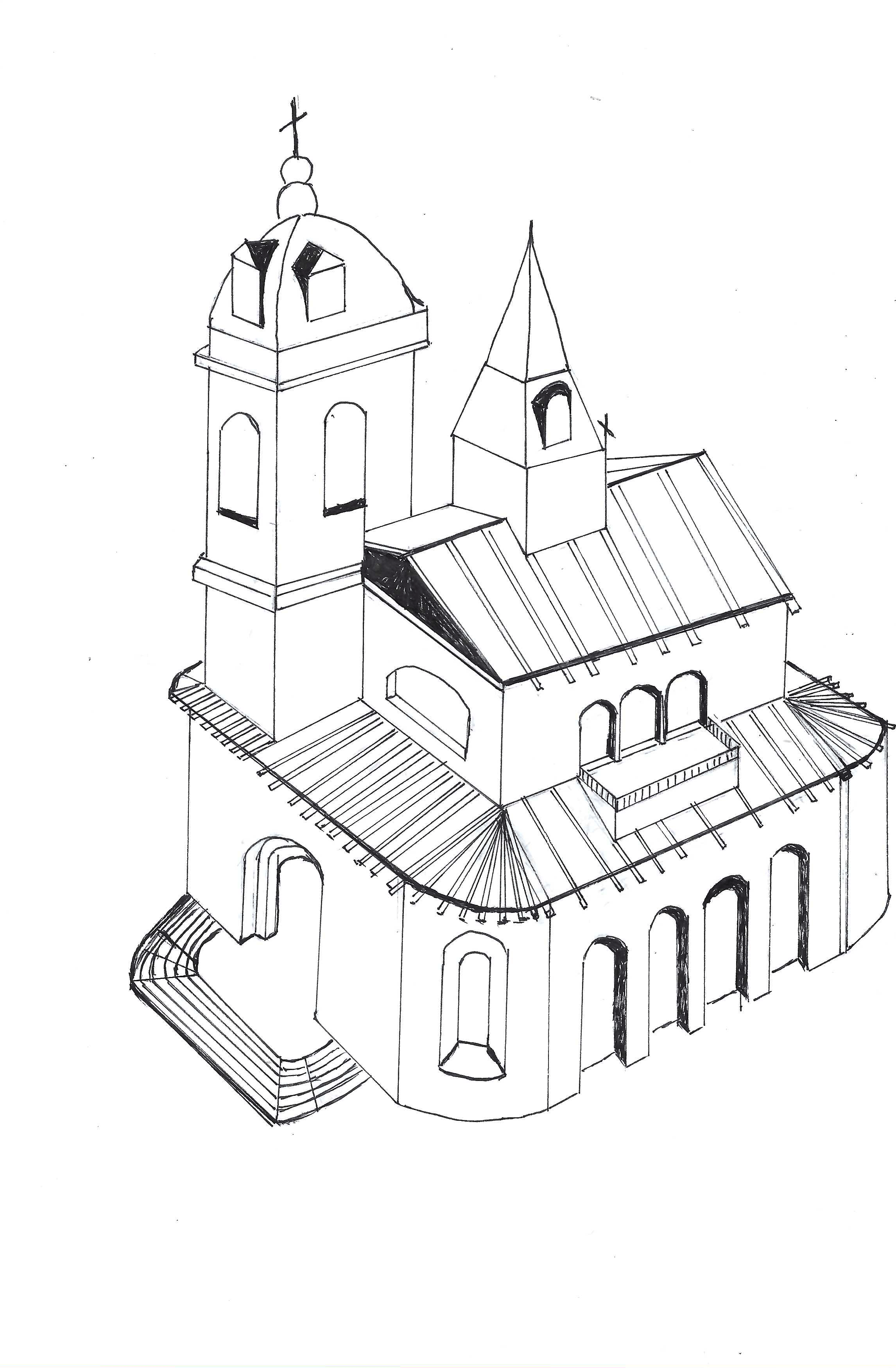 Super Ulya, tu ne t'es pas attaqué à un morceau facile avec cette église! Tu as bien géré, mais arrivé à un certain point tes lignes de fuites ne correspondent plus, du coup la perspective n'est plus correcte. Mais bon, avec un sujet aussi complexe qu'une église on peut se perdre dans la perspective. Attention aux encadrements des portes et fenêtres, avec une vue plongeante comme celle-ci on ne doit pas voir la voûte supérieur. Sinon, petit astuce pour bien centrer un clocher ou un toit pointu, tu peux tirer les diagonales de ta colonne et ça te donner le centre du cube! ^^