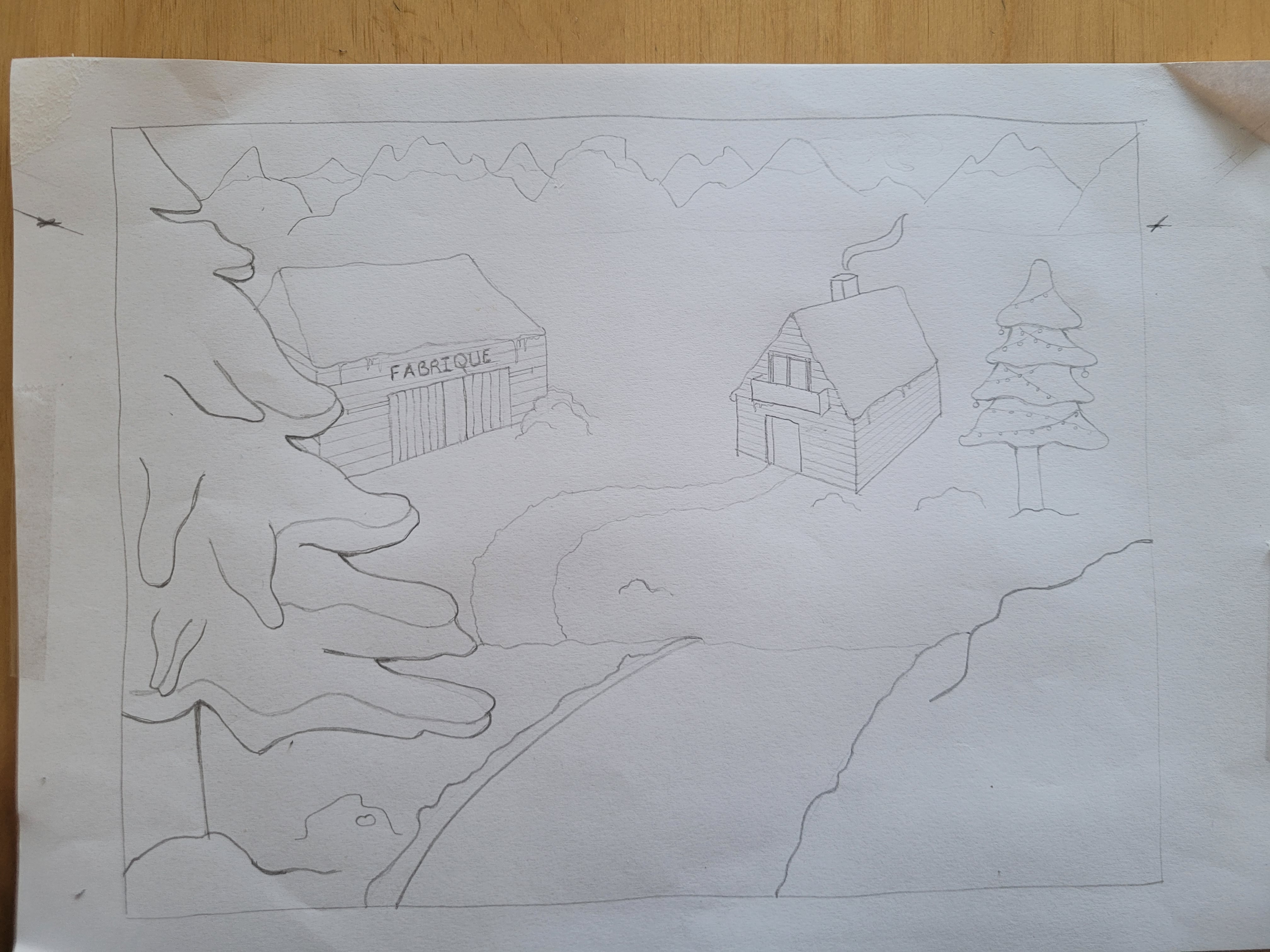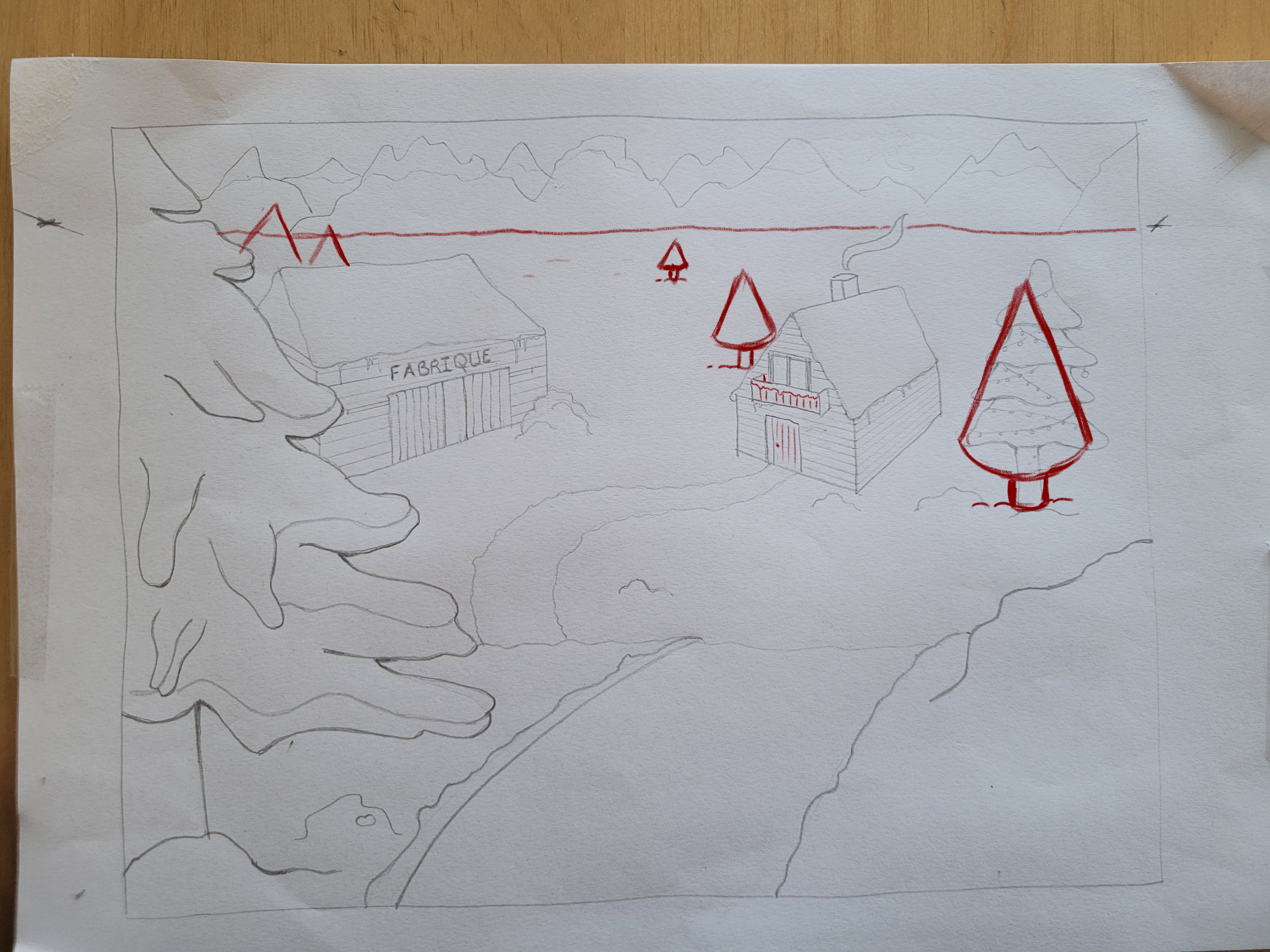Essaie de marquer un peu plus ta ligne d'horizon, sinon je pense que tu peux placer quelques sapins en plus pour habiller une ta composition. Attention à l'angle de tes arbres, ils doivent correspondre à ta perspective. Tu peux les simplifier en faisant des cônes (comme sur mon correctif) pour bien visualiser l'angle de tes sapins.