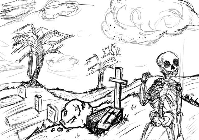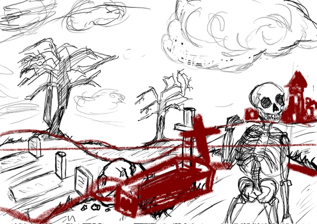 Hello Prima, elle vraiment chouette cette compo, j'aime beaucoup! L'arbre sur la gauche et le squelette sur la droite, c'est un bon équilibre. Il y a peut-être possibilité d'ajouter un élément supplémentaire (comme une batisse) en petit à l'arrière du côté droit... Mais ce n'est pas une obligation, c'est juste pour rajouter un peu plus d'ambiance dans le décor. Sinon, je pense que la tombe du premier plan devrait être un peu plus grande.