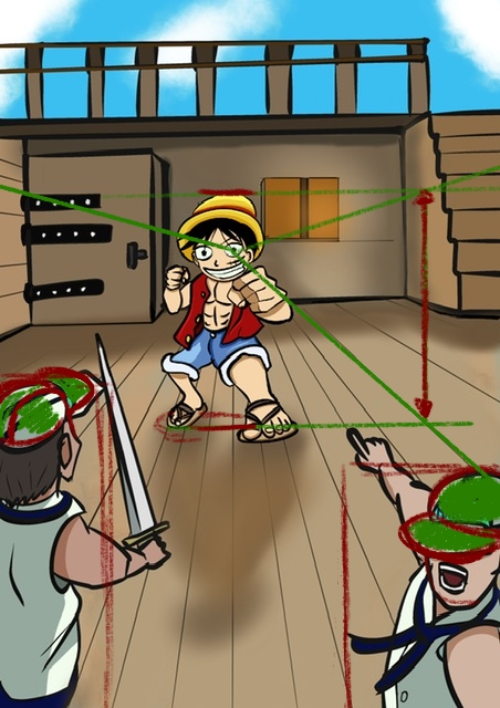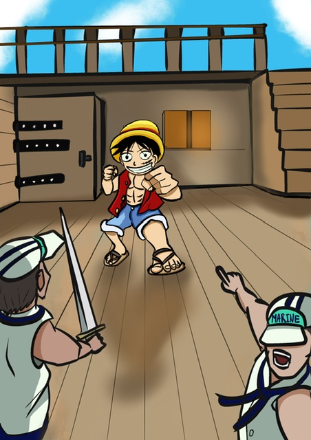 Très bien aussi! Attention néanmoins aux proportions (le corps de Luffy n'est pas tout à fait équilibré entre la taille des bras et des jambes, des pieds et des mains, mais rien de trop choquant), et aussi les échelles de hauteur: si on se base sur ta perspective (qui est très bien soit dit en passant) et la taille de Luffy, les soldats du premier plan devraient être beaucoup plus grand. Ces personnages ont d'ailleurs aussi des petits problèmes de proportions...