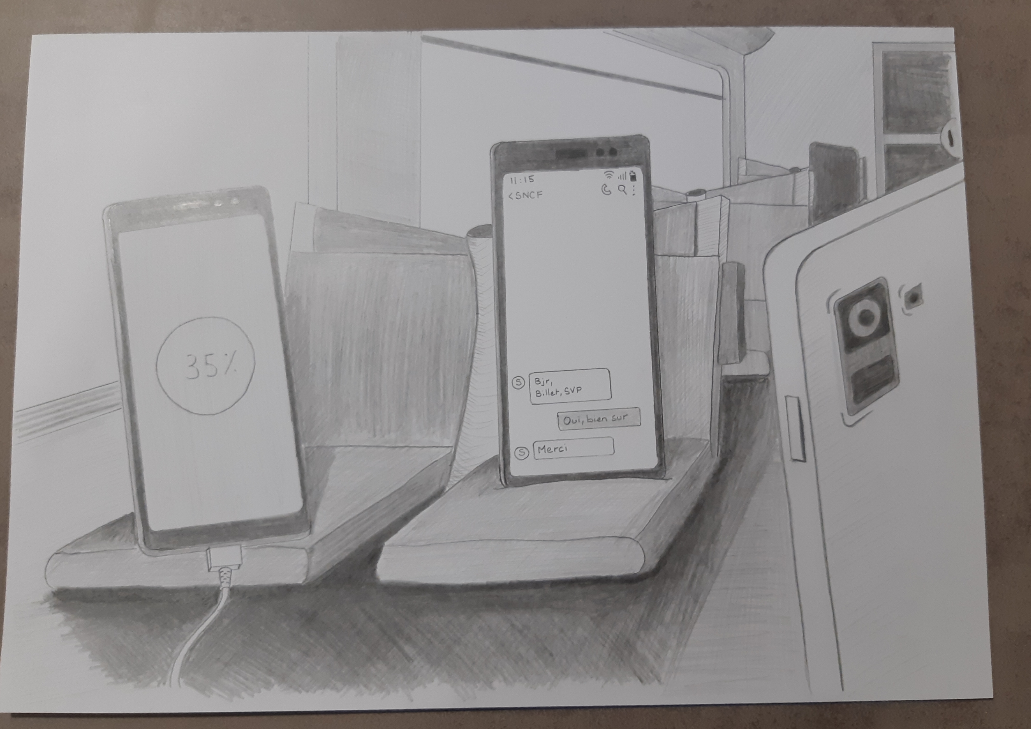 Mon projet était donc une conversation dans un tgv en marquant l'omniprésence du téléphone portable. J'ai donc étudié ces deux éléments