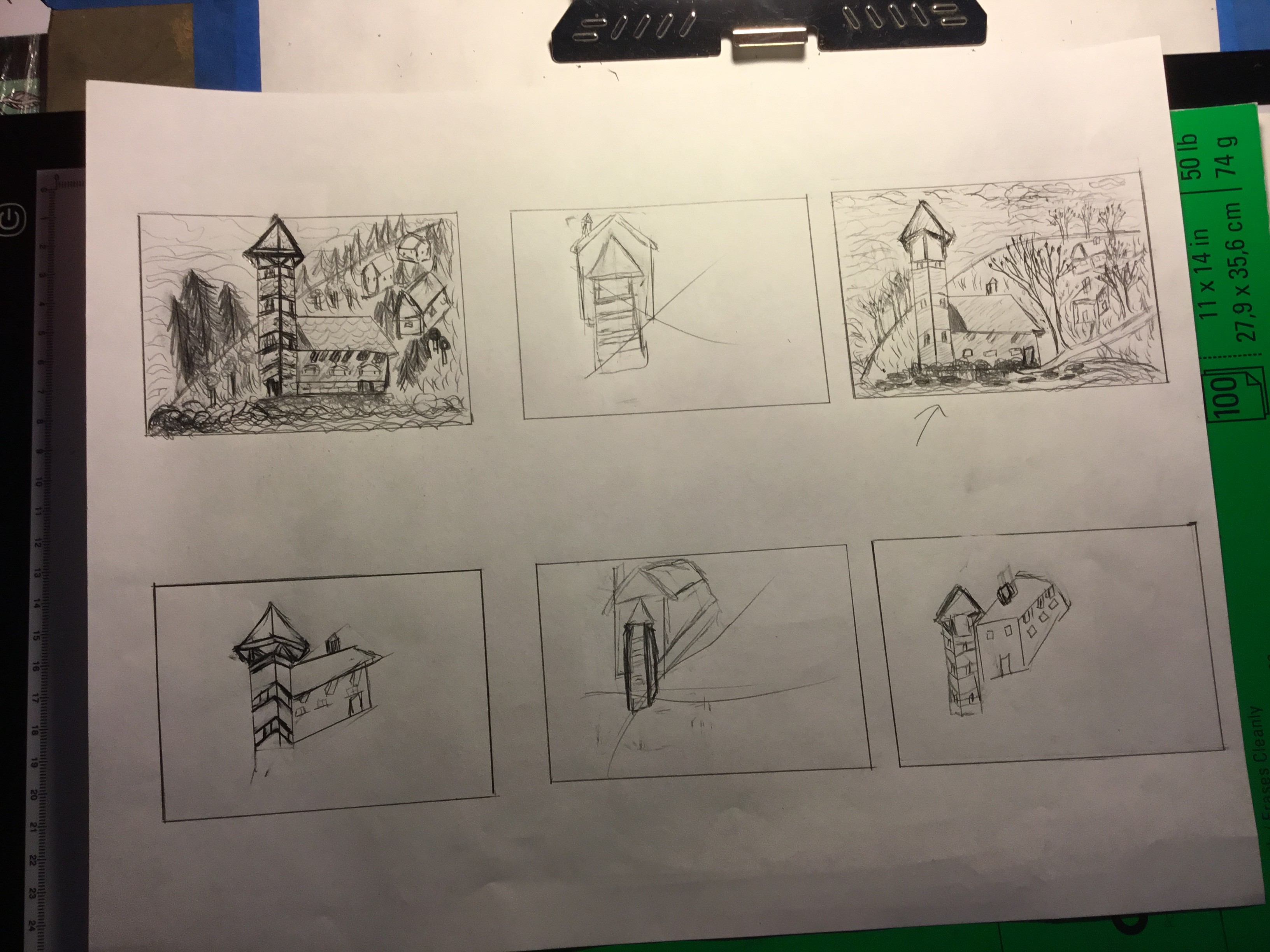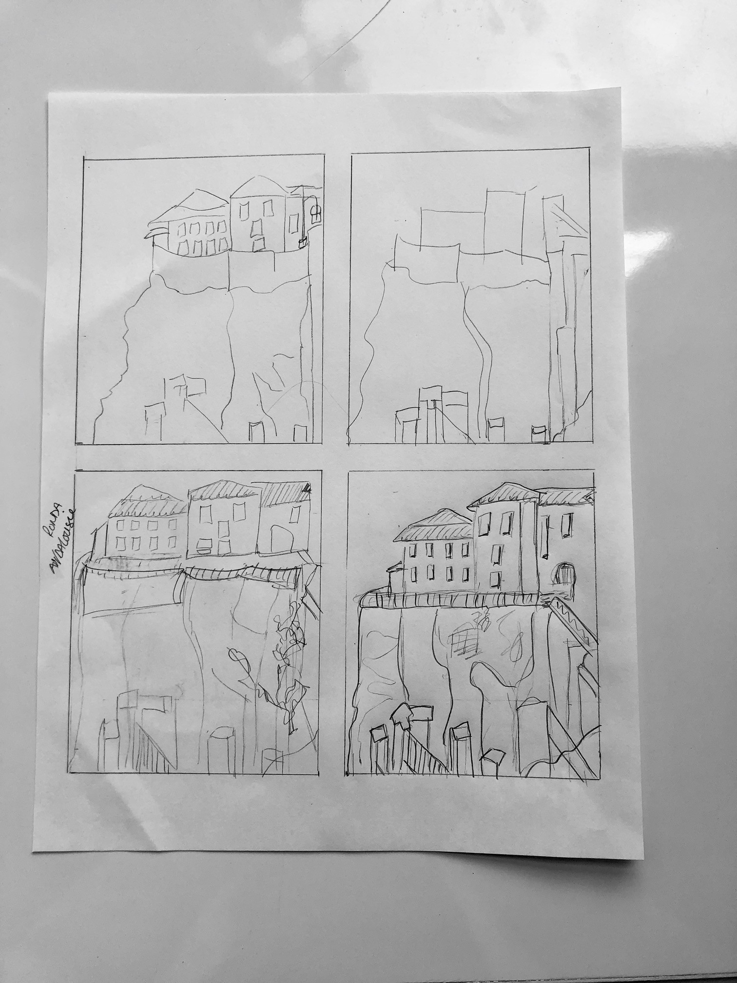 En plus j’ai pratiquée les pochades avant et quand j’ai transposé ça na pas fonctionné il fallu que j’agrandis le cadre car en premier mon cadre avait les mêmes mesure que M. Grélgoire je n’arrivais pas ma maison était trop grande et j’ai changé en cour de route mon plan est il normal après avoir fait des pochades. J’ai voulu faire un fort avec maison sur une île en premier il devait avoir des maisons éloignées et ça devait etre une île et encore par rapport a mes proportions j’ai tout changé et de la m’est venue l’idée de faire un fort éclairé avec maison le fort éclaire l’eau sur la falaise ha lala quel trouble je me suis donnée. J’ai bcp effacé j’ai eu de la difficulté avec mes droites au moins je les voies maintenant en espérant que c’est bon.