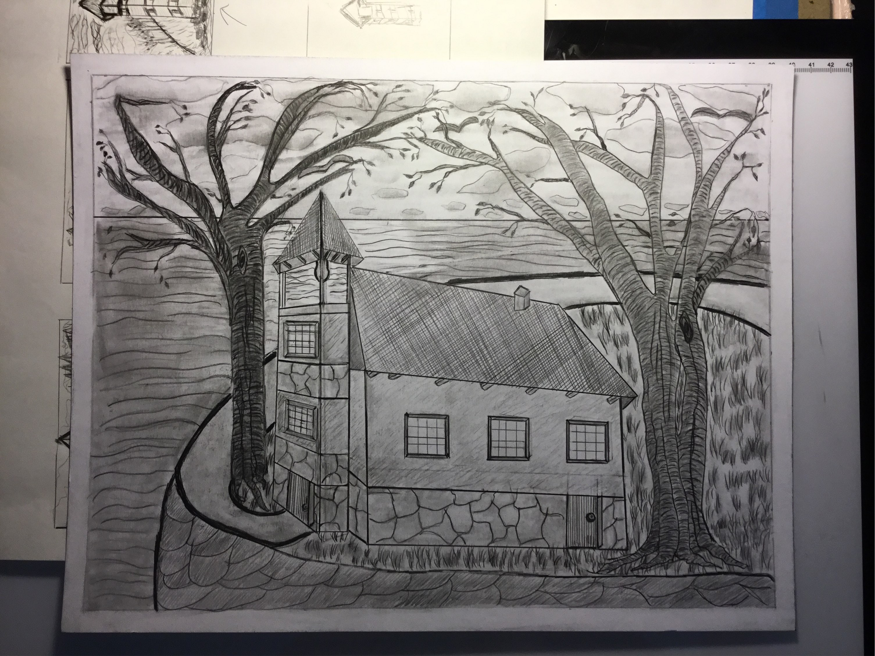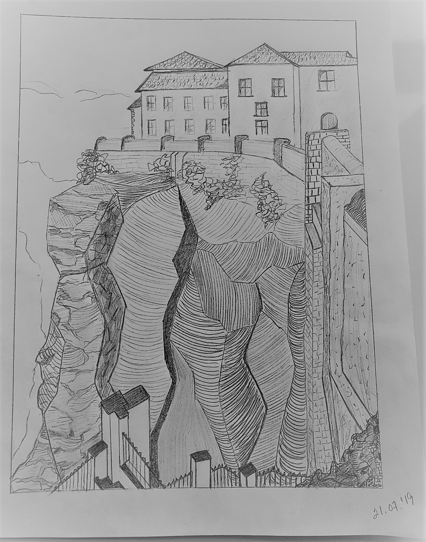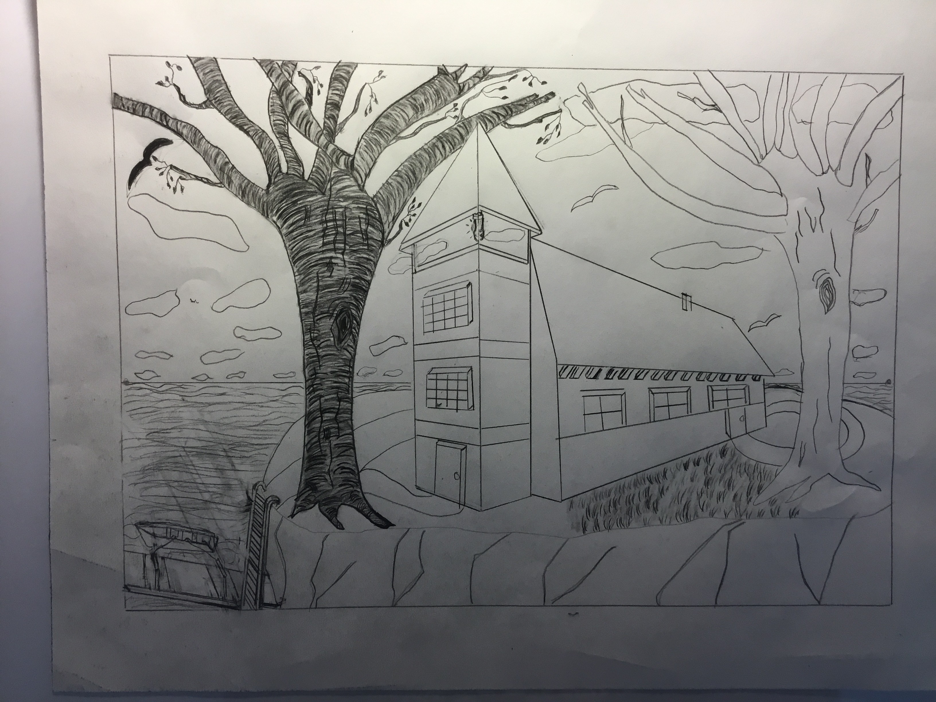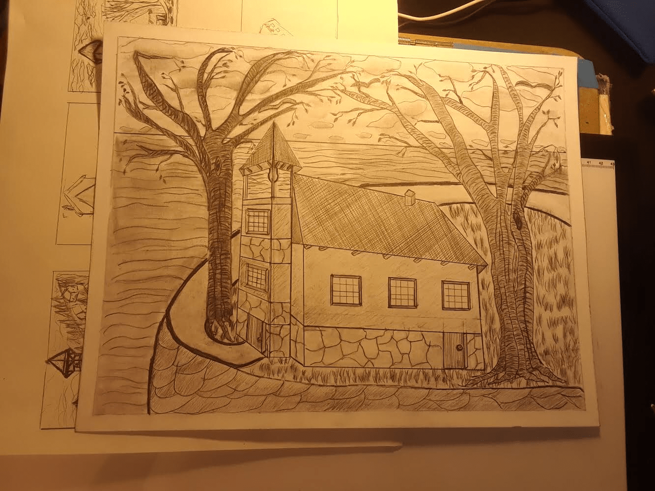 Bonjour Rackjah jai pratiquer les hachure la ligne dhorizon avec 2 points de fuite j’ai essayé de mettre à l’échelle. C’est mon tout premier dessin quoi en penses tu je sais que mon arbre a gauche il est bcp trop proche et je crois que ma maison est trop grosse par rapport a la falaise encore mes proportions,