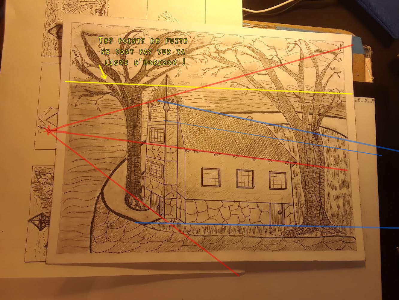 Pour en revenir à nouveau à ton dessin, tu m'as dit avoir placé ta ligne d'horizon (que l'on voit fort bien), qui est la ligne de démarcation entre la mer et le ciel. Pourtant, ta maison n'a visiblement pas un point de fuite situé sur cette dernière. (cf le dessin que je t'ai joint). Tu as donc un énorme problème de perspective. Même problème concernant le parc / jardin entourant ta maison, il semble pas mal vu de dessus, alors que tes arbres et ta maison on l'air d'être vus comme si on se trouvait bien plus proche de sol. C'est une grosse incohérence.