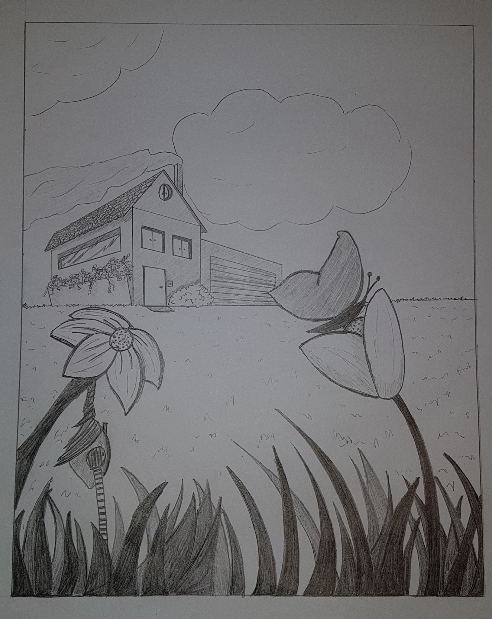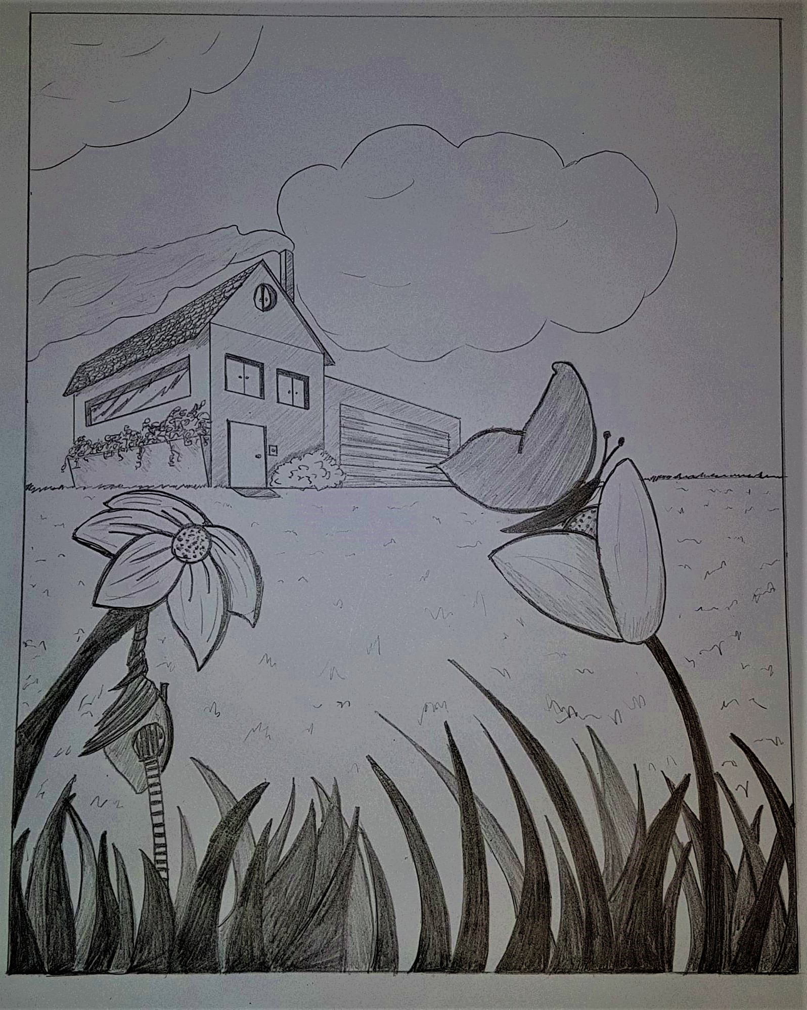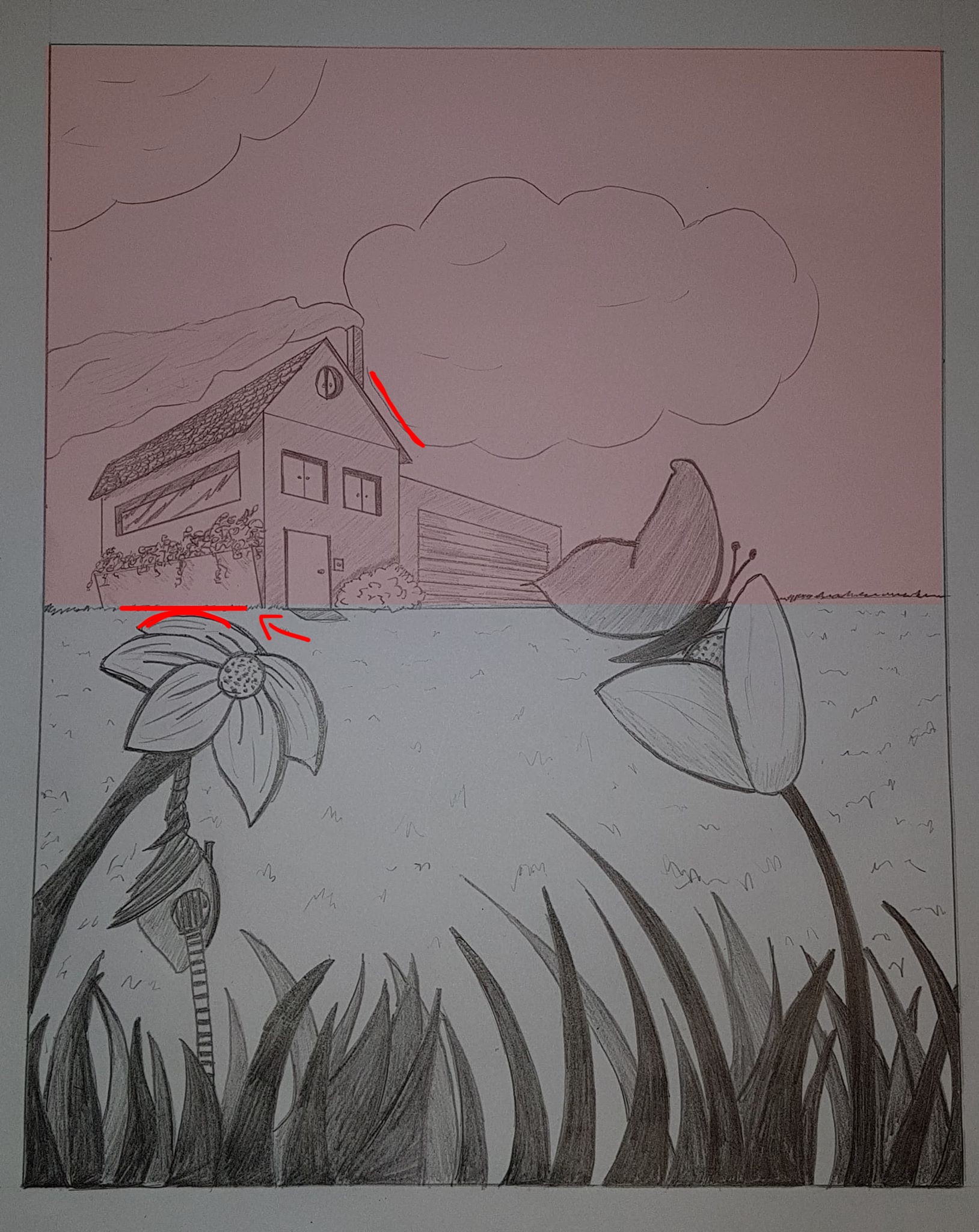 De hecho, olvidé por completo la posición de la línea Horizon (había tenido cuidado con mi primer intento, luego salió de mi cabeza 😆 ¡Me enseñará a querer hacerlo rápidamente!). Para los nudos gráficos me concentré tanto en la ubicación de la casa en comparación con la mariposa y no he tenido cuidado con la segunda flor o la nube. Muchas gracias por estos consejos que noto para el próximo dibujo 😉