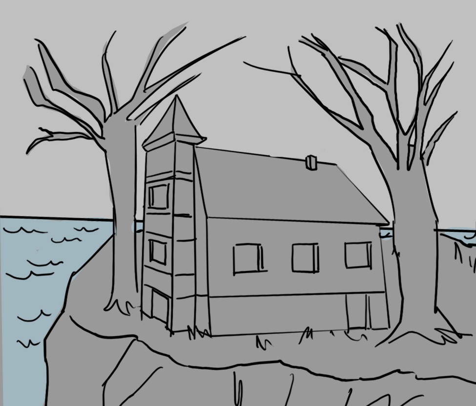Je comprends mieux d'où viennent les erreurs de ton dessin final du coup. Sur tes pochades, ton bâtiment a effectivement une ligne d'horizon très basse, et ton arrière-plan semble être vu de dessus (impossible dans la vraie vie). Si tu retires l'océan, on obtient quelque chose de plus logique : un manoir avec derrière une colline et le ciel. Tu as un souci de cohérence dès l'étape des pochades, donc forcément, tu répètes la même erreur sur ton dessin.