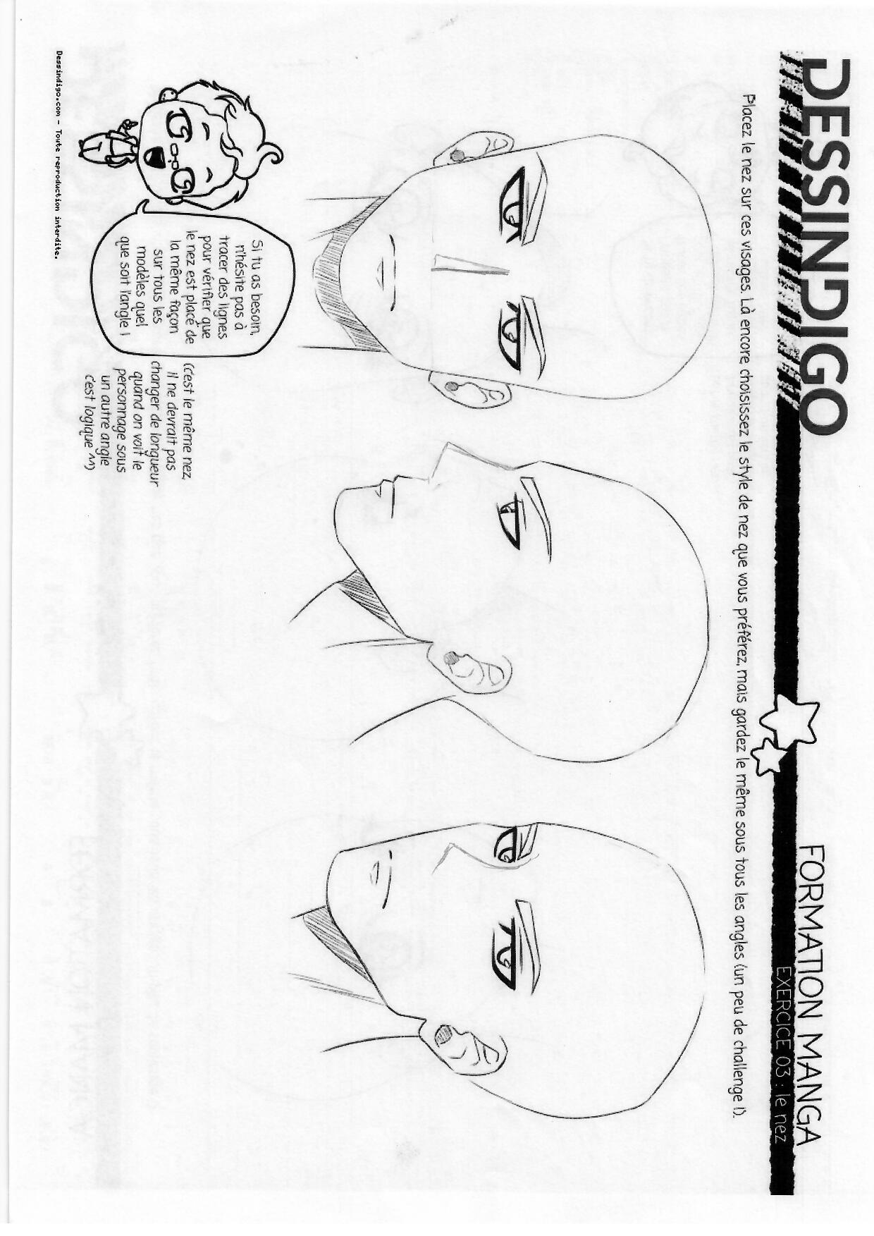 Paradoxalement, tu t'en sors plutôt bien pour le profil, c'est plutôt que le 3/4 que tu perds la ressemblance. Fais attention à la taille et la position des éléments du visage : tu as tendance à faire bouger la hauteur de la bouche et changer la taille des oreilles. Tu n'inclines par assez la mâchoire du coup le visage semble bien plus étroit. Je te joins une correction en image :D Je t'ai principalement fait des corrections sur le visage plutôt que sur le nez, mais tu auras tout le temps d'y revenir plus en détail dans les cours suivants ;p Tes nez sont réguliers sous tous les angles en tout cas :D Je valide o/