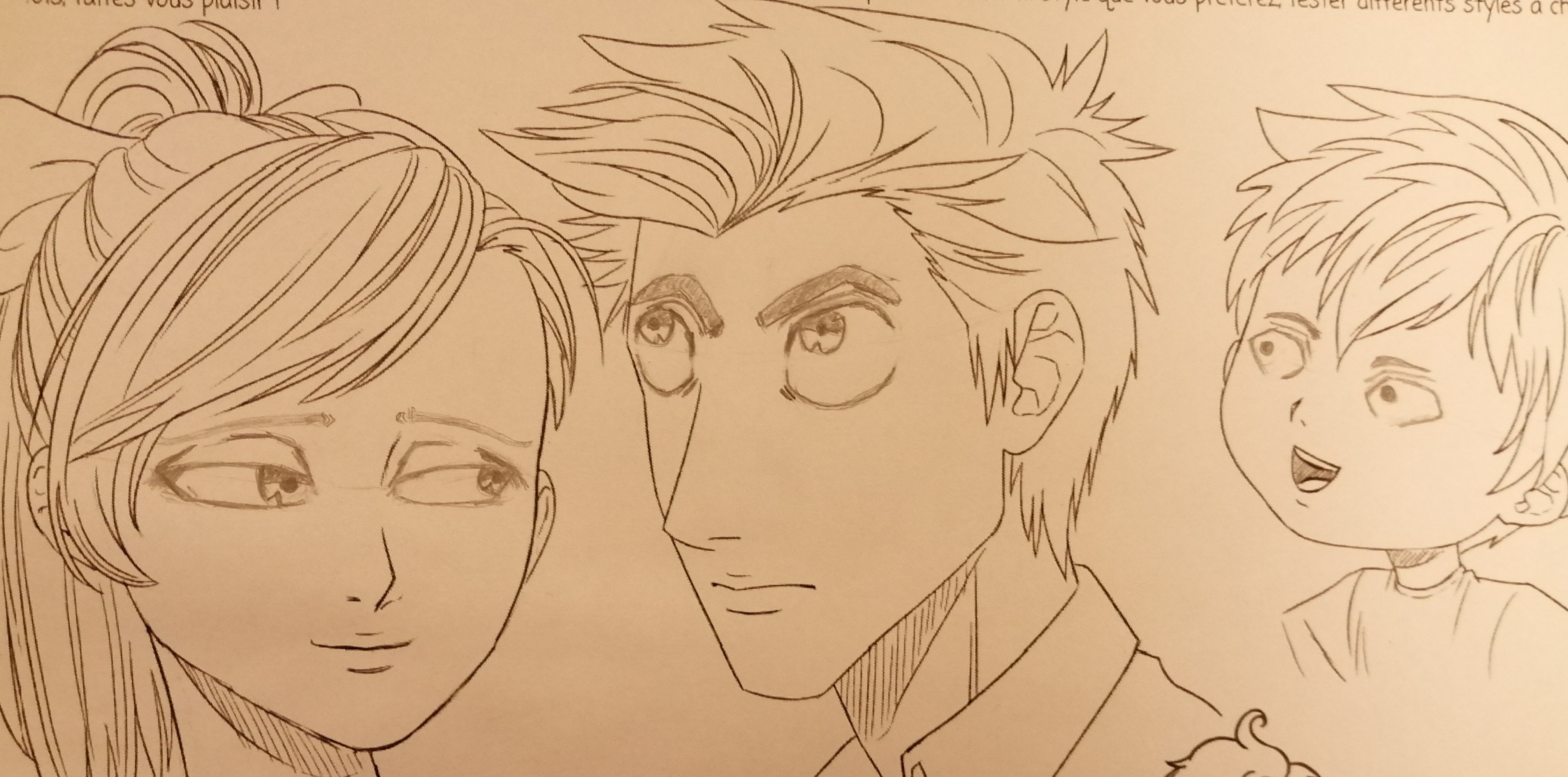 Concernant ton deuxième dessin, on retrouve le même problème de placement des yeux sur les trois versions : ils sont trop bas. L'exemple du milieu fonctionne très bien, celui de gauche, attention à la symétrie, l'oeil à droite est plus petit et les sourcils ne sont pas symétriques non plus (l'un plus long que l'autre et placé plus haut). Pour la demoiselle à droite, jette un coup d’œil à la manière dont les cils sont faire chez les personnages féminins dans les mangas. Comme dans la réalité, ils ne sont pas parfaitement régulièrement alignés parallèlement et ne sont pas tous de la même longueur ^^).