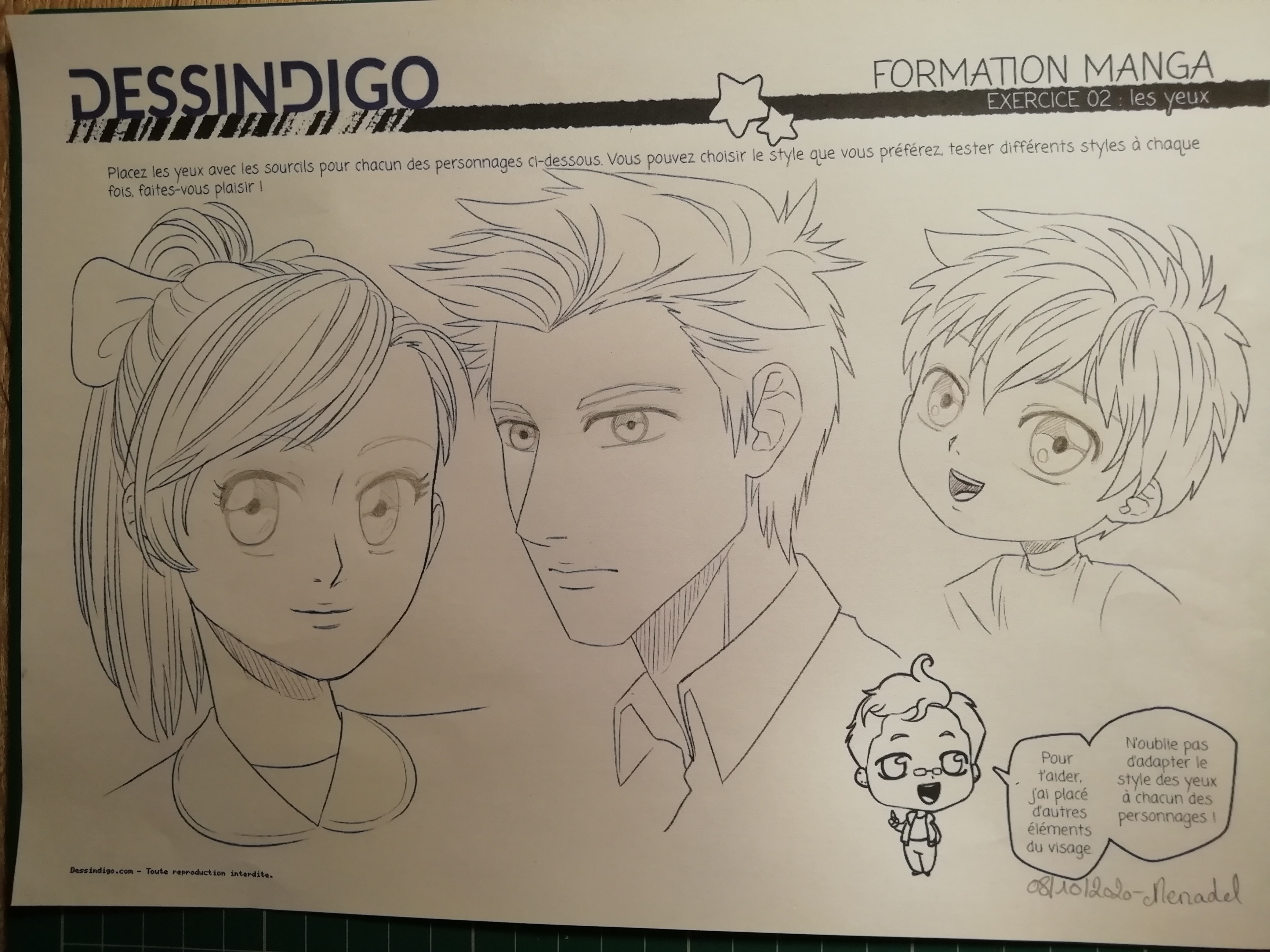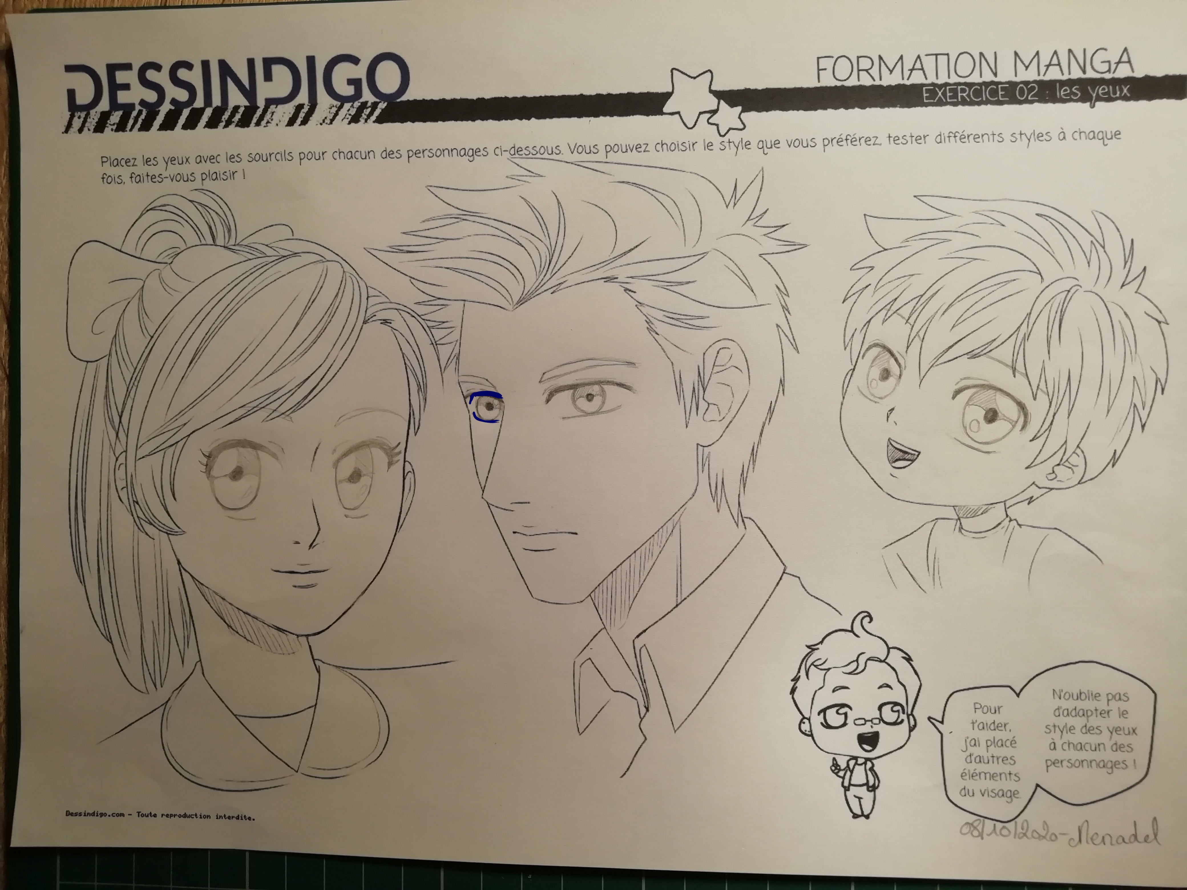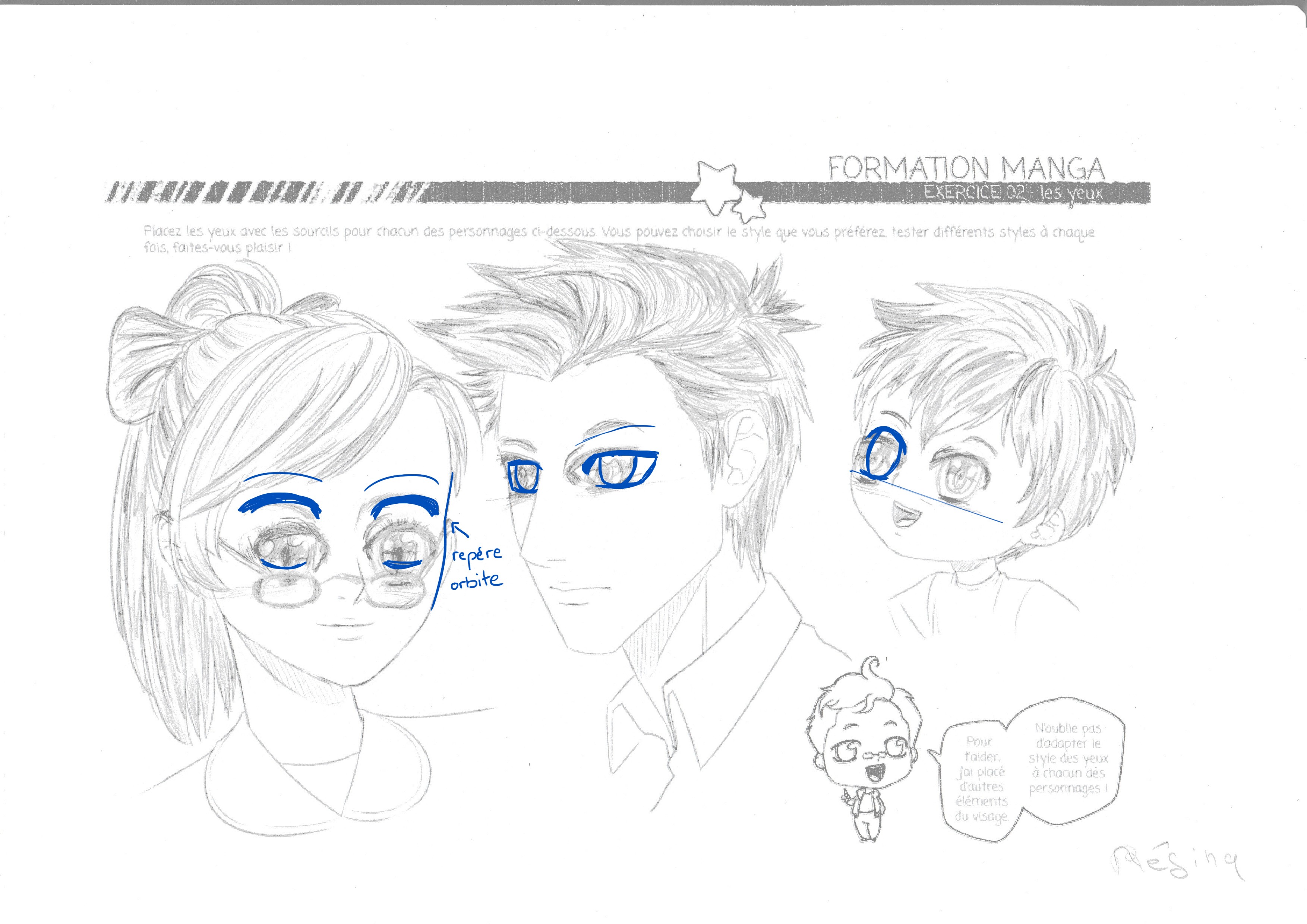 je poste les yeux mais je les ai faits avant de voir la correction ce qui peut expliquer mes erreurs ,notamment les yeux de la fille sont trop bas et j'ai eu un peu de mal a placer les yeux du garcon , mais je prends un grand a faire cette formation. Quel régal