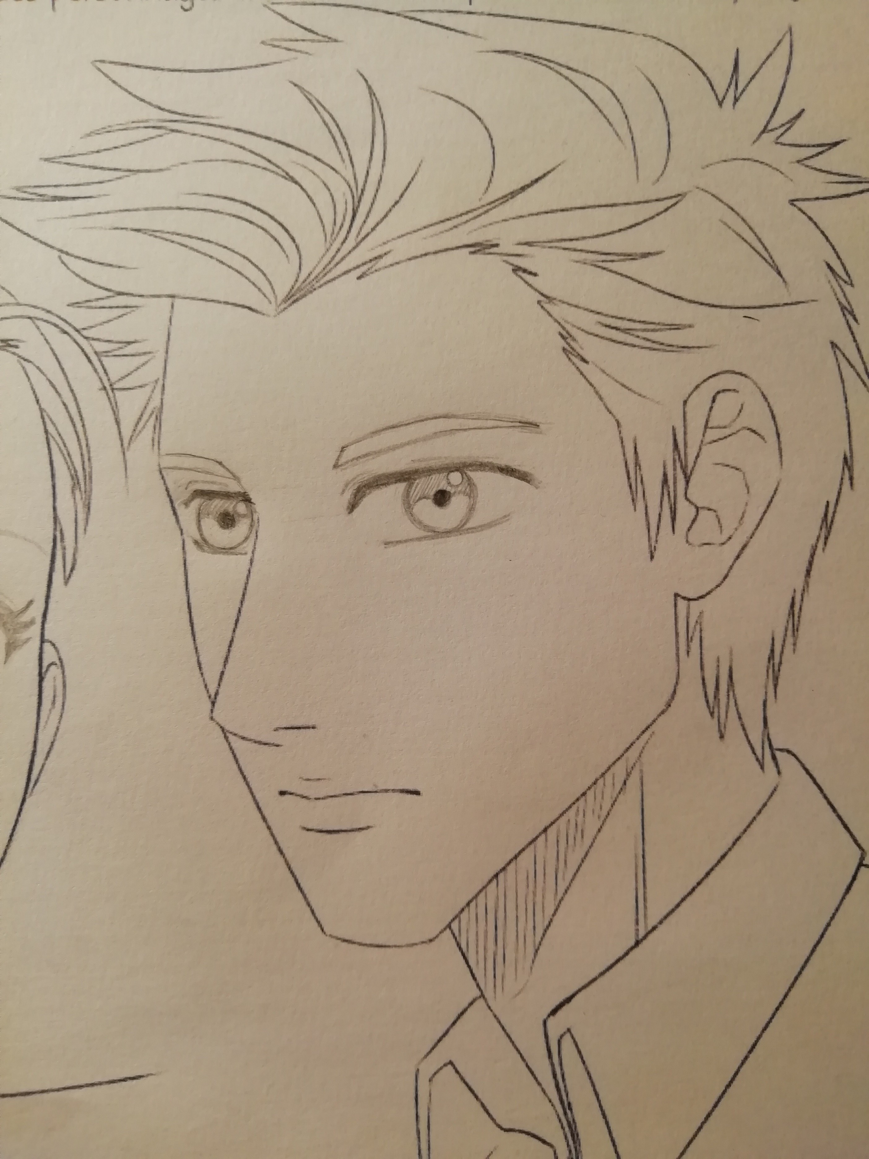 Pour l'homme, tu as bien placé les yeux en hauteur cette fois, mais tu as "coupé" l'oeil au bord du visage, comme s'il était plat. En général, en style manga, on triche et on s'arrange pour "comprimer" l'oeil en largeur pour qu'il ne coupe jamais le bord du visage :) L'autre oeil est simplement trop proche, il faut l'éloigner d'avantage, là il déborde littéralement sur le nez, tu peux compter au moins un demi-oeil entre tes deux yeux (c'est vraiment le minimum, tu peux écarter davantage si tu préfères ^^). Et quand je dis un demi-oeil de large pour l'écartement, j'entends par là que le début des cils commencent à partir de cet écart.
