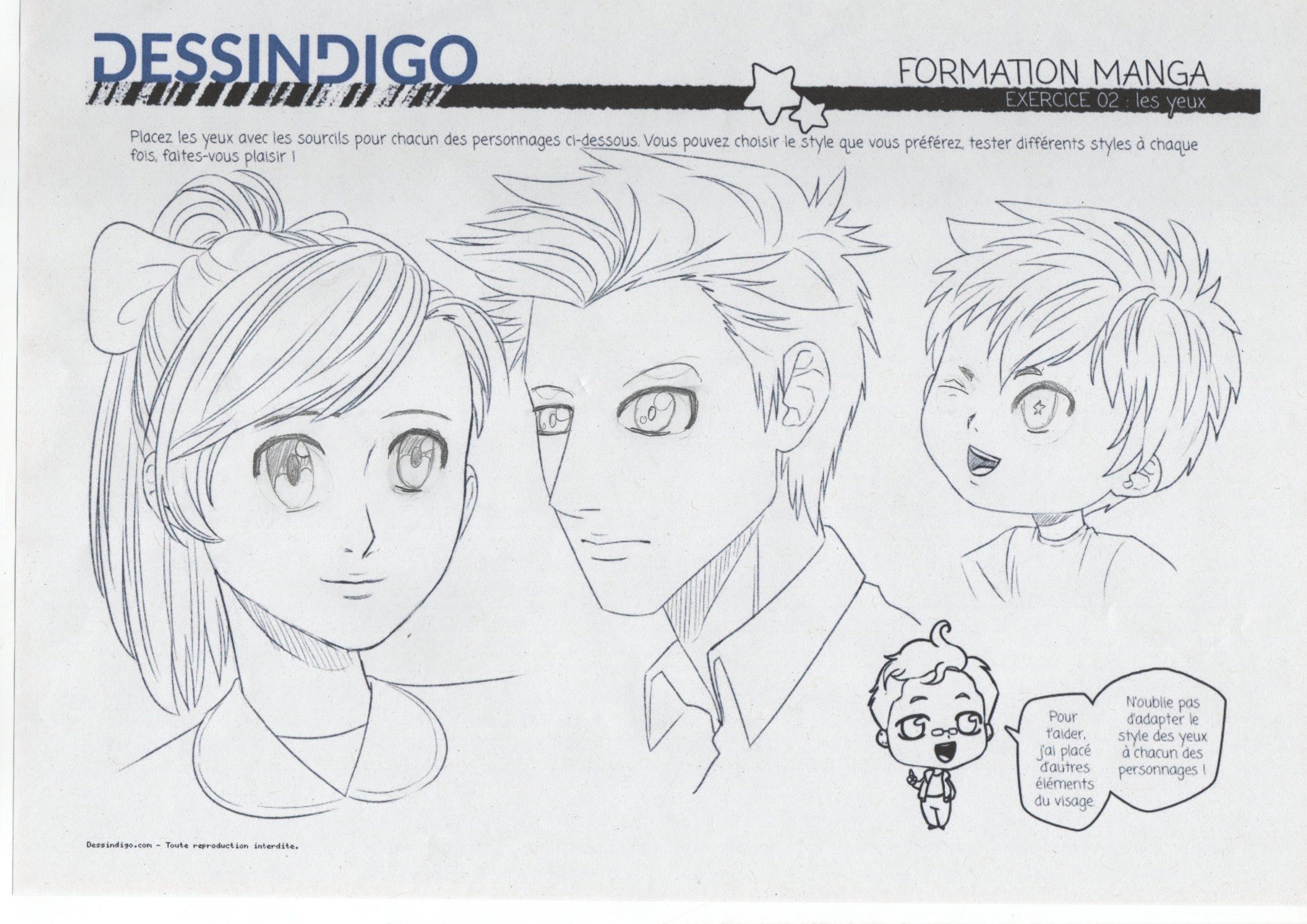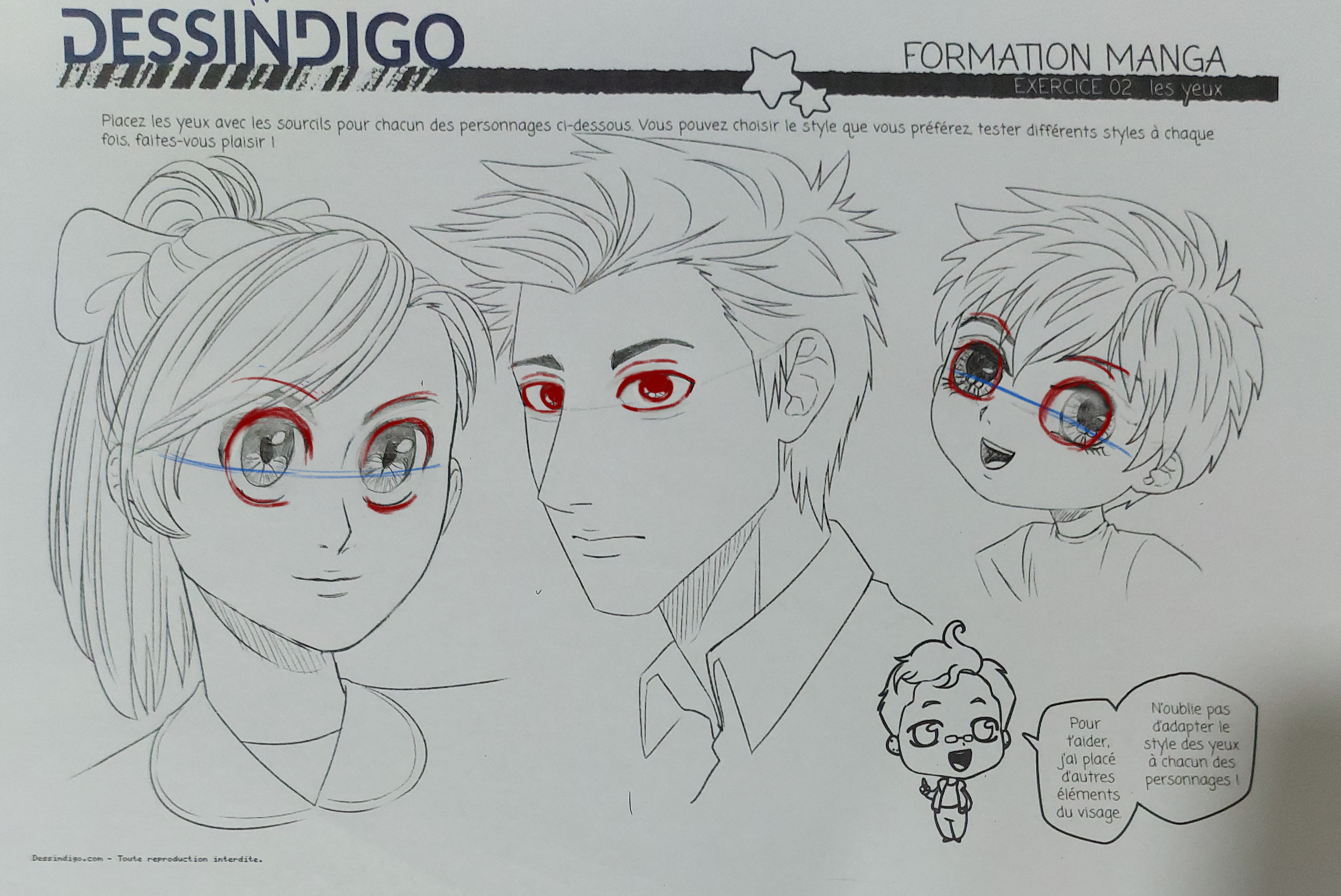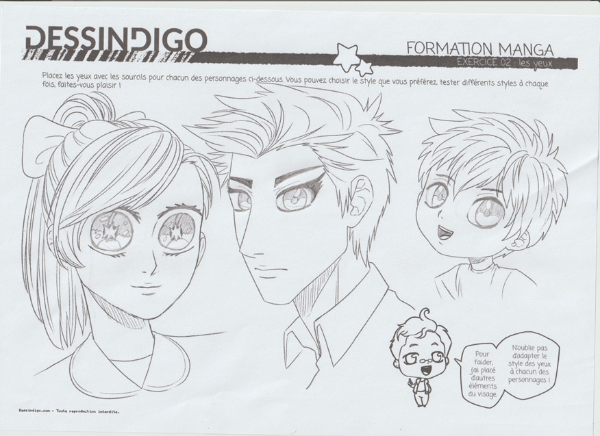 J'ai fait quelques petites corrections que tu pourras garder à l'esprit pour tes prochaines œuvres : Les yeux et les sourcils étaient trop proches les uns des autres. Je te recommande donc de leur donner plus d'espace. D'autre part, les sourcils du garçon étaient un peu trop courts ; ils sont presque toujours beaucoup plus longs que l'œil.