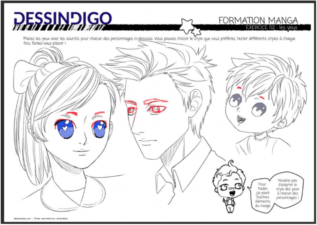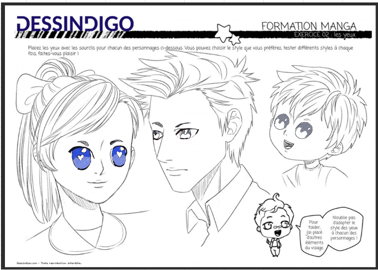 El brillante y los detalles que aplicaste a los ojos son muy "kawaii", ¡bien hecho! Hice algunas pequeñas correcciones que puede tener en cuenta para sus próximos trabajos: los ojos y las cejas estaban demasiado cerca ellas. Por lo tanto, le recomiendo que les dé más espacio. Por otro lado, las cejas del niño eran demasiado cortas; Casi siempre son mucho más largos que el ojo.