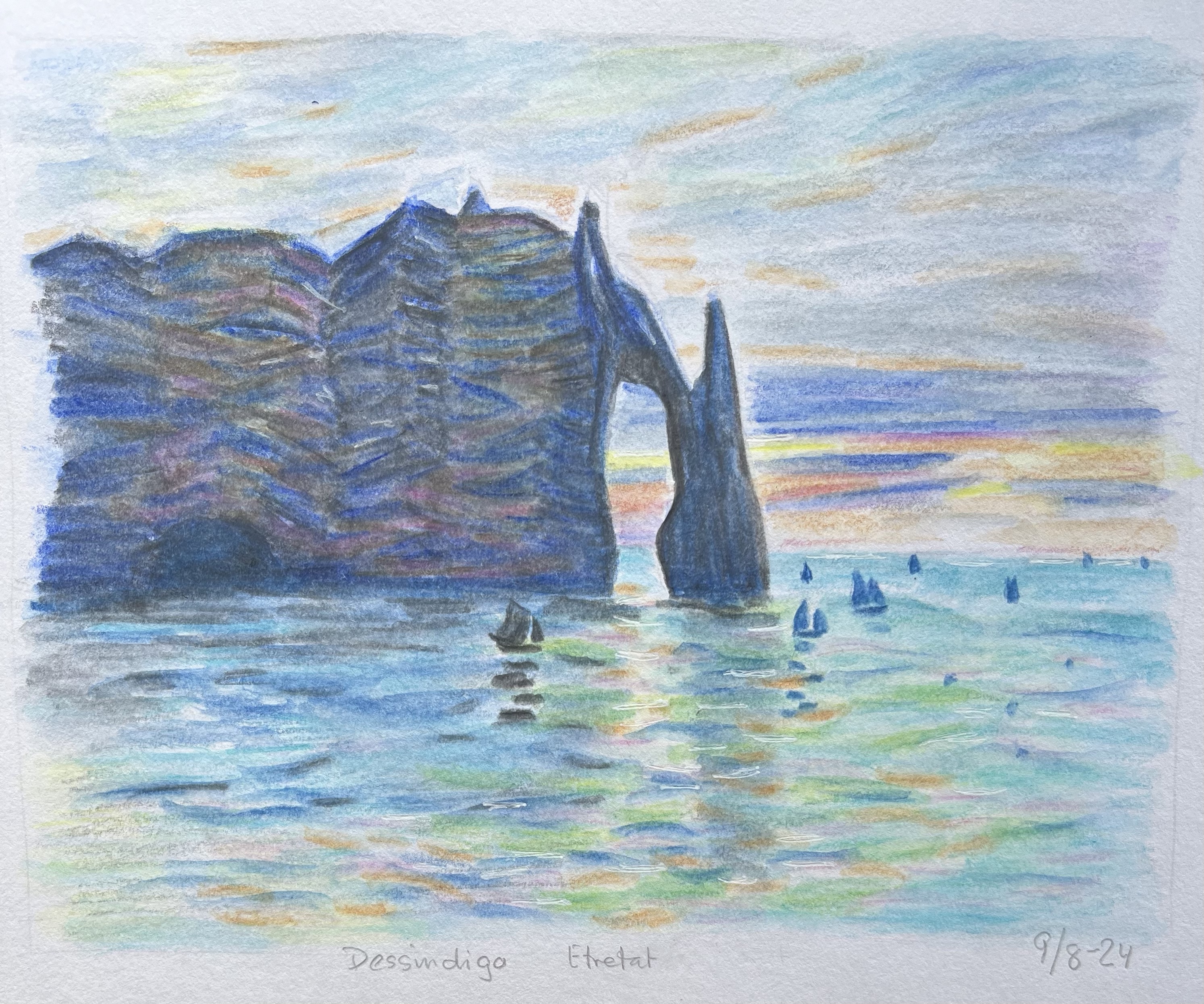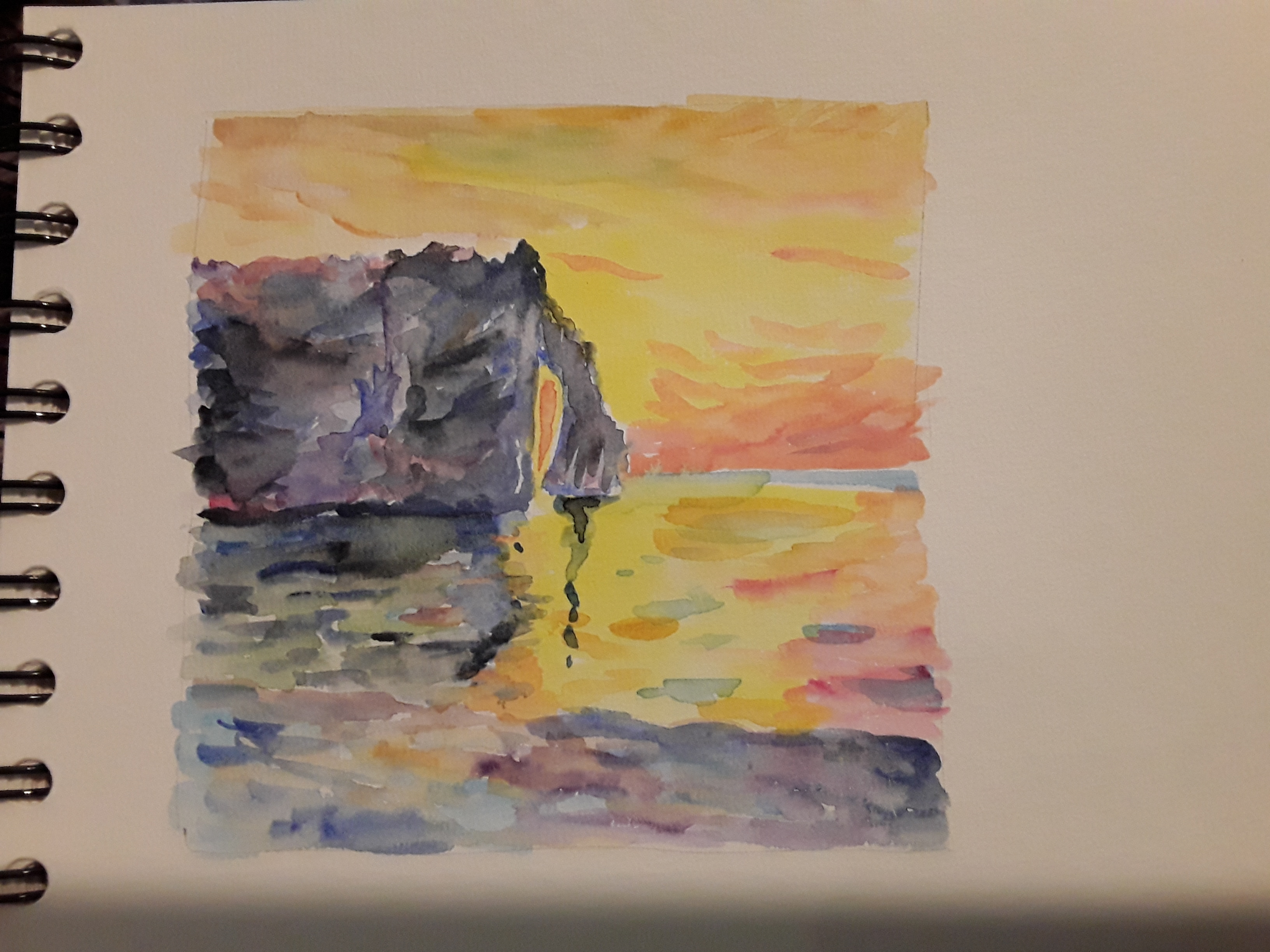 Bonne idée les crayons aquarelle. par endroit, notemment la falaise, je suis dérangée par certains traits au crayon qui aplatissent la roche.