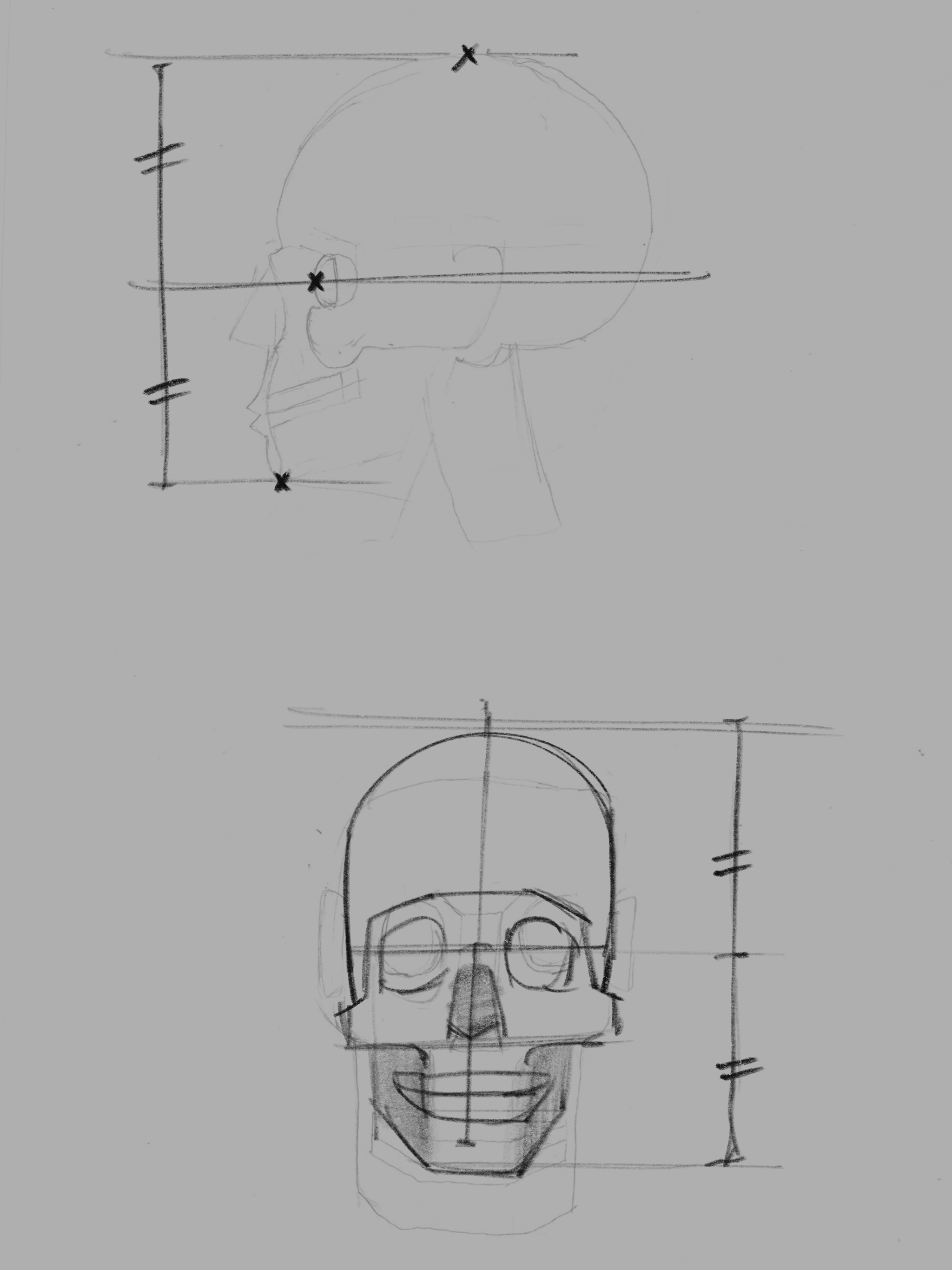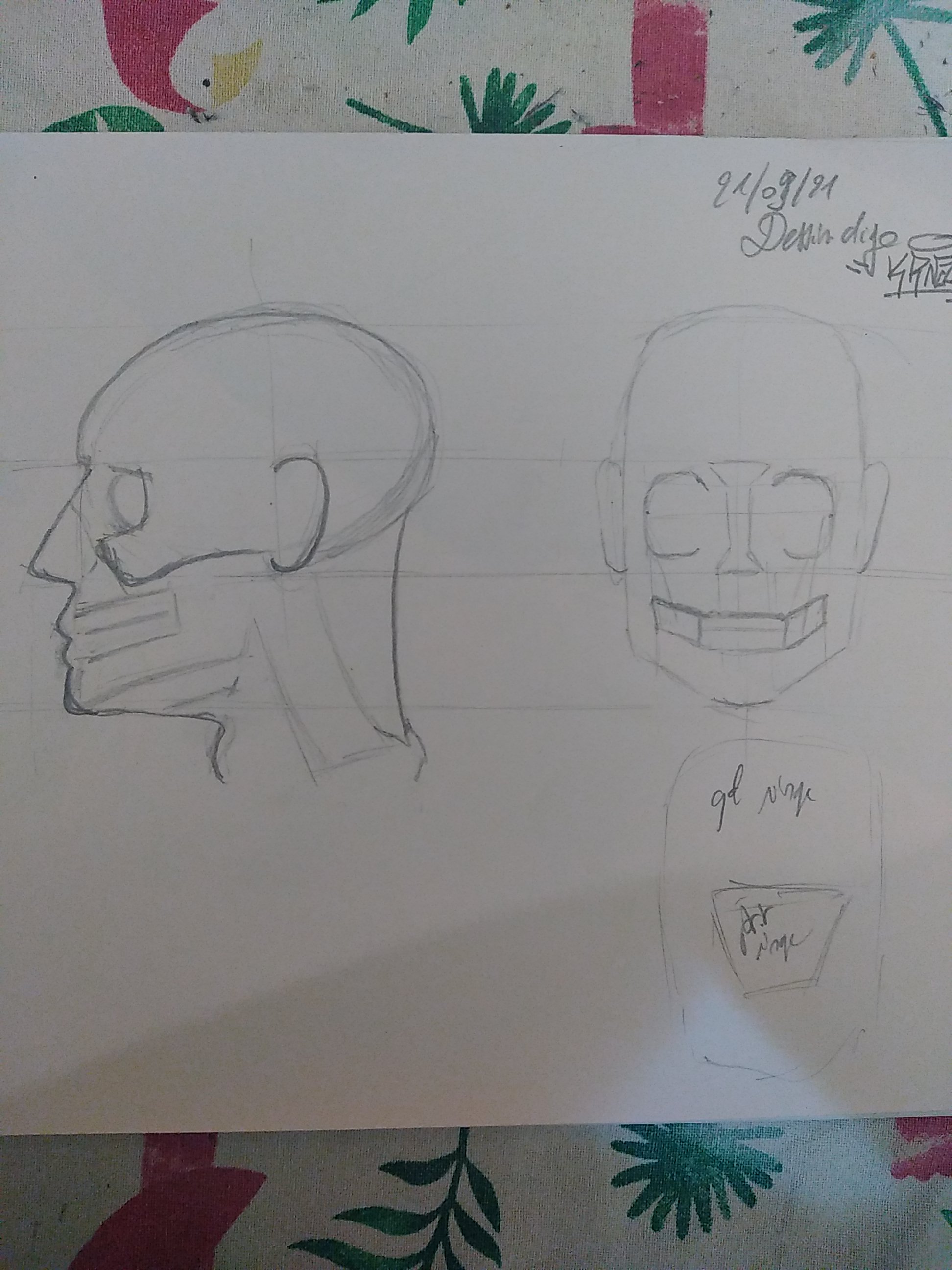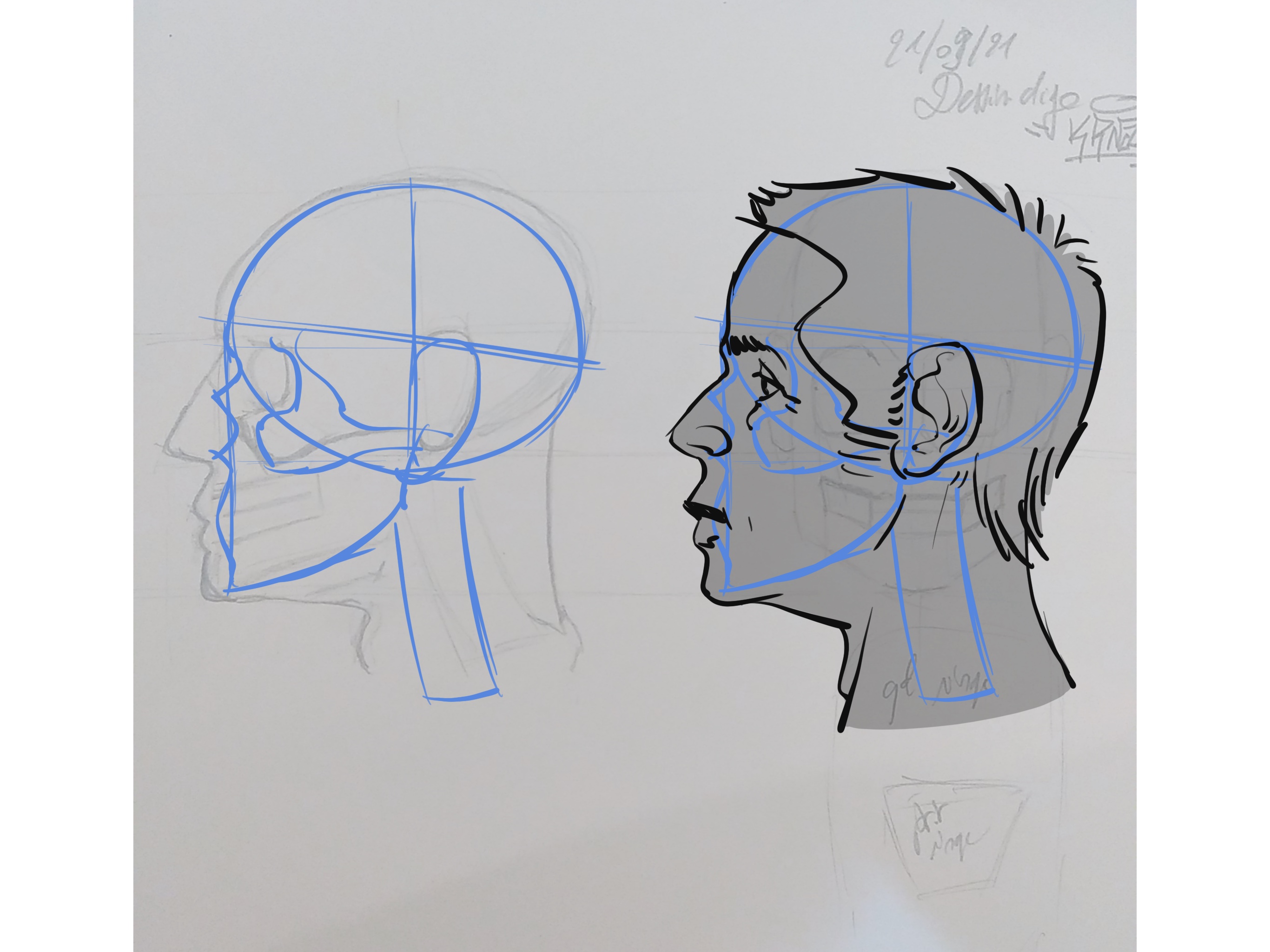 Celui de face est un peu trop carré et plat. Le crâne reste quand même assez bombé dans l'ensemble. Certaines personnes ont un crâne moins prononcé mais pas autant. Tu peux travailler sur des courbes plutôt que des droites. Vois si tu peux aussi repasser par quelques exercices de gestuelle pour bien travailler ton tracé et gagner en agilité :) Je te fais une proposition de correction en photo.