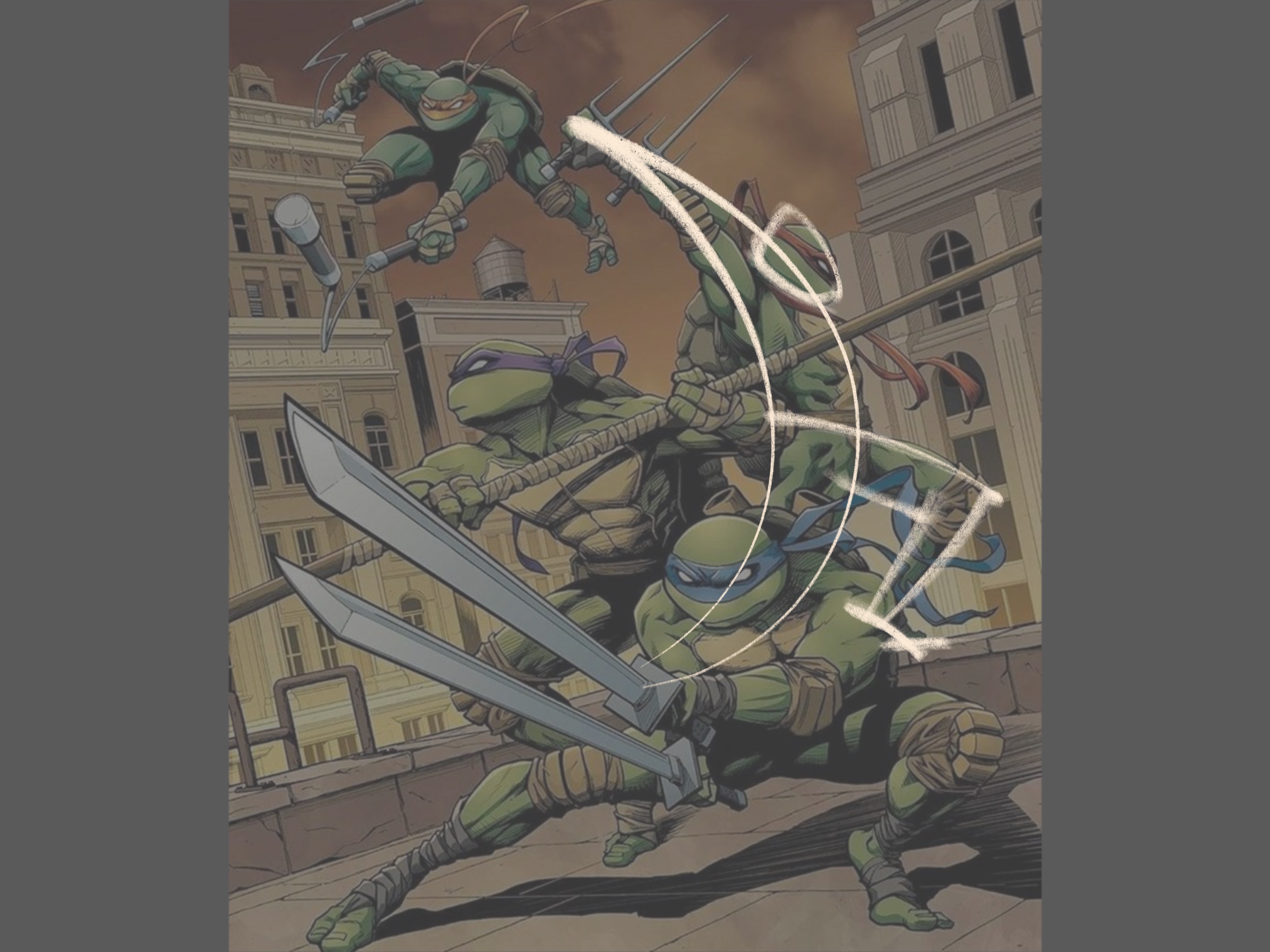 En relación con mi imagen que se encuentra en la red, no sé si tuve que dibujar las 4 tortugas que línea de acción poner excepto la de Raphaël (el rojo)