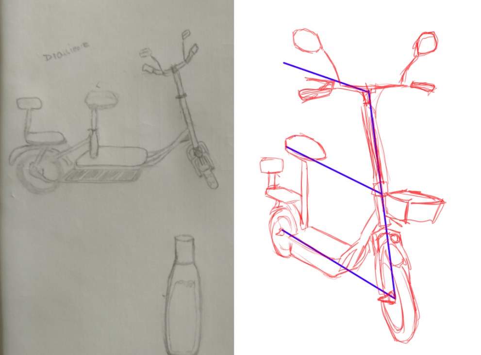 Par exemple, ta planche à roulettes a toutes ses parties, mais le guidon est resté un peu court, peut-être parce qu'il était trop haut sur la feuille et qu'il n'y avait pas assez d'espace pour le rallonger.