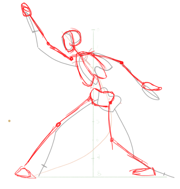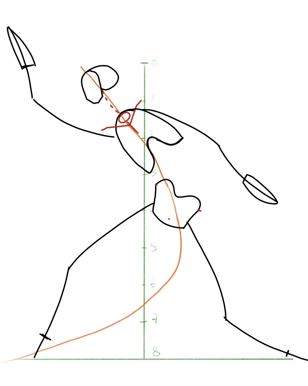 En effet, il y a quelques détails qui empêchent l'image de cohésionner complètement. Et tu avais raison, la partie supérieure était trop grande. N'oublie pas que la hanche (ou le bassin) occupe le quatrième segment, ce qui fait toute la différence. De plus, j'ai fait quelques ajustements de posture pour lui donner une touche plus naturelle et plus stable, car le pied qui touchait le sol n'était pas aligné avec le centre de gravité.